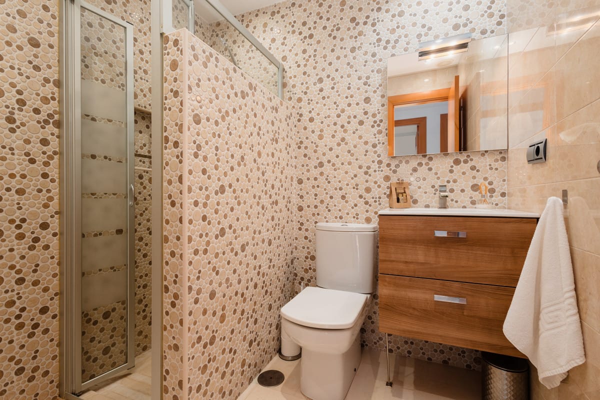 Finally, at your disposal you will find a nice bathroom, decorated with round tiles in different shades of brown, with a large shower and fully equipped with sink, toilet and clean towels.