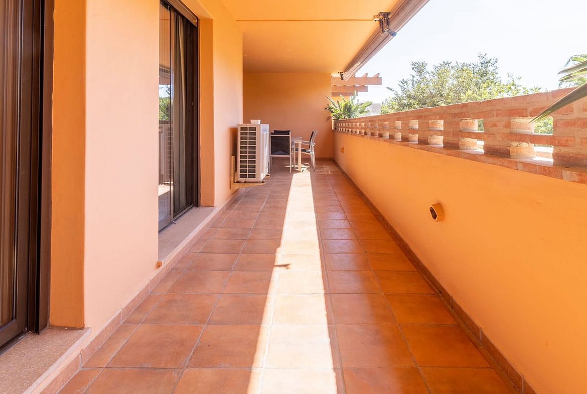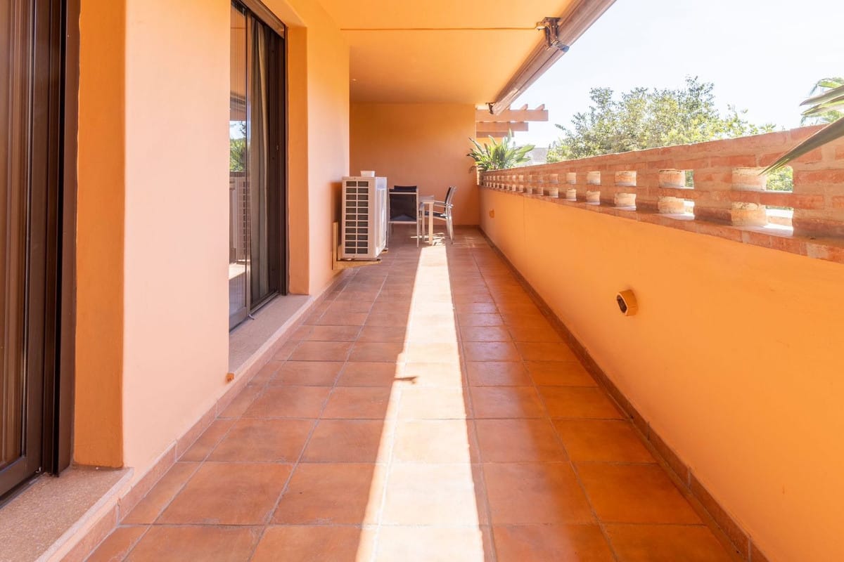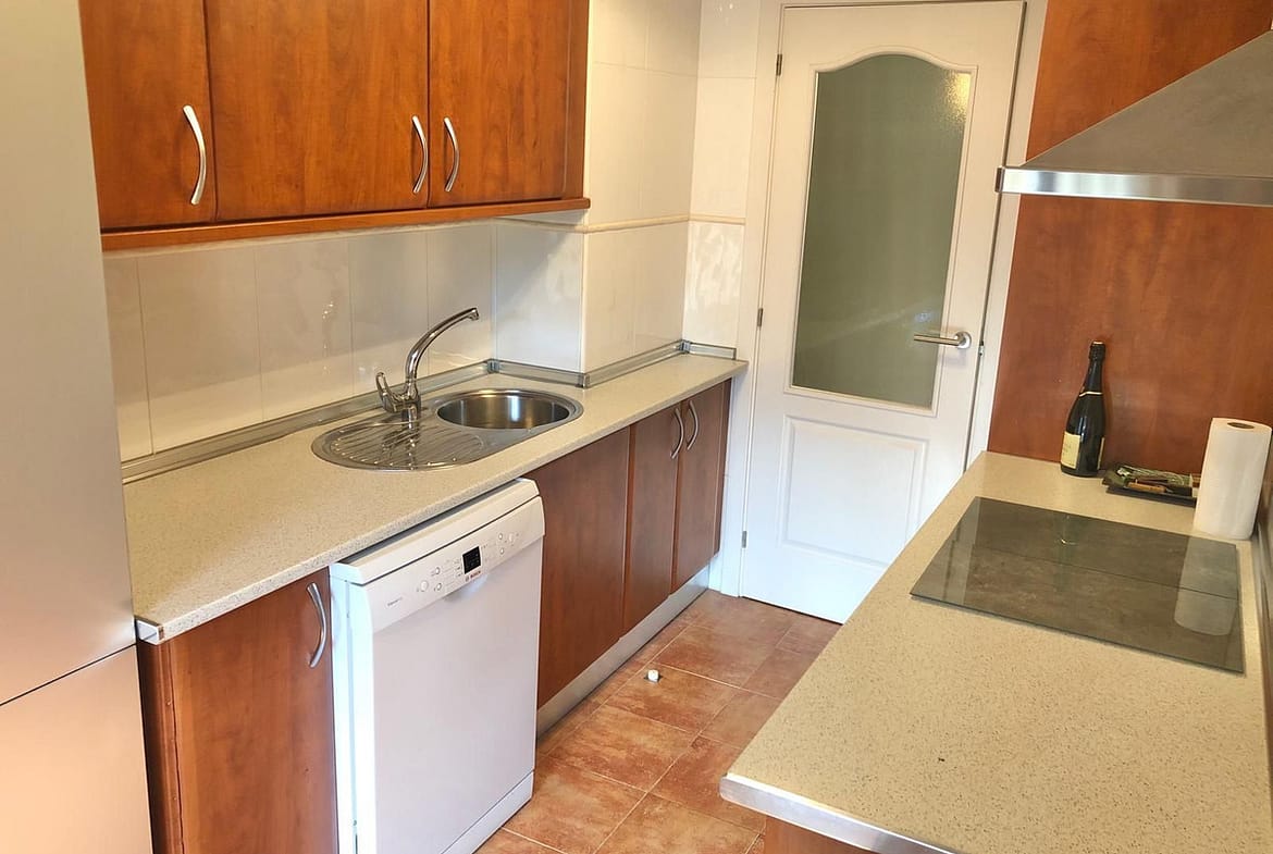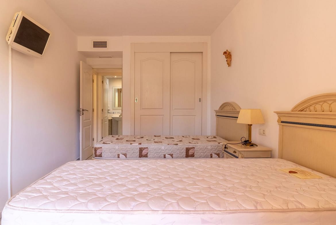 The kitchen comes fully equipped, while the entrance hall includes an additional fitted wardrobe to maximise storage space. The highlight, however, is the generous terrace, where you can unwind while overlooking the pool and soaking up the sunshine. The property enjoys excellent natural light throughout, complemented by electric awnings so you can adjust it to your preference.
