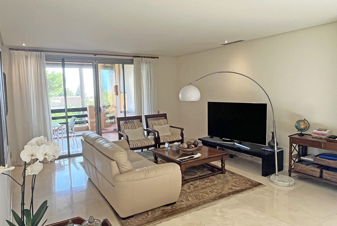 Located within the prestigious gated community Mansion Club, this elegant 2-bedroom, 2-bathroom apartment stands out as one of the finest residential offerings in the area. With a built area of 165 m² and a 41 m² south-facing terrace, it offers generous living spaces, natural light, and complete privacy. The terrace is fitted with glass curtains, allowing you to enjoy it year-round while taking in the lush tropical gardens and partial sea views.
