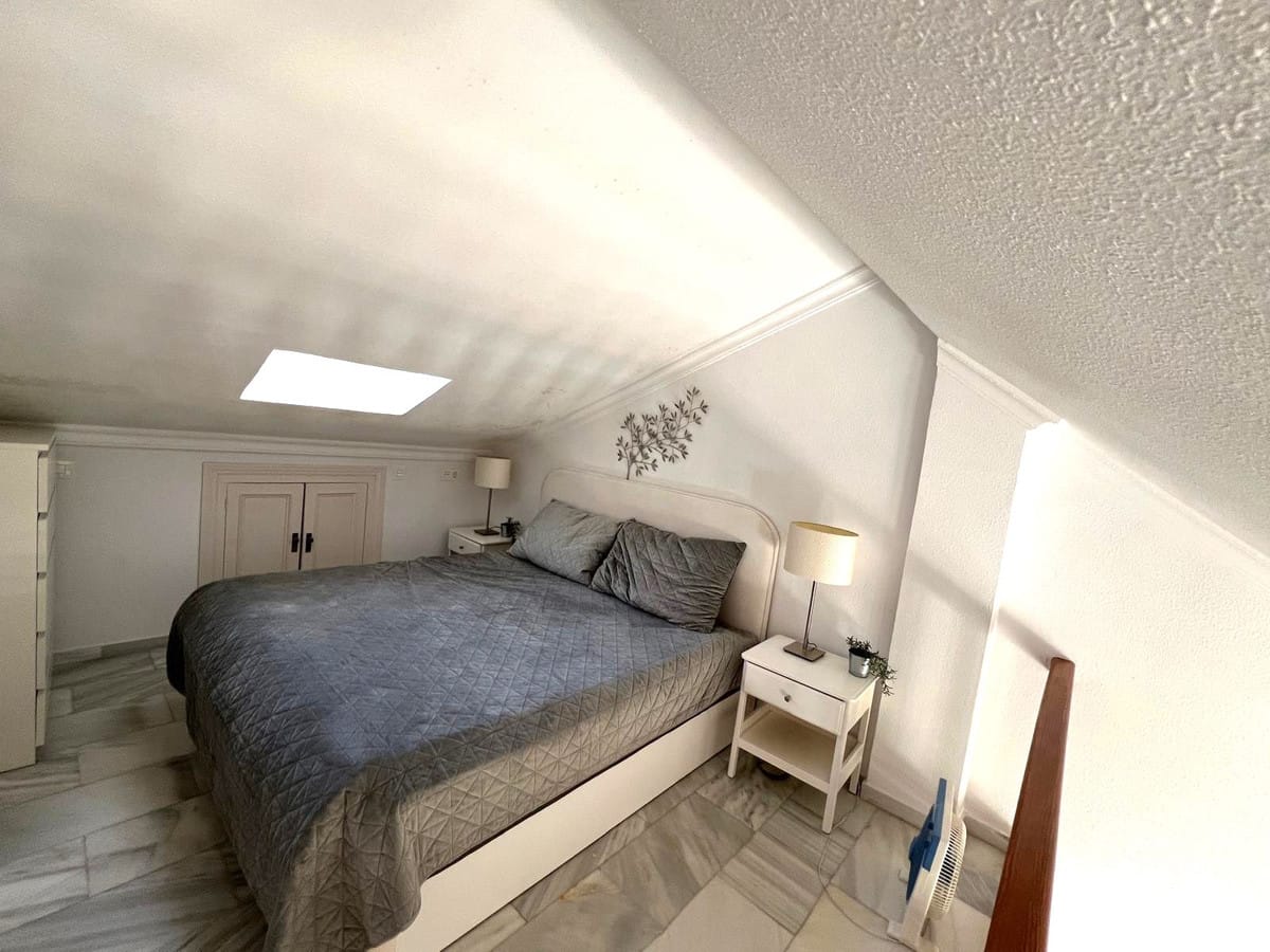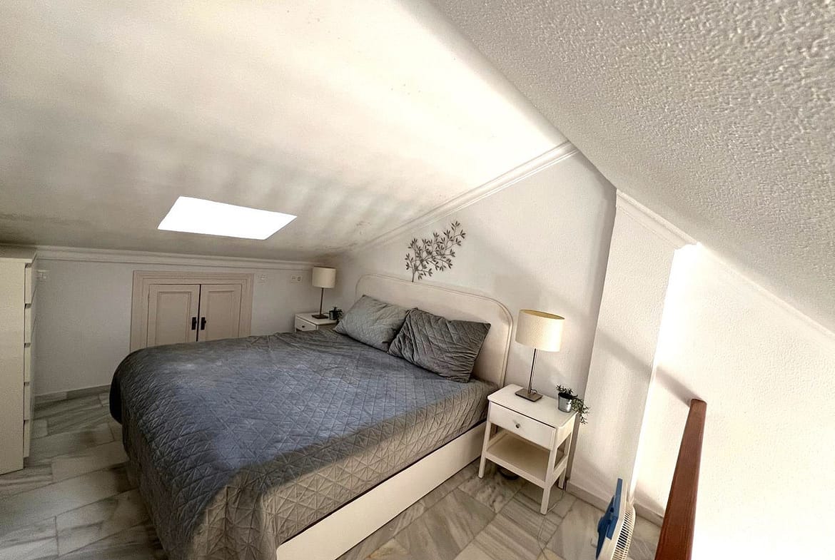 The property is distributed over two levels and has been recently refurbished to high standards. The main floor features a bright, double-height living-dining area with a sleek open-plan kitchen, one bedroom, and a full bathroom. The upper level offers a charming attic-style second bedroom and an additional bathroom.