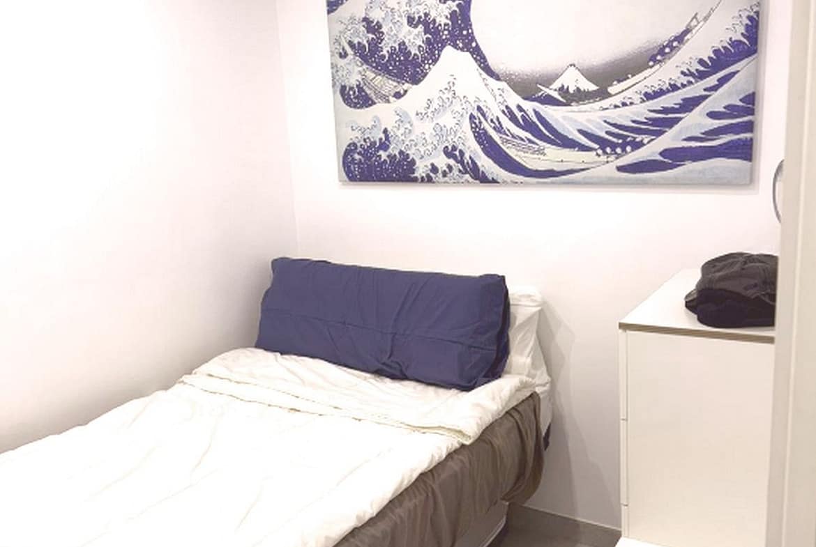 It features two bedrooms with built-in wardrobes and a modern, fully equipped bathroom with a shower.