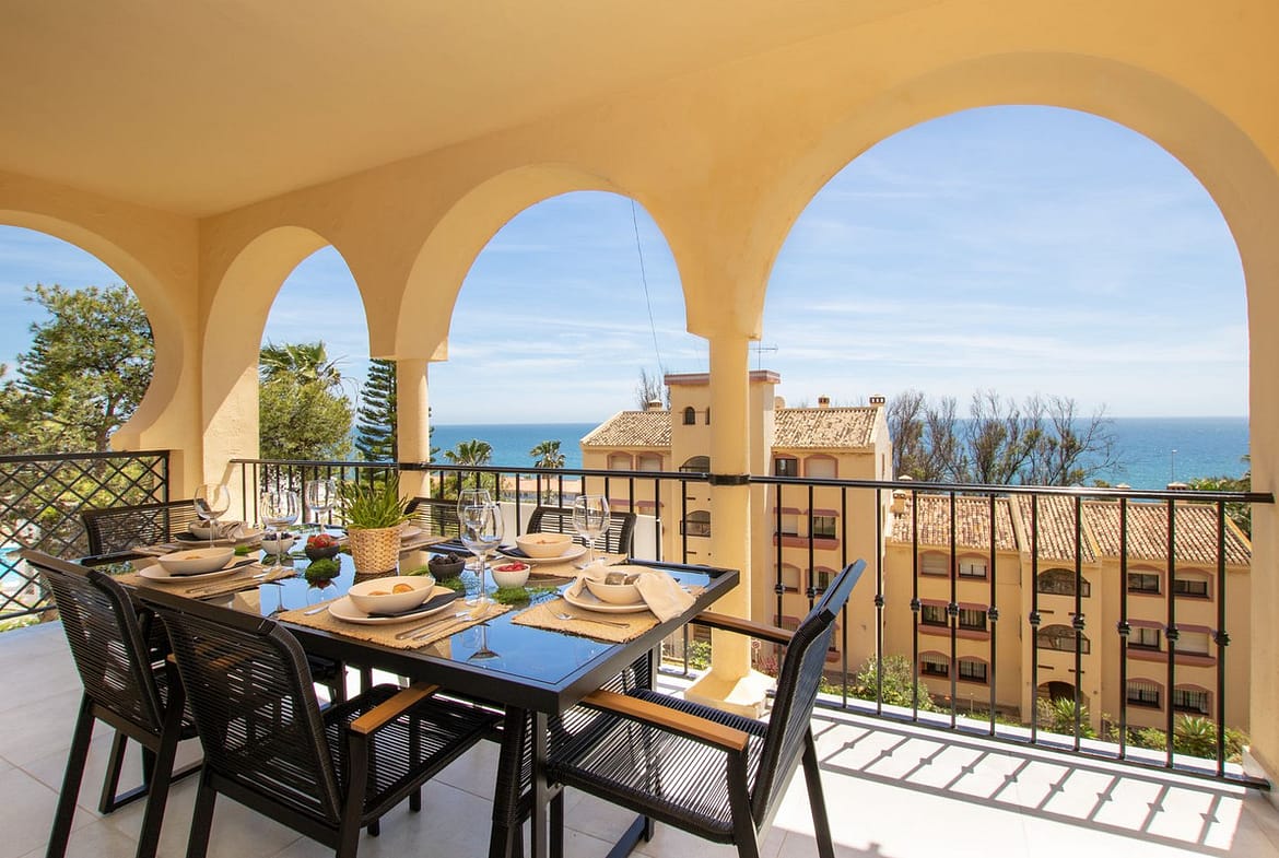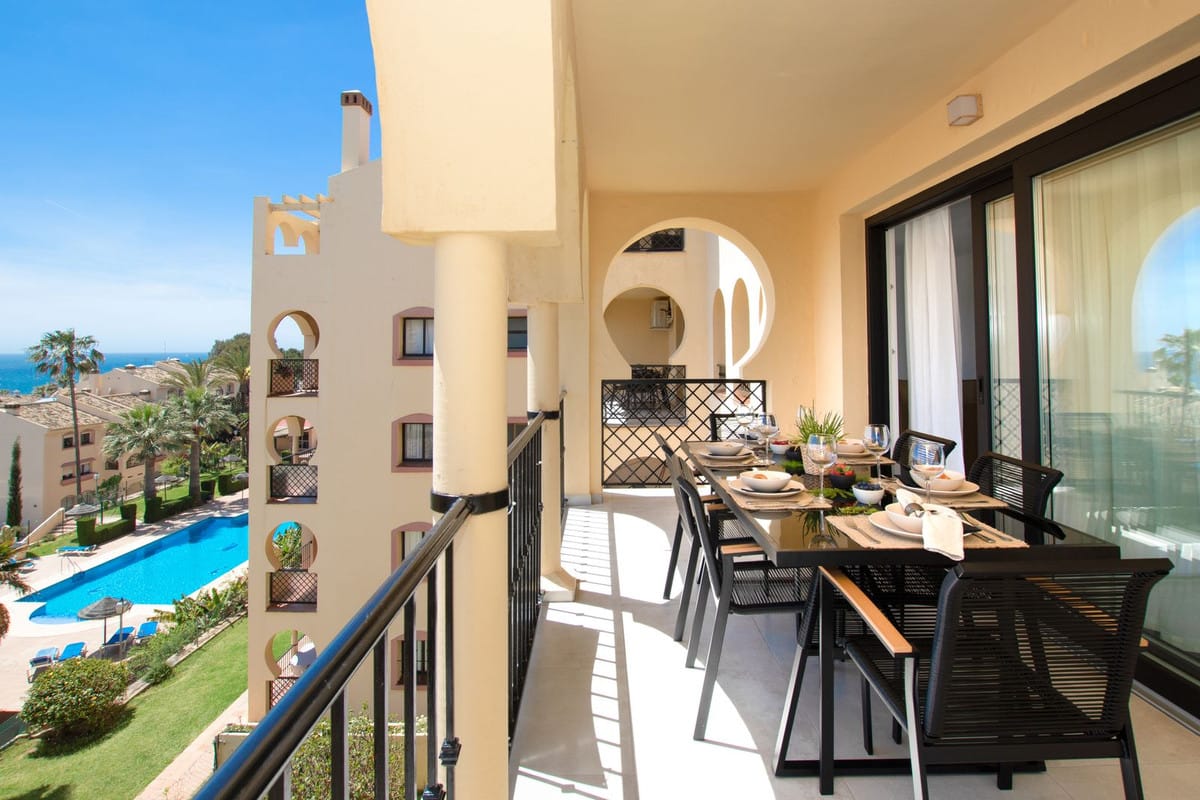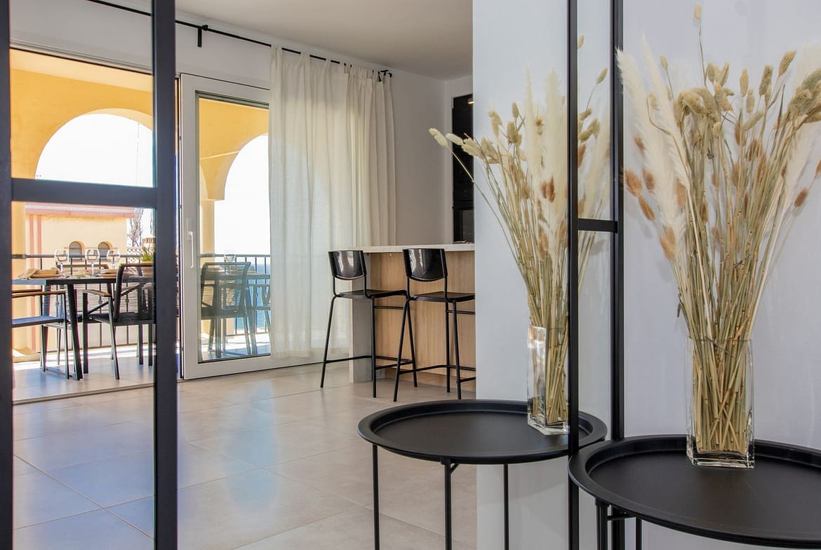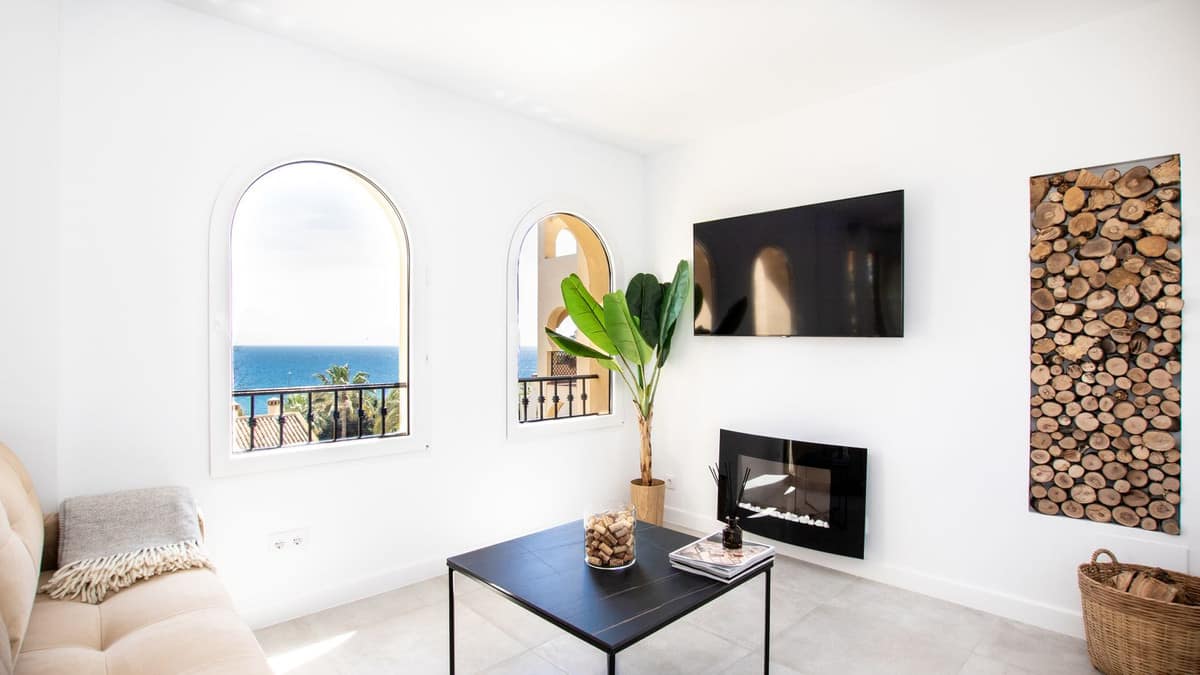 Stunning new property on the market, located in Torrenueva Mijas Costa, 5 min walking distance from La Cala de Mijas city and only a 1-2 minutes walk through the community and through the private communal tunel to reach the beach. This amazing unit, has a bright and light scandianvian style decoration and comes with 2 exterior bedrooms and 2 full bathrooms, open plan and fully equipped kitchen with a large island and many many windows in the living room and the kitchen for amazing sea views from all the corners of the property. The kitchen has a washing and drying machine, dishwasher, microwave, fridge, oven, hob, toaster and full set of cutlery and crockery. From the terrace except from the sea views, you can spot Torrenueva’s tower and large communal pool. This property is completely new, 100% refurbished by our team and it is now available for rentals. In the bathrooms there are modern walk-in showers, and suspended toilets of modern minimalistic design. The living room is spacious and bright and on the sofa bed can sleep 2. There is an electrical chimney and smart TV and of course unlimited internet. In the summer months it is available for vacational rental and in the winter months it can be as well rented for a few months, with a monthly price of 2800 Eur per month from October until March. Contact us for more information regarding this unit in lower Torrenueva, Mijas Costa. This community has a private exit to the beach, just next to the restaurant el Oceano that is frontline beach, and once on the beach you can walk 5 minutes to the center of La Cala de Mijas city with so many amenities. In Torrenueva, as well walking distance from the apartment, at the bottom end of the same street there are a few bars, restaurants and a supermarket. We speak more than 10 languages, contact us for more information on this unit, in the same community just next door we have another newly refurbished unit with max capacity of 6 people sleeping as well so if you are a large group of friends and / por family you can be door to door for extra comfortable vacations.
