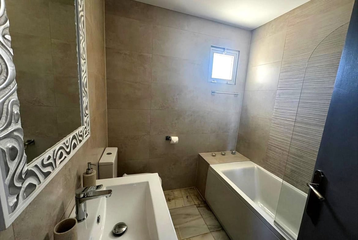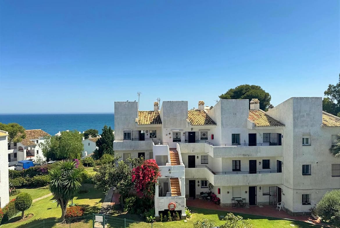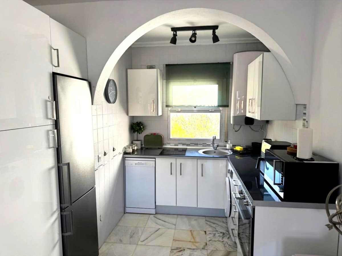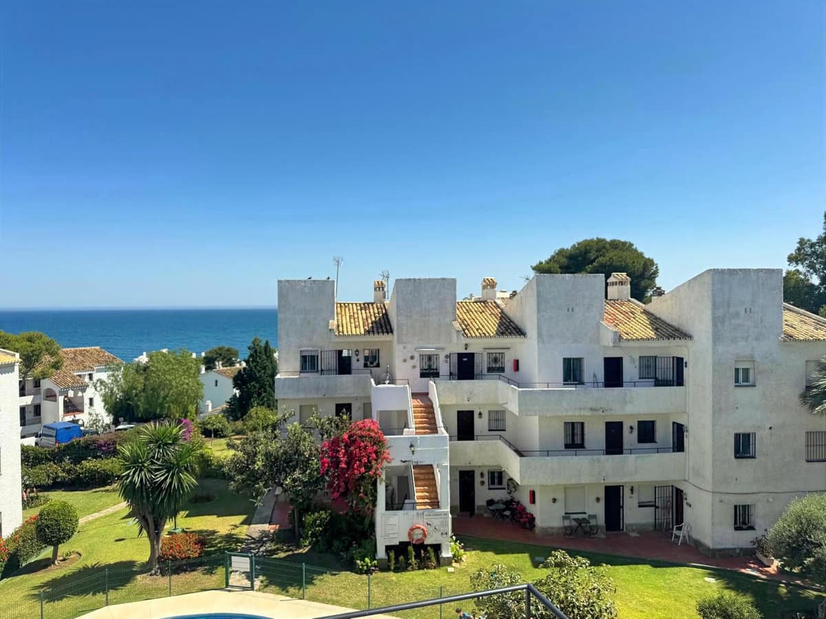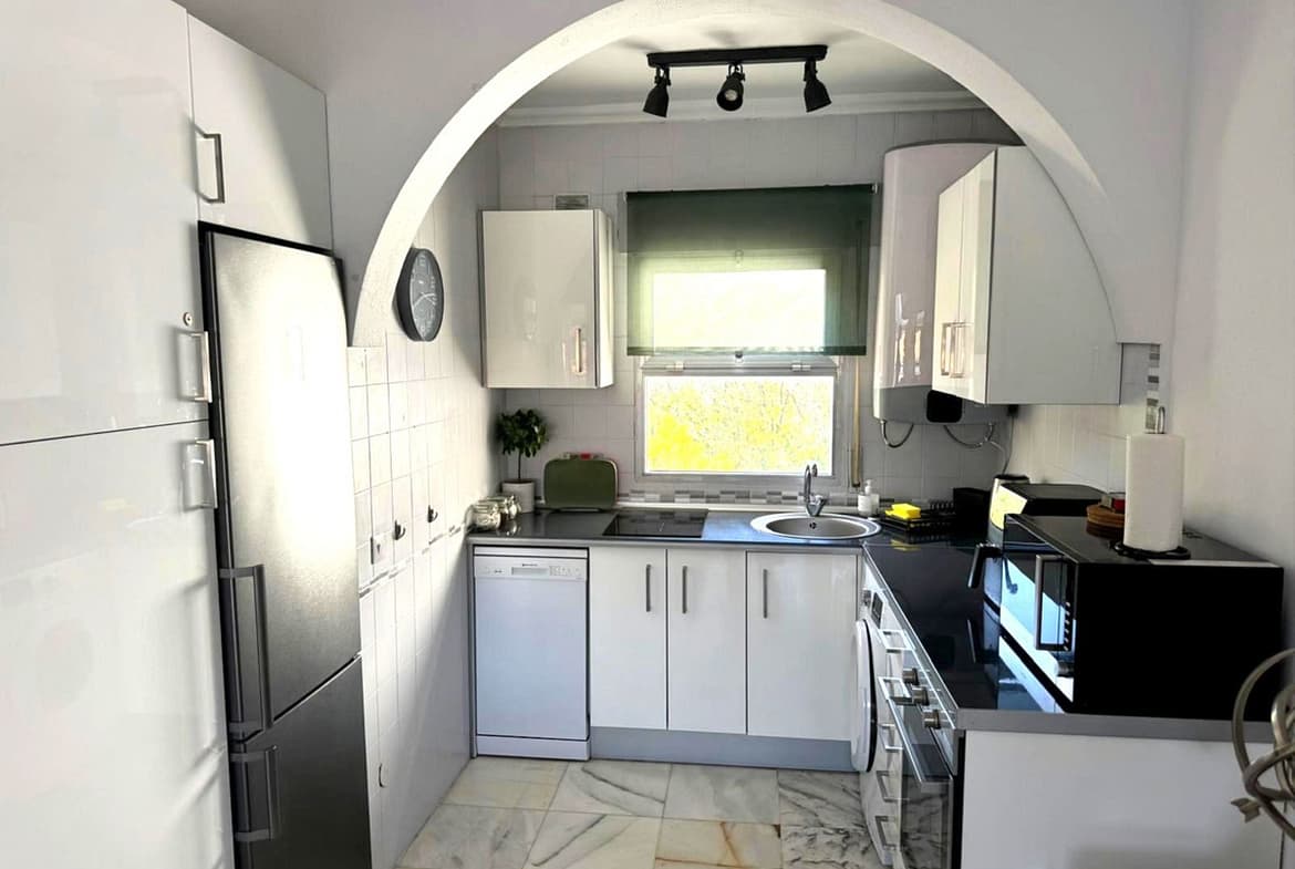 The property is presented in good condition and features marble flooring throughout, fitted wardrobes, fibre optic internet, and a fully fitted kitchen. From the living area, enjoy pleasant views over the communal gardens and out towards the sea. The beautiful communal pool area provides a tranquil setting to relax and unwind.