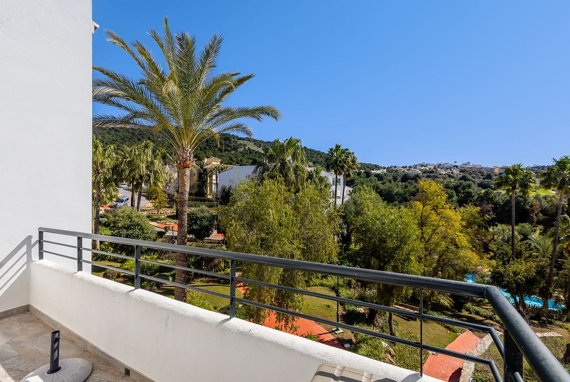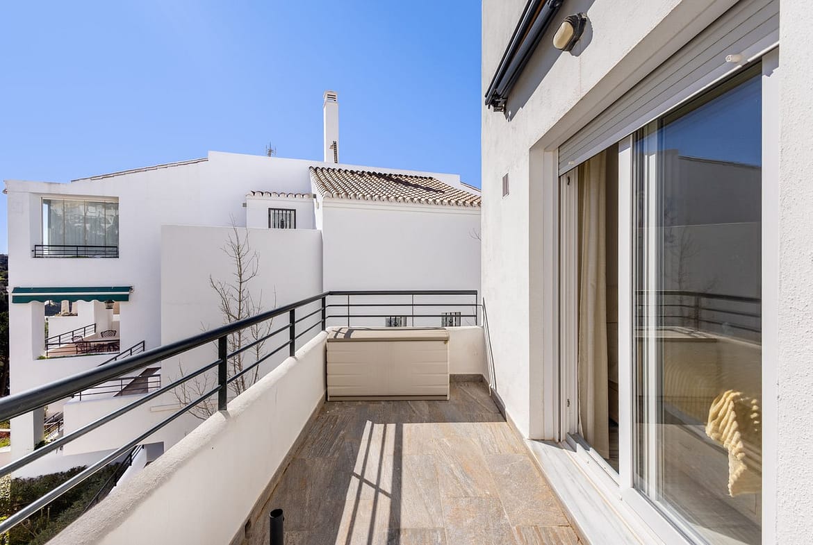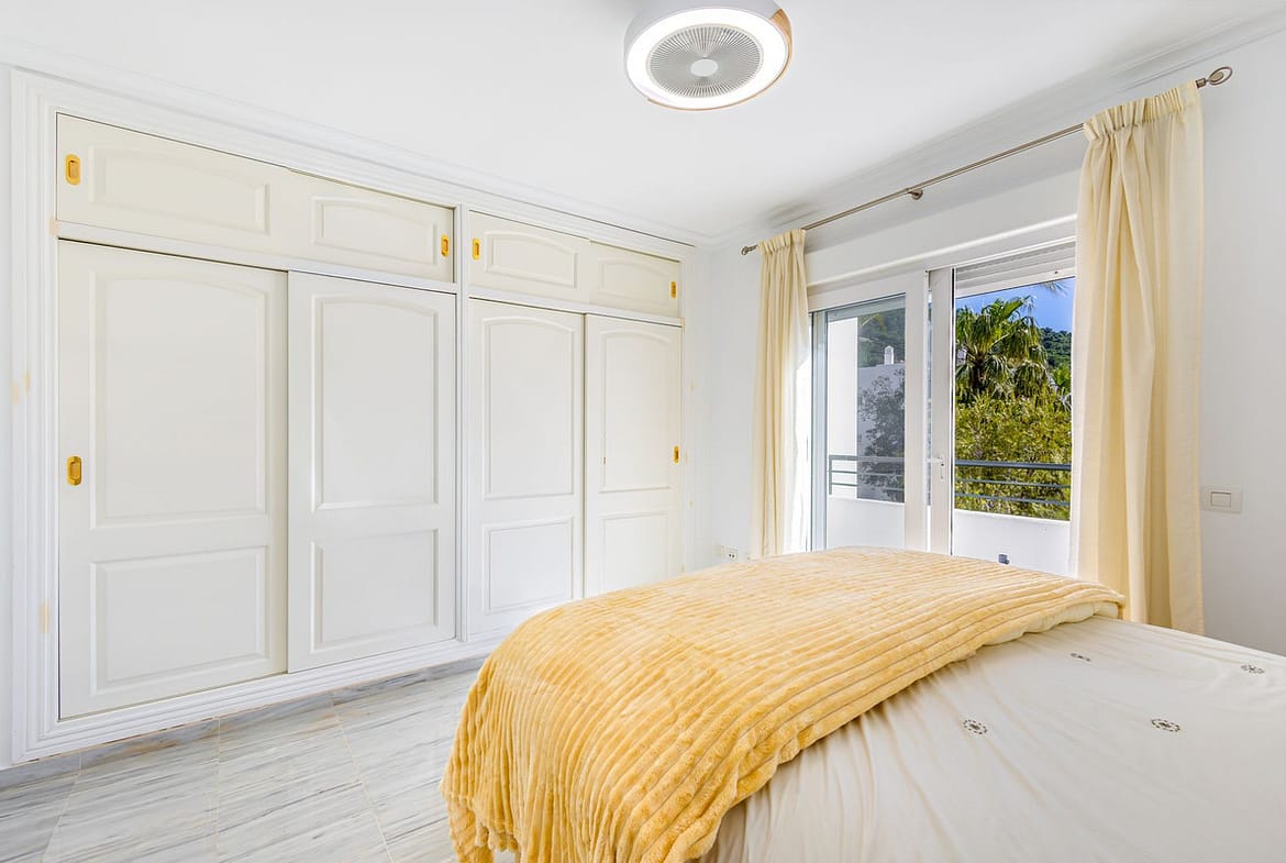 The attractive staircase leads to the two upper floors. The middle floor is where you will find a rather large, primary bedroom with newly reformed ensuite. The primary bedroom boasts a useful and sizeable private terrace with far-reaching views of the golf course. Additionally, there is a generous family bathroom and second bedroom, also with a terrace, this time with mountain views.
