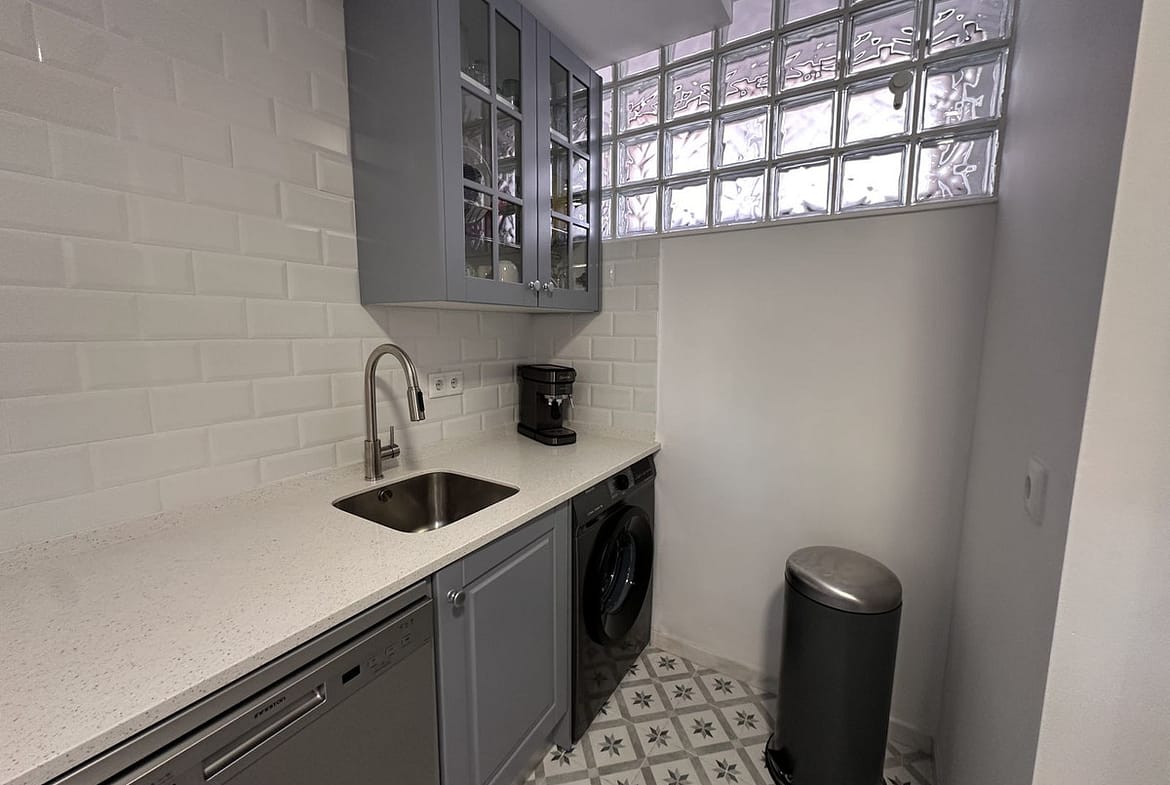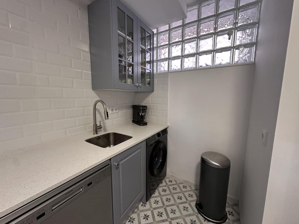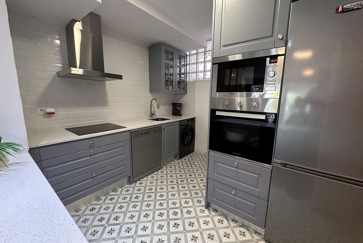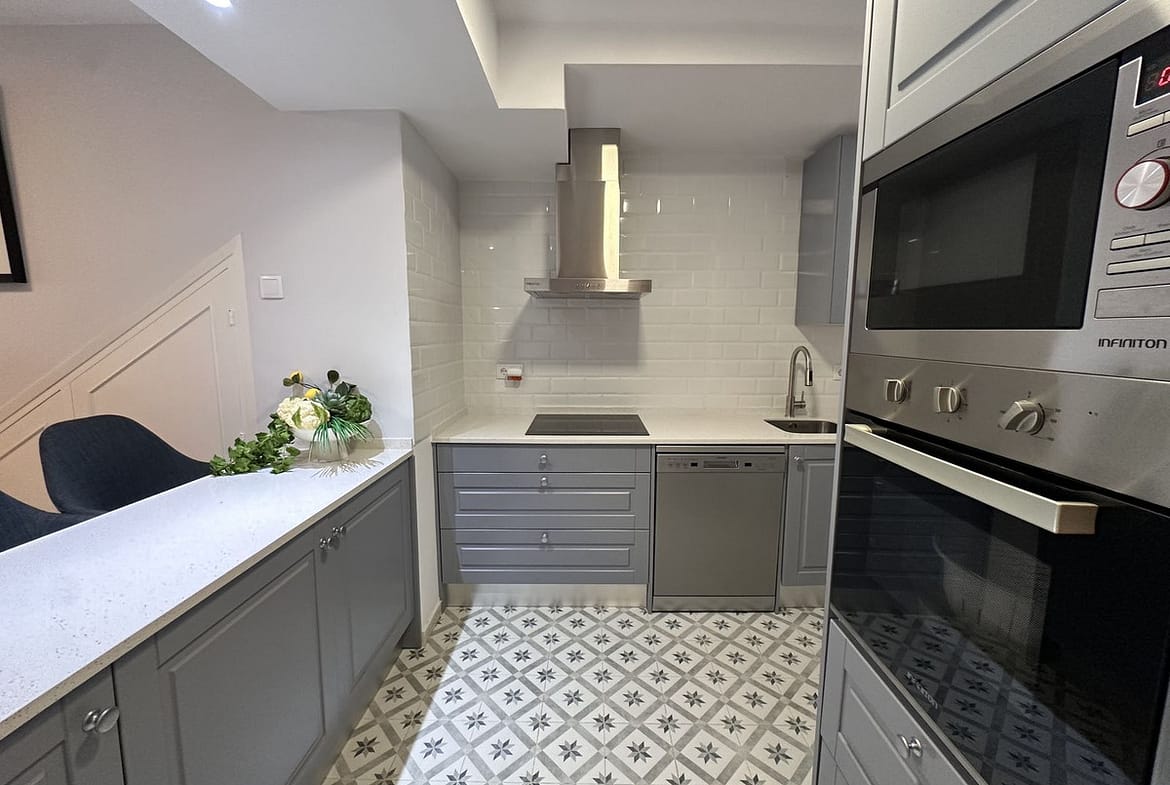 The modern open-plan kitchen has been completely renovated with a contemporary design and high-quality finishes, ready to move in.