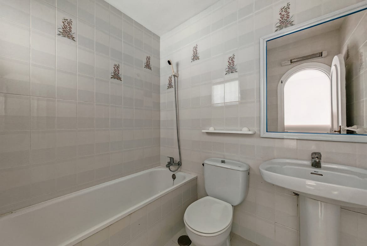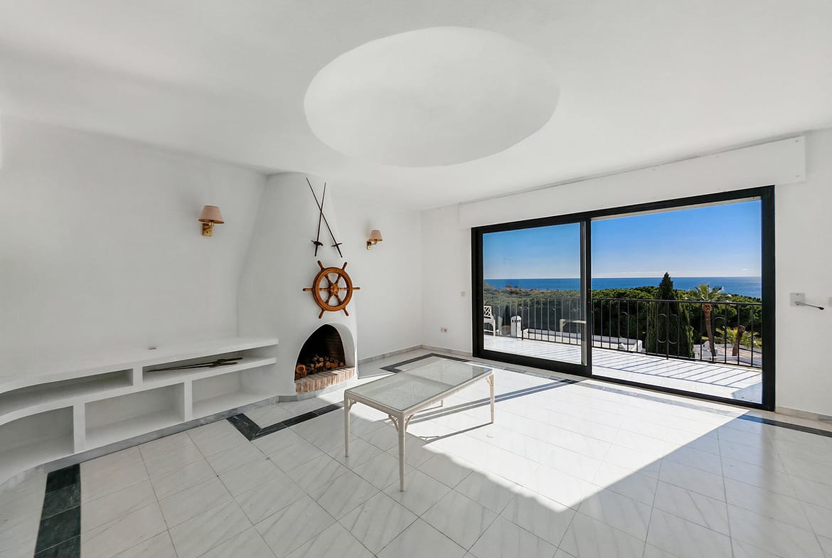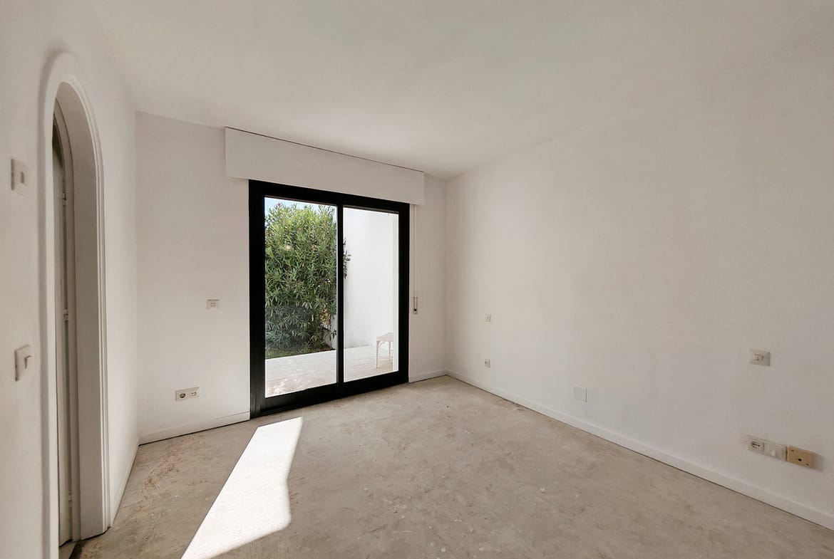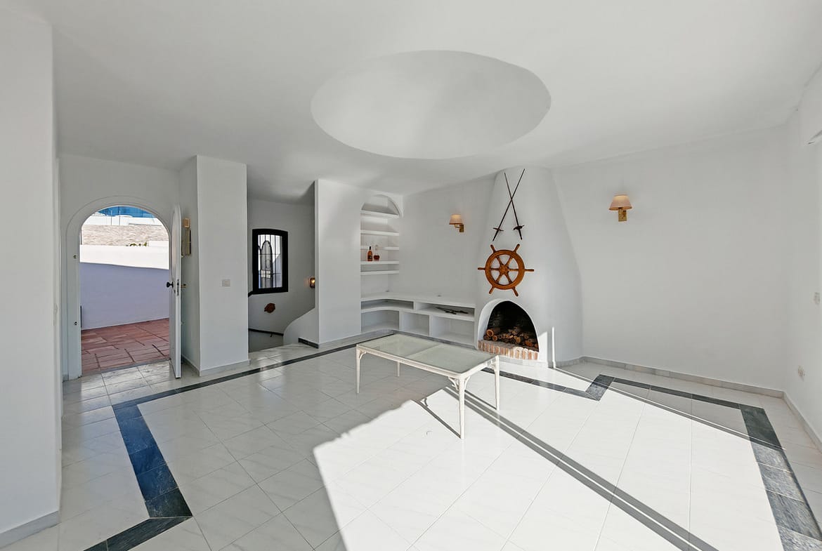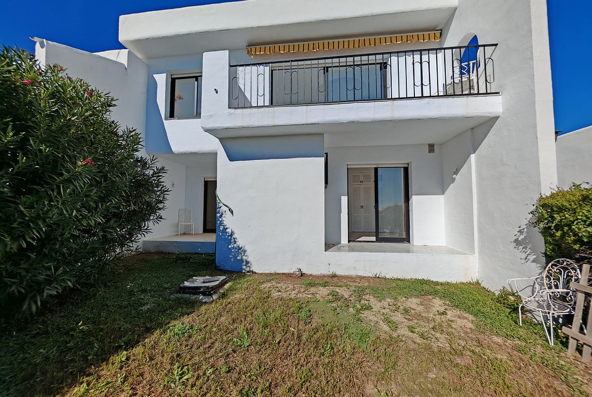 Town House for sale in Cabopino, Marbella with 2 bedrooms, 2 bathrooms, 2 en suite bathrooms and 1 toilet, with communal swimming pool and private garden. Regarding property dimensions, it has 123 m² built, 175 m² plot and 30 m² terrace. Has the following facilities amenities near, air conditioning, fireplace, guest toilet, private terrace, sea view, covered terrace, panoramic view, unfurnished, close to sea / beach, close to golf, uncovered terrace, glass doors, balcony, renovation needed and close to shops.