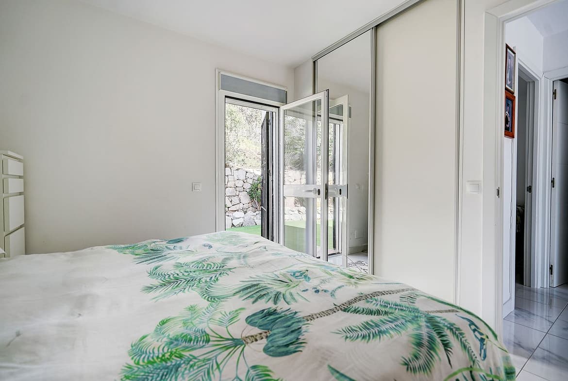 The interior layout is bright and modern. The lounge and dining area has large windows that bring in natural light and look out toward the sea, along with an electric fireplace for cooler months. The modern kitchen comes fully fitted with appliances and features a serving window that opens directly onto the terrace, which is especially useful when dining outside. There are two double bedrooms with hot and cold air conditioning, plus a full bathroom with a bathtub. All windows are double glazed and fitted with mosquito nets.