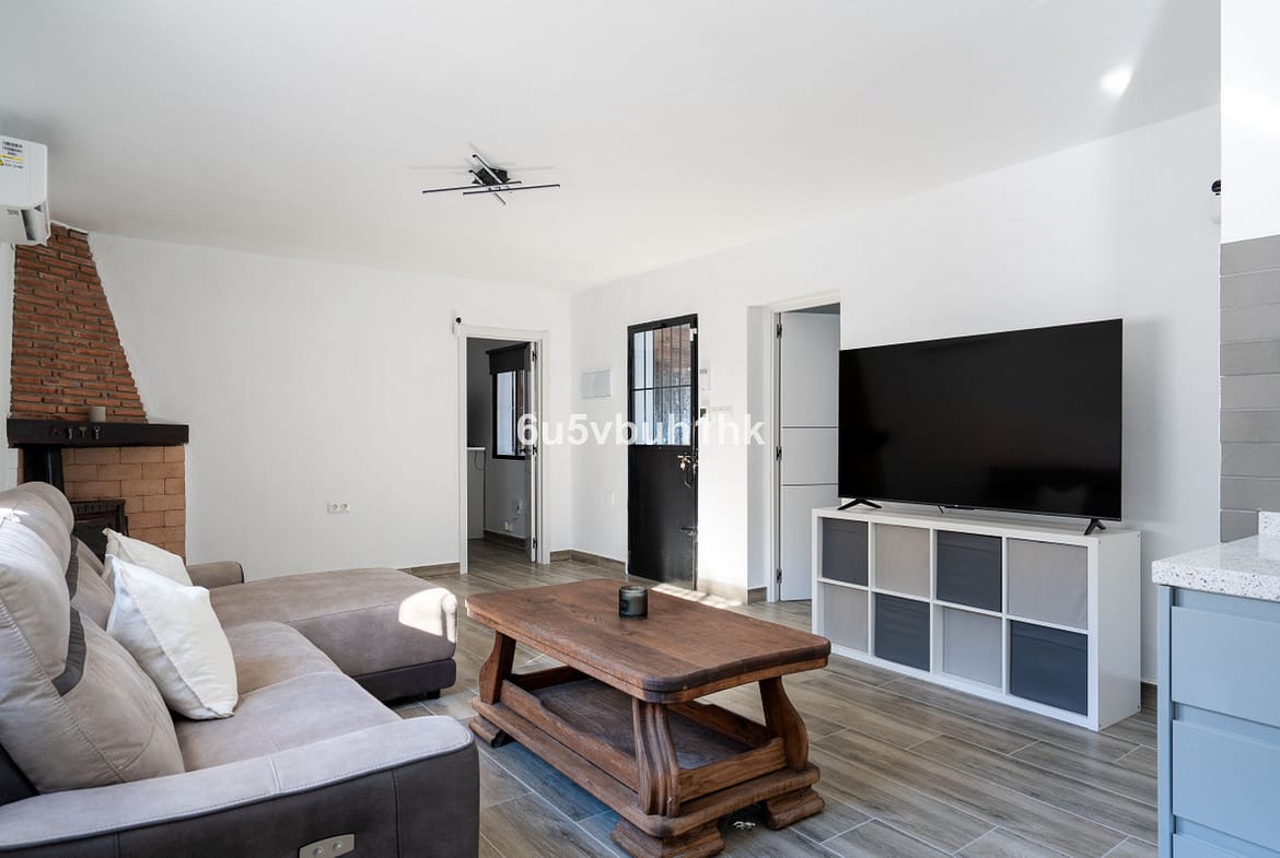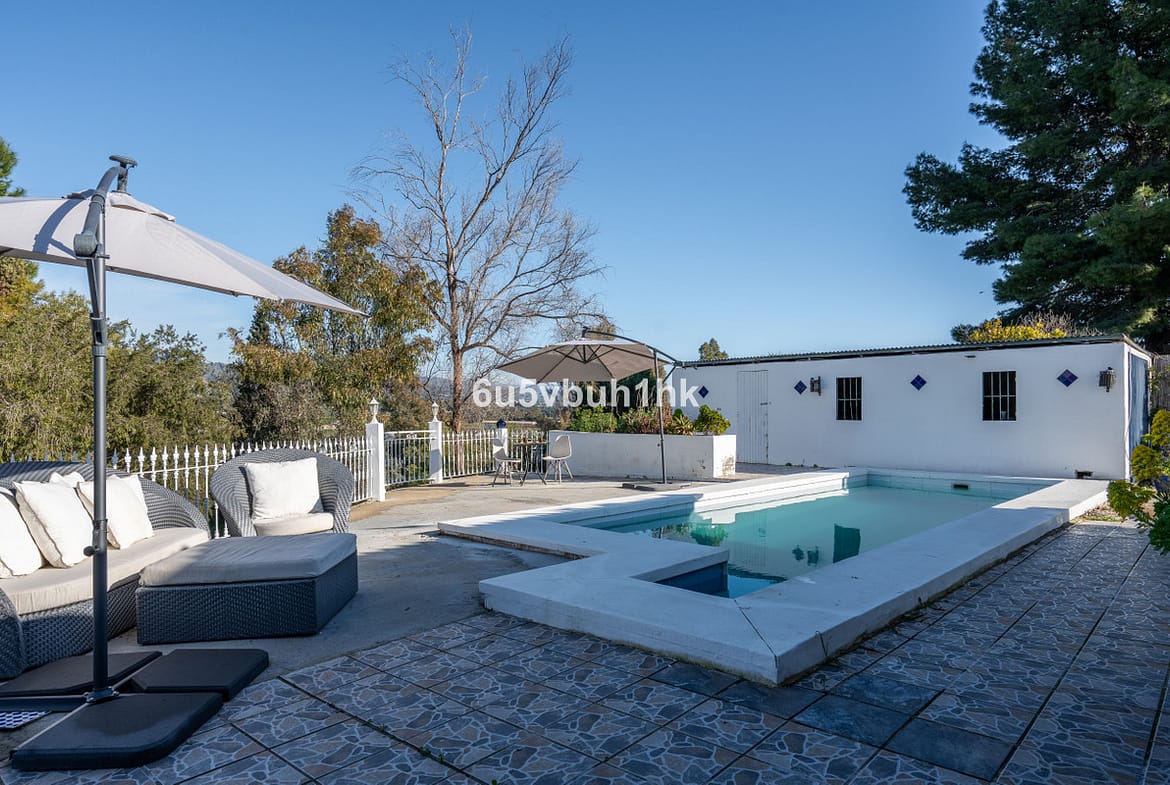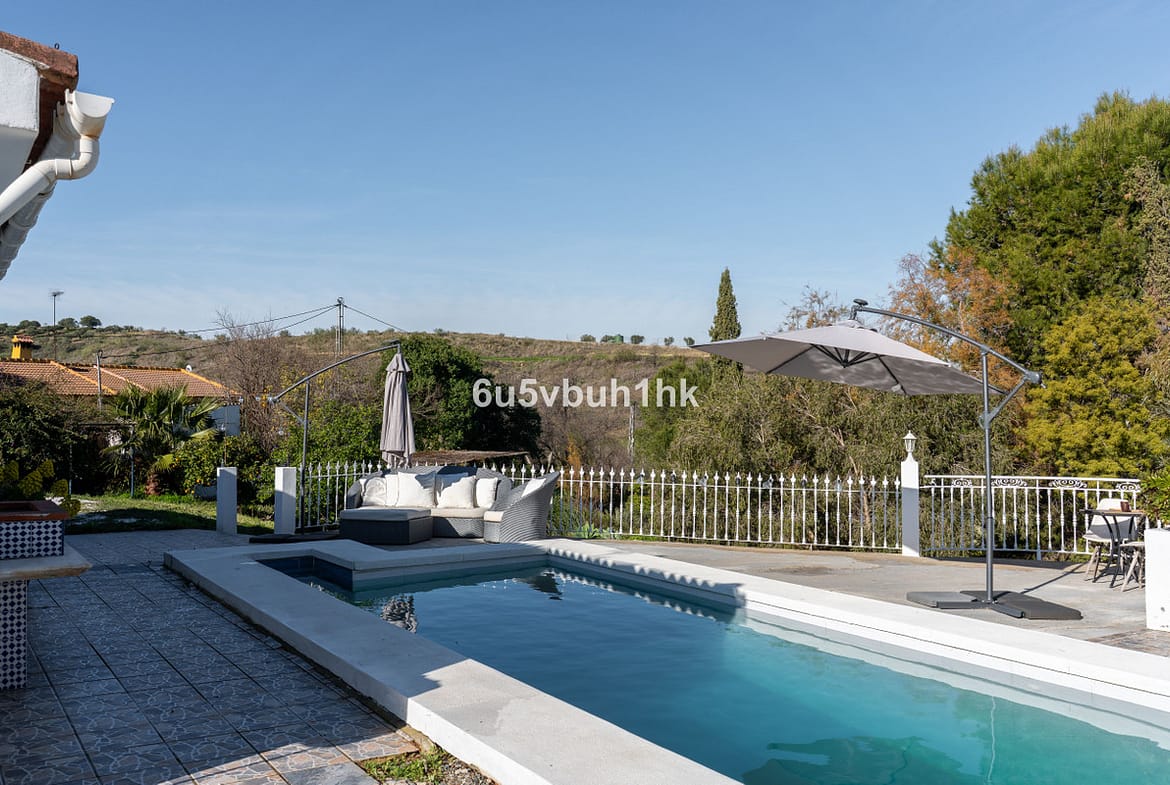 Nestled in the Cártama countryside but conveniently close to town, this single floor finca offers the best of both worlds, tranquil rural living with easy access to modern amenities. This two bedroom home has recently been renovated with new flooring throughout, new air conditioning/heating units, new interior doors, a new open plan kitchen and the electrics have been upgraded. At the entrance to the house is a covered terrace which is partly enclosed and leads onto the pool area with a sunny patio which overlooks a large garden filled with tropical plants and fruit trees. The plot has two access gates, there is ample outside parking by the house or a large two car garage, which could easily be made into a small apartment or a third bedroom with an ensuite bathroom if extra living space is needed.