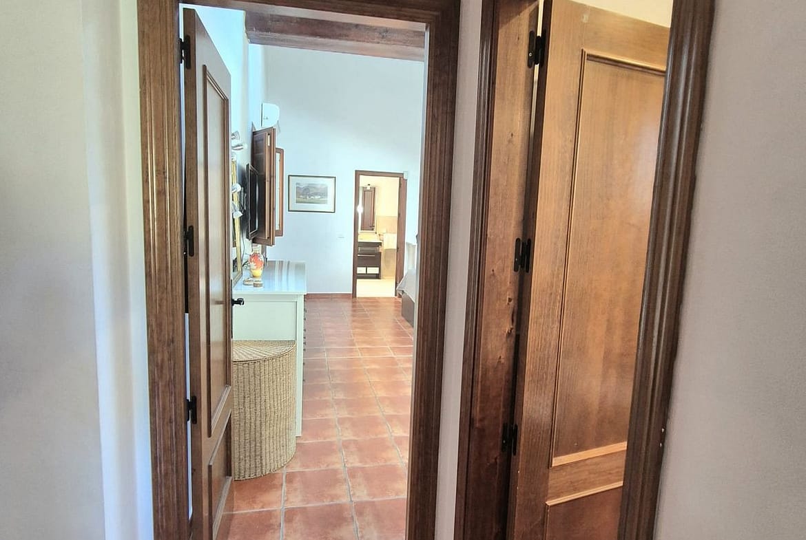 As you enter the property through the electric gates you have a stoned road that leads to the finca, with ample car parking, 2 car carport / garage, at the front of the property there is a nice covered terrace to enjoy alfresco dining. Entering the finca into the open living room / kitchen, you have high ceilings with wood beams, the kitchen is fully fitted and in prestine condition, and the living room has a wood burner and pellet stove. From here is also access to the back part of the house where there is a nice courtyard and you can combine being outside and in as well. From the living room you have a hallway that leads you to the 2nd double bedroom, guest full bathroom and large master suite with a big ensuite bathroom, this is a huge room with lots of potential for making it even into 2 bedrooms, you have skylights, a window and door that accesses the same back courtyard, nice fitted wardrobes. The master bathroom has a large soaker tub and free standing separate shower.