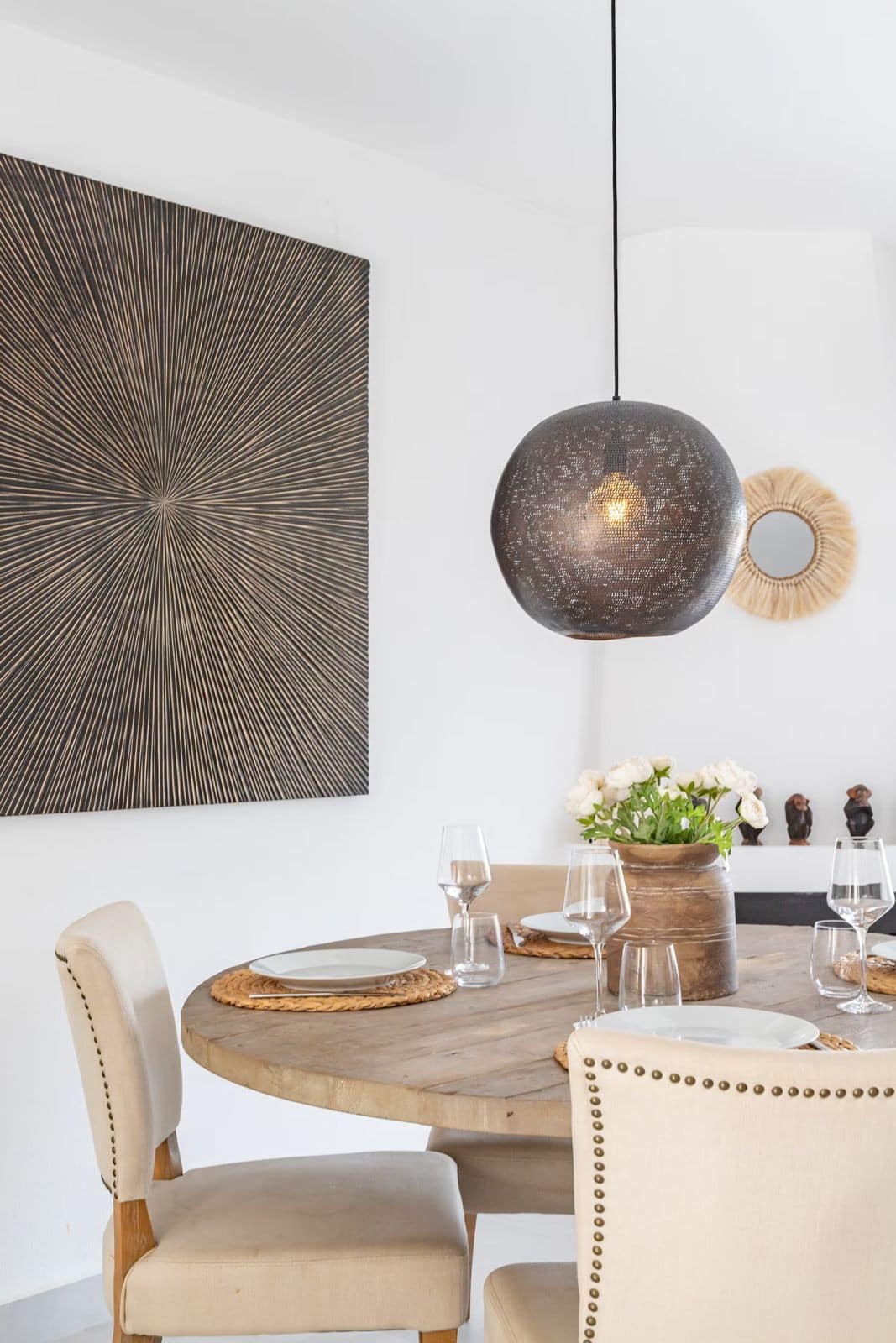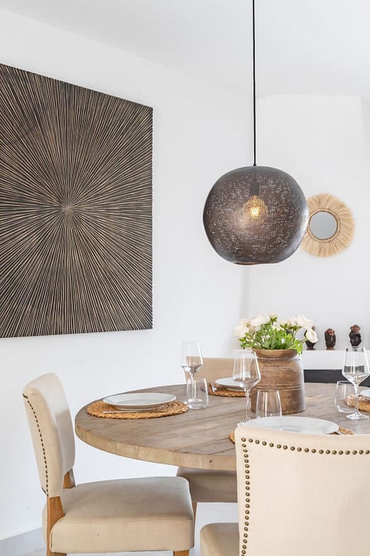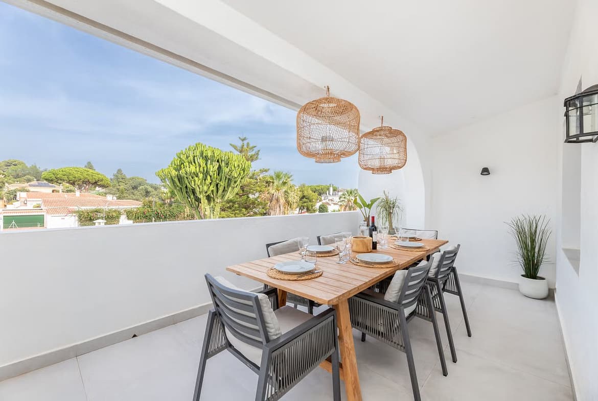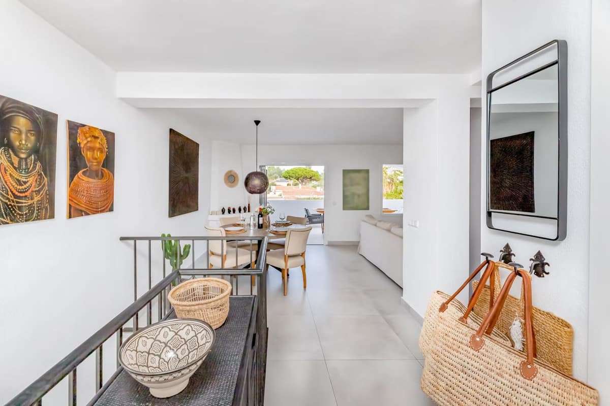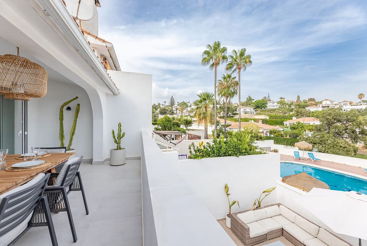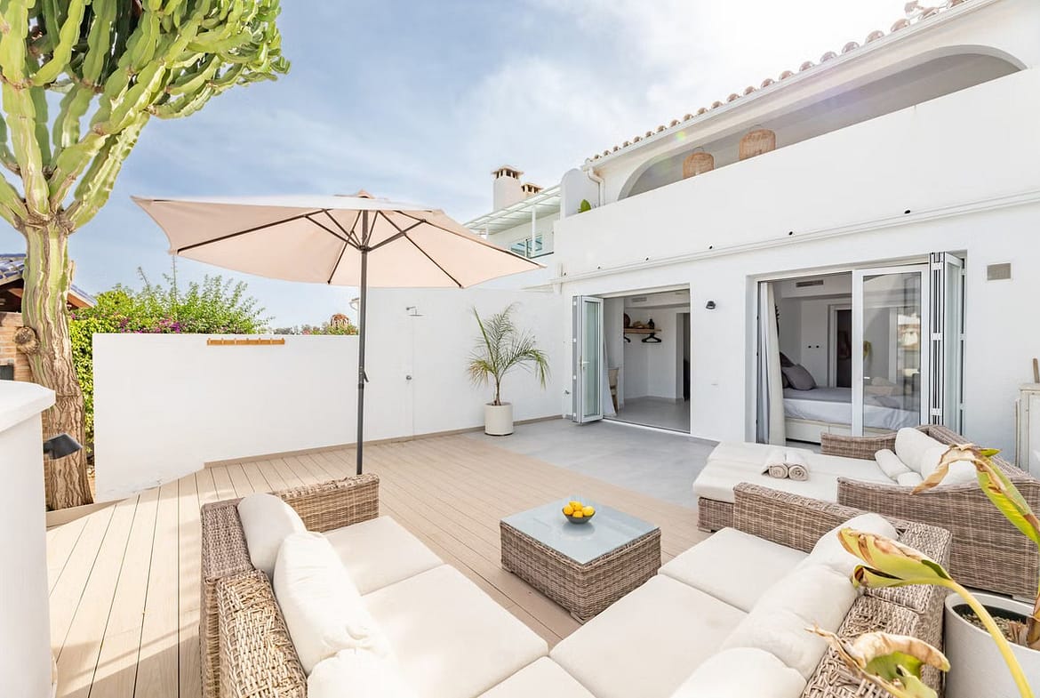 East Marbella, Elviria centre. For sale fantastic renovated and charming townhouse in Pueblo Sueco. This townhouse was refurbished to high quality standards in 2018 and beautifully decorated throughout. The property has a modern feel of top quality and is built over 2 floors. When entering the plot you will find an inviting west patio partially covered. It is furnished with chillout daybeds and there is lots of space for al fresco dining. There are mature types of spectacular cactus and easy maintaining planters. Entering the house you will find a handy guest toilet on the right and the fully equipped kitchen with all the necessary appliances. Also in the kitchen a cosy window to the front patio. The living room has large folding doors to the terrace, good space for two 3 seater-sofas and a nice round dining table next to the fire place. From the living room you access a lovely and spacious covered morning terrace with a 6 seater table, perfect to enjoy your breakfast! The stairs take you to the lower floor where we find a good sized bedroom with another auxiliary bedroom which could be used as dressing room. Another bedroom with a lot of extra space with a desk and dressing area. There are two bathrooms with generous showers, (one ensuite) and a washing/ storage room. These two bedrooms lead you to the patio on the lower floor from which you can access directly to the private pool club. At the patio you will find a beautiful deck where you can relax on the sunbeds and refresh using the solar shower. You can optionally be a member of the club for a yearly fee. There is Daikin hot and cold air conditioning system, underfloor heating in the bathrooms and high speed fibre optic. The neighbours are a combination of local and international nationalities. There is only a 10 minute walk to the best beach in Marbella, a 10 minute drive to Marbella city and less than 45 minutes to Malaga airport. There are as well several 18 hole golf courses like Santa Maria Golf, Santa Clara, Rio Real and Marbella Golf. Marbella has become a brand in Europe and all over the world with 320 days of full sun a year and total of 2900 hours of sun. Elviria represents the very essence of quality of life on the Costa del Sol. It is located in a unique natural setting and has a fantastic range of facilities nearby, including three 4-and-5 star hotels: Don Carlos, Marriott and Estrella de Mar, renowned golf courses such as Santa María and Green Hills, a Michelin-starred restaurant, Nikki Beach Club and one of the best beaches on the coast, all flanked by outstanding bars and restaurants, supermarkets and a local street market every Friday and an organic market every other Saturday. In addition, there is a Town Hall, doctor's office, post office, a wide range of schools, including private schools…all within walking distance. This is a unique opportunity and the ideal location for both a permanent residence or dream holiday home.