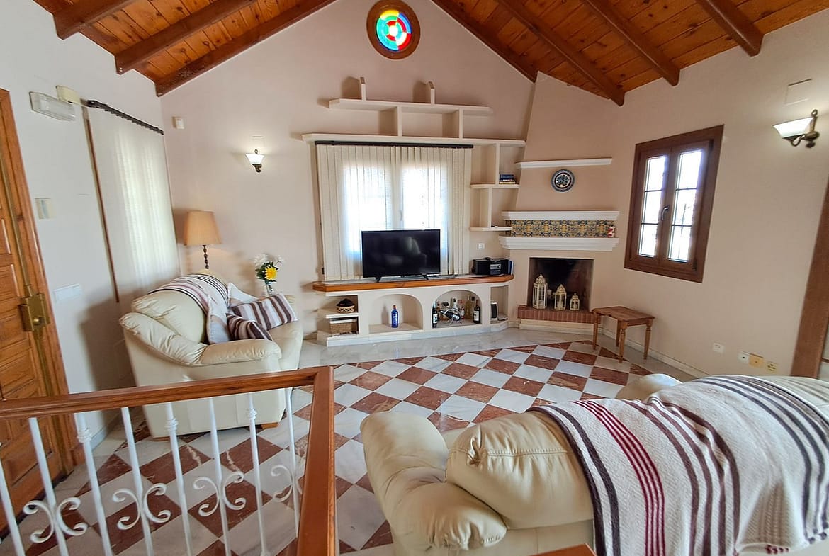 Thoughtfully laid out across two levels, the home exudes timeless Mediterranean elegance with refined finishes, quality craftsmanship, and an atmosphere of sophistication. The upper level welcomes you with a spacious and light-filled living room, where a striking traditional fireplace adds warmth and character. Adjacent is a fully independent kitchen, perfect for entertaining or relaxed day-to-day living, and a stylishly finished guest bathroom. From the living space, step out onto the expansive terrace, where you’ll find breathtaking open views of the countryside, golf course, and community bowls area—an ideal setting for al fresco dining or peaceful sunset evenings. A retractable awning provides shade and comfort year-round.