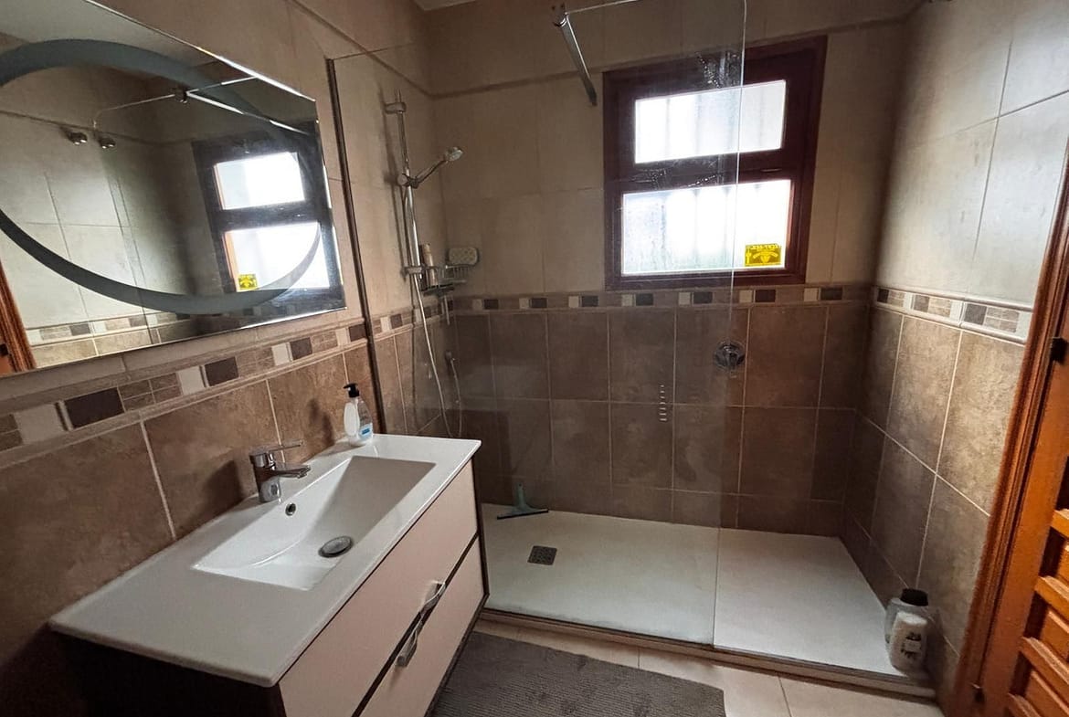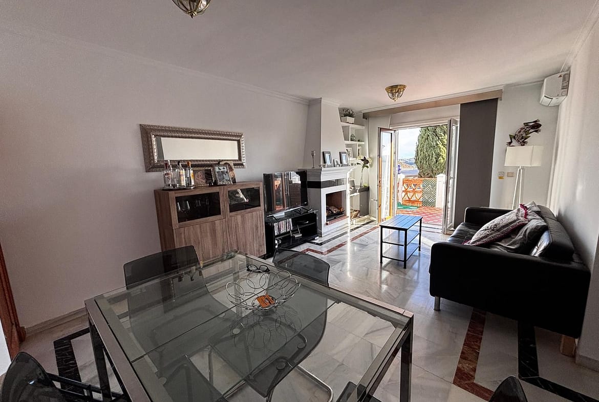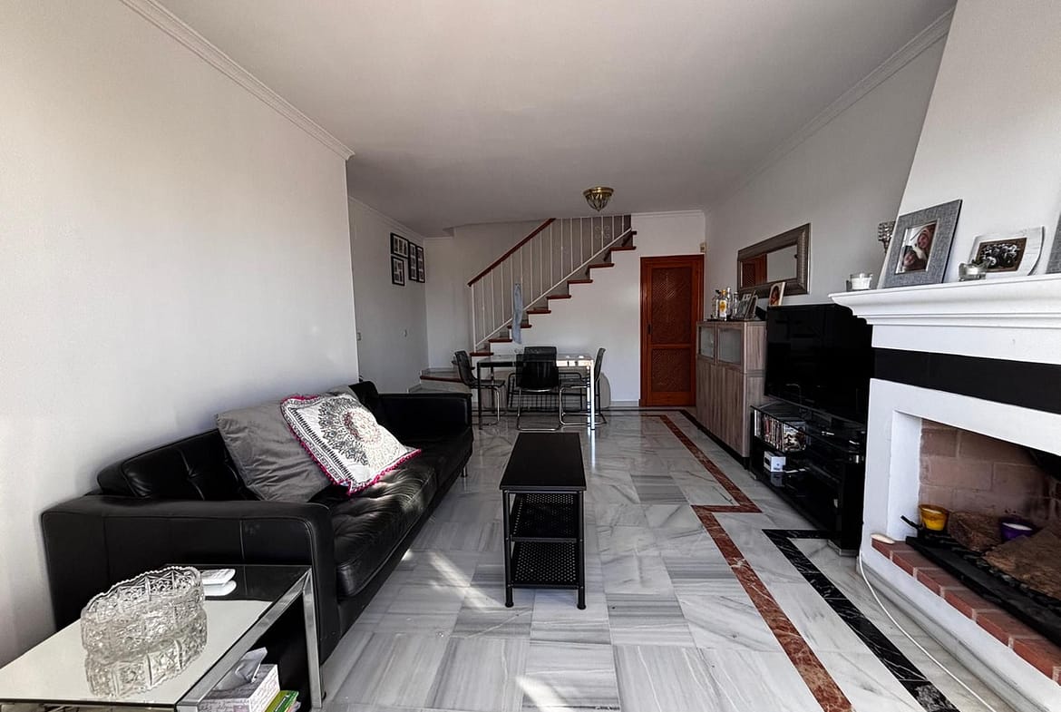 Built with high-quality materials, the townhouse includes marble flooring, renovated double-glazed windows and patio doors with wood-effect finishes, fitted wardrobes, and air conditioning with heat pump in the living room and both bedrooms and electric awning. Additional storage space is conveniently located under the staircase.