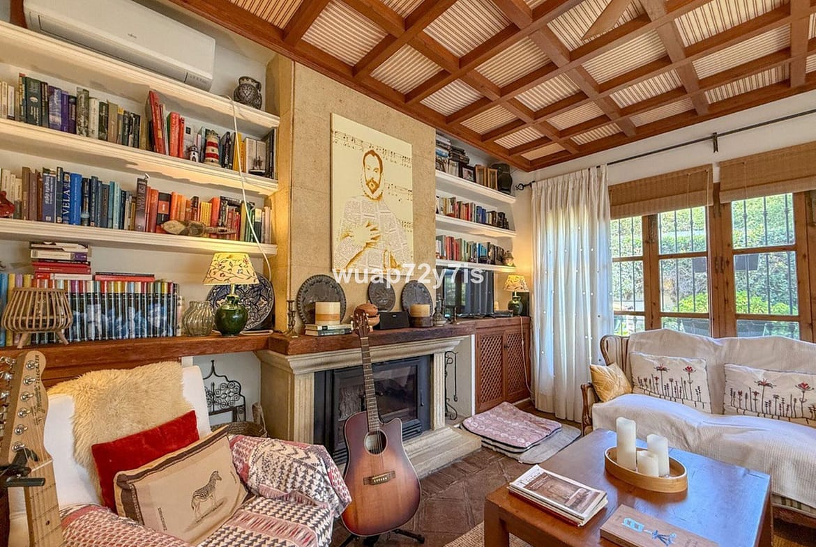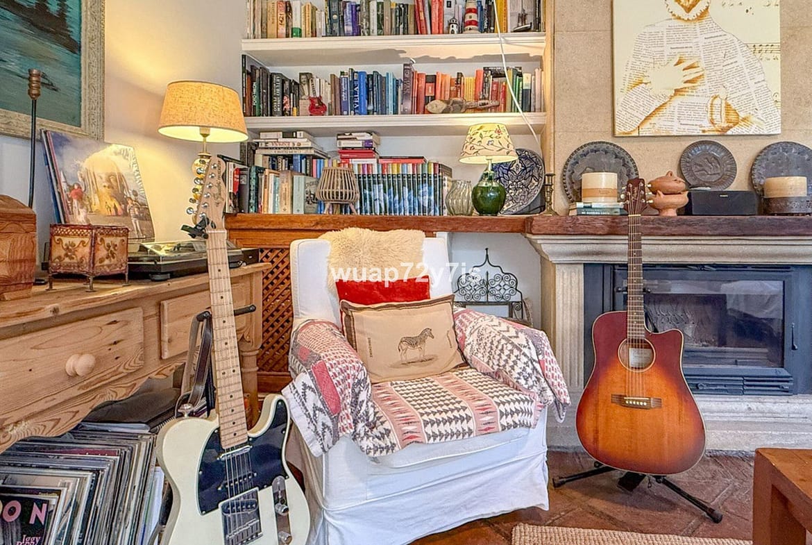 The property comprises two spacious bedrooms, one beautifully tiled bathroom, and a large living room with an elegant library area — a perfect setting to relax with a good book by the fireplace. Adjacent to the living area, you’ll find a bright and spacious study, ideal for creating your own private office or creative workspace.
