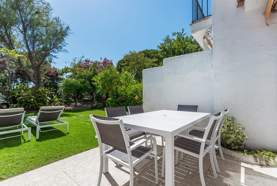 Frontline golf, fully renovated townhouse in Peñablanca, a gated complex by the Aloha Golf Club, Nueva Andalucía, just 3km away from Puerto Banús. Southwest facing and built on 2 levels, property comprises: entrance hall; living/dining room with fireplace and access to the private terrace and garden; open-plan modern kitchen with independent laundry area; 2 bedrooms; 2 bathrooms. A carport for one car. Independent A/C in every room. A fantastic and relaxing golf property just 5 minutes from the beach.
