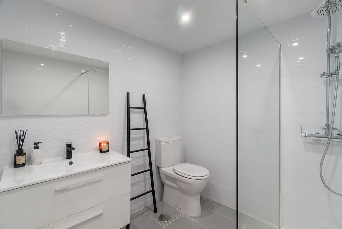 The lower-level features two well-proportioned double bedrooms. The master bedroom includes an en-suite bathroom with a walk-in shower and double vanity, offering both comfort and functionality. The second bedroom benefits from direct access to a private patio, adding a touch of outdoor tranquillity. A spacious family bathroom with a walk-in shower also serves this level, ensuring convenience for both residents and guests.