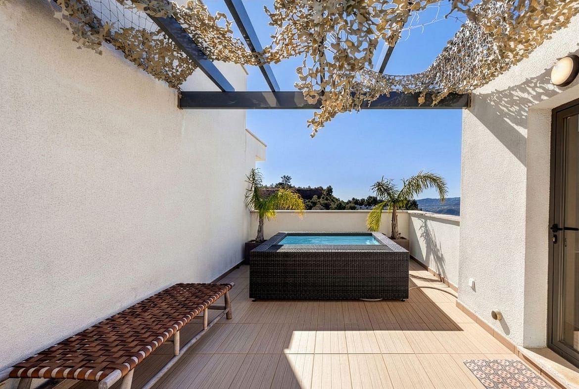 Access to the upper floor solarium is by a wide, modern staircase, leading to a private and super-sized terrace. This stunning top floor terrace provides generous space for sunbathing, for a BBQ, dining and lounge areas and the plunge pool. The terrace has unmatched, 270degree views overlooking the golf course, mountain ranges and the national park area of Barranco Blanco.