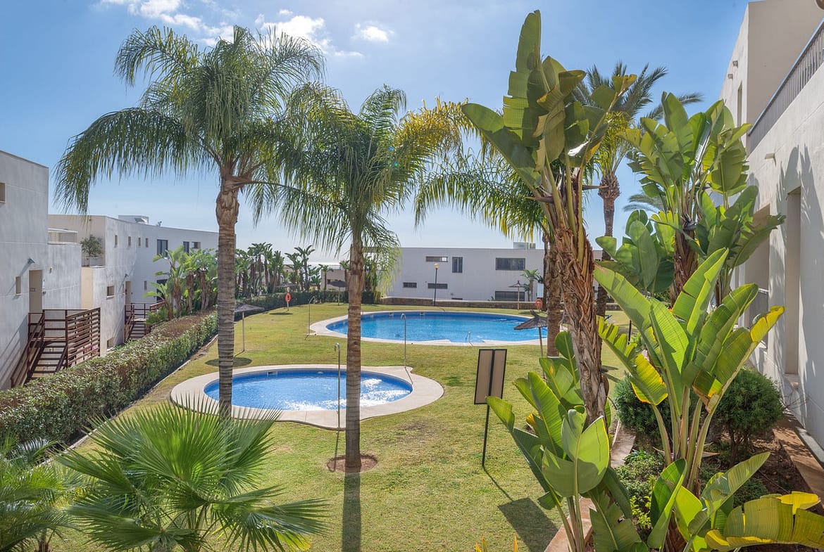 Enjoy partial views of the sea and the communal garden with swimming pool from the covered terraces.