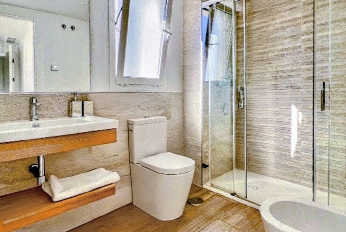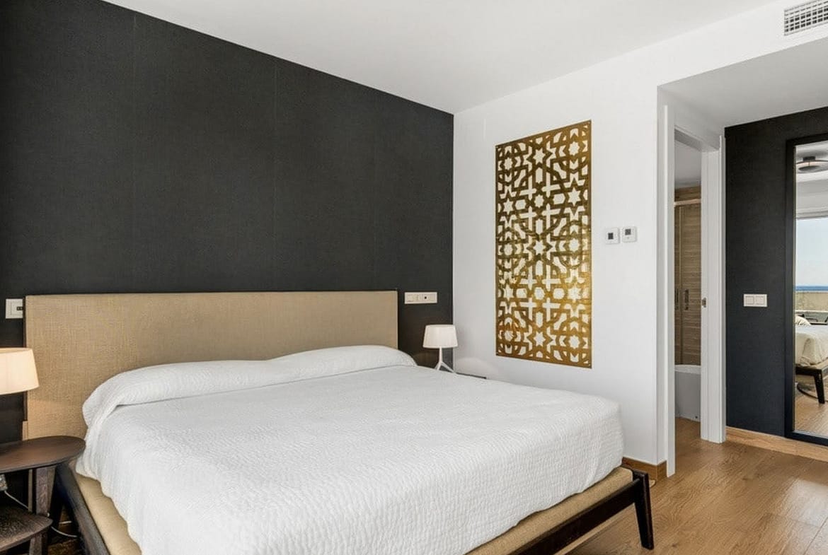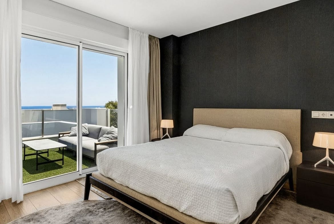 A sophisticated modern stairway leads us upstairs, where we find the master bedroom with its stunning en-suite bathroom, a luxe and inviting space with tons of natural light. There is also an equally bright second guest bedroom and an additional bathroom. All rooms come with ample built-in closets. On that same level, we find a second terrace, perfect for sunbathing, since it is perfectly private, and where one can enjoy a snack while enjoying the wonderful views.