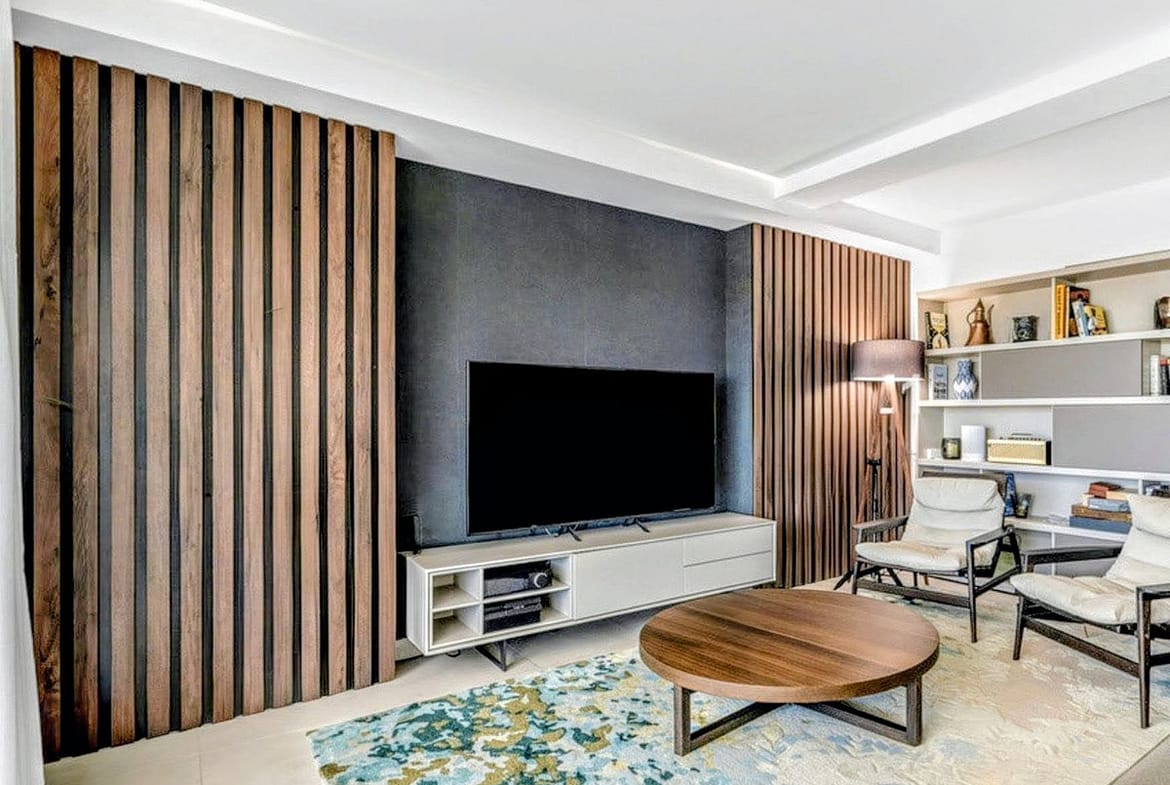 The living room is perfect for a cozy gathering. At that level, we also find a guest bedroom and a downstairs guest bathroom.