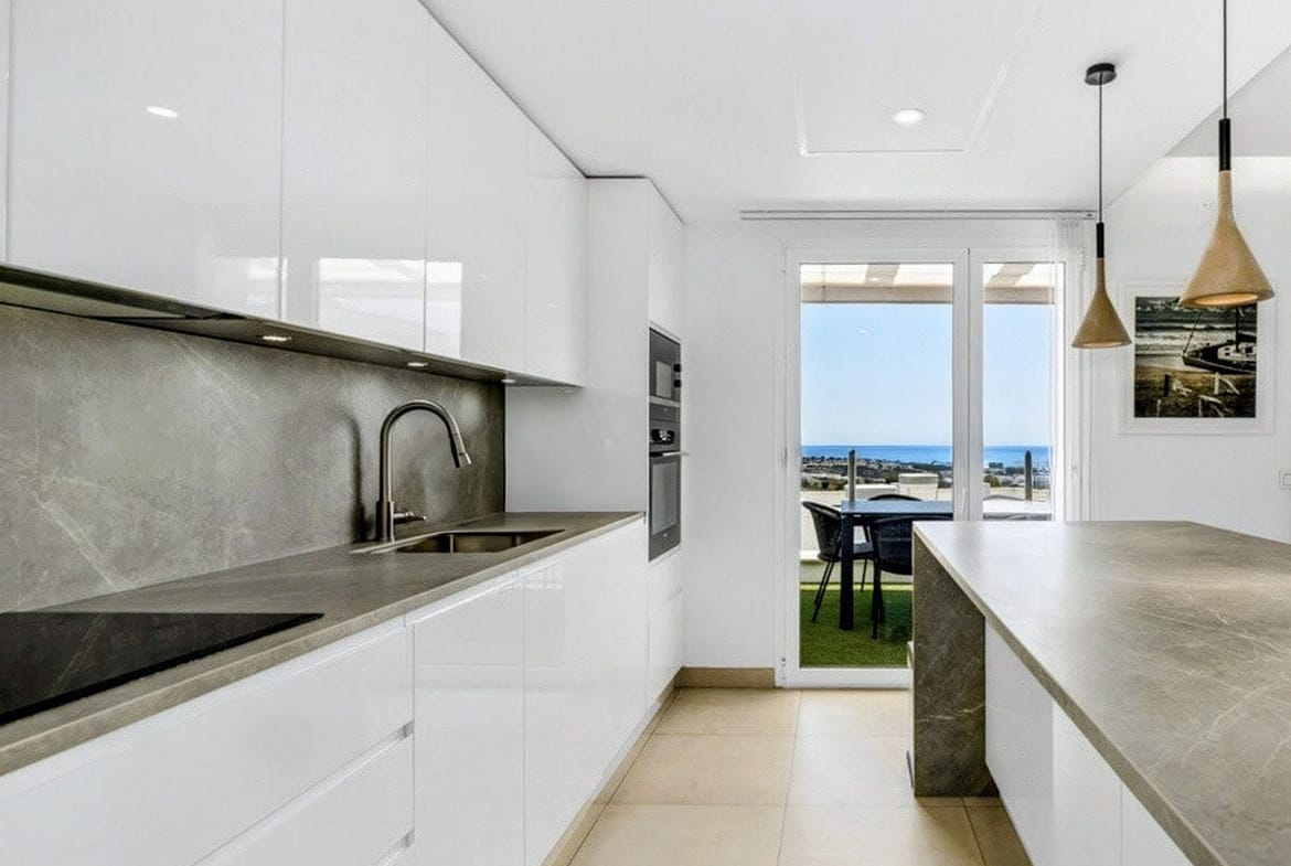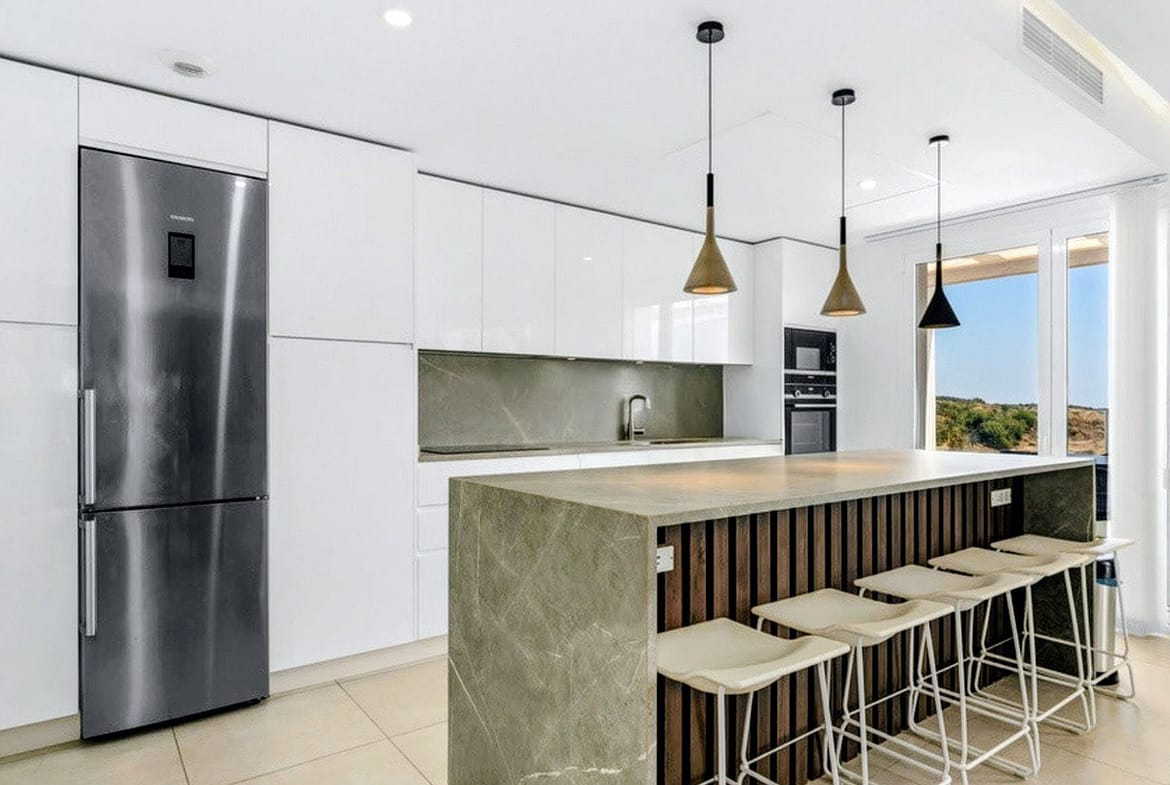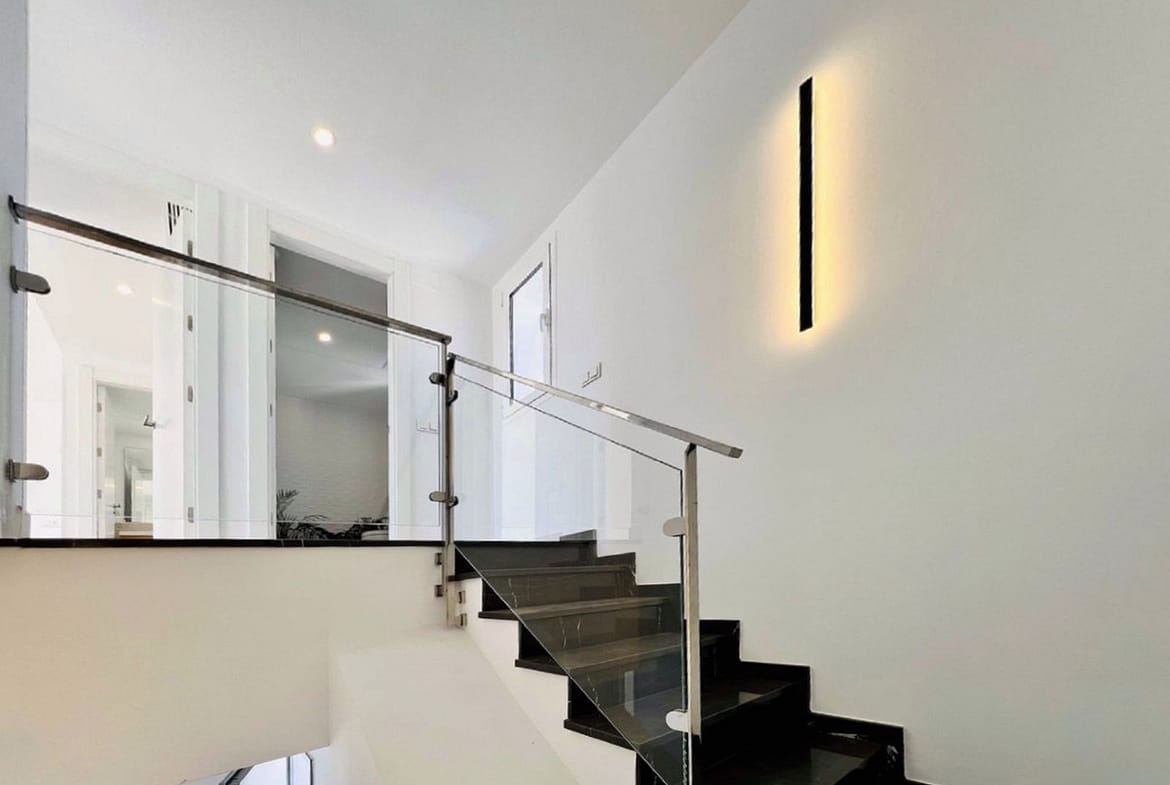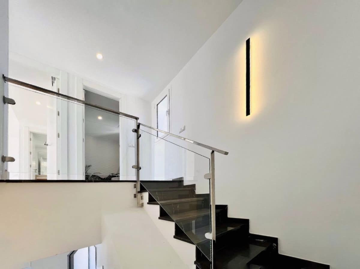 On the first level, we find an open-plan living area, bright and spacious, with raised ceilings that give this particular apartment a feeling of openness as you walk in. This penthouse has beautiful Porcelanosa flooring throughout, and a well-equipped kitchen that features a gorgeous newly reformed countertop island, perfect for entertaining or enjoying a relaxing brunch. All ceiling lights throughout the house are energy-efficient and feature invisible elements.