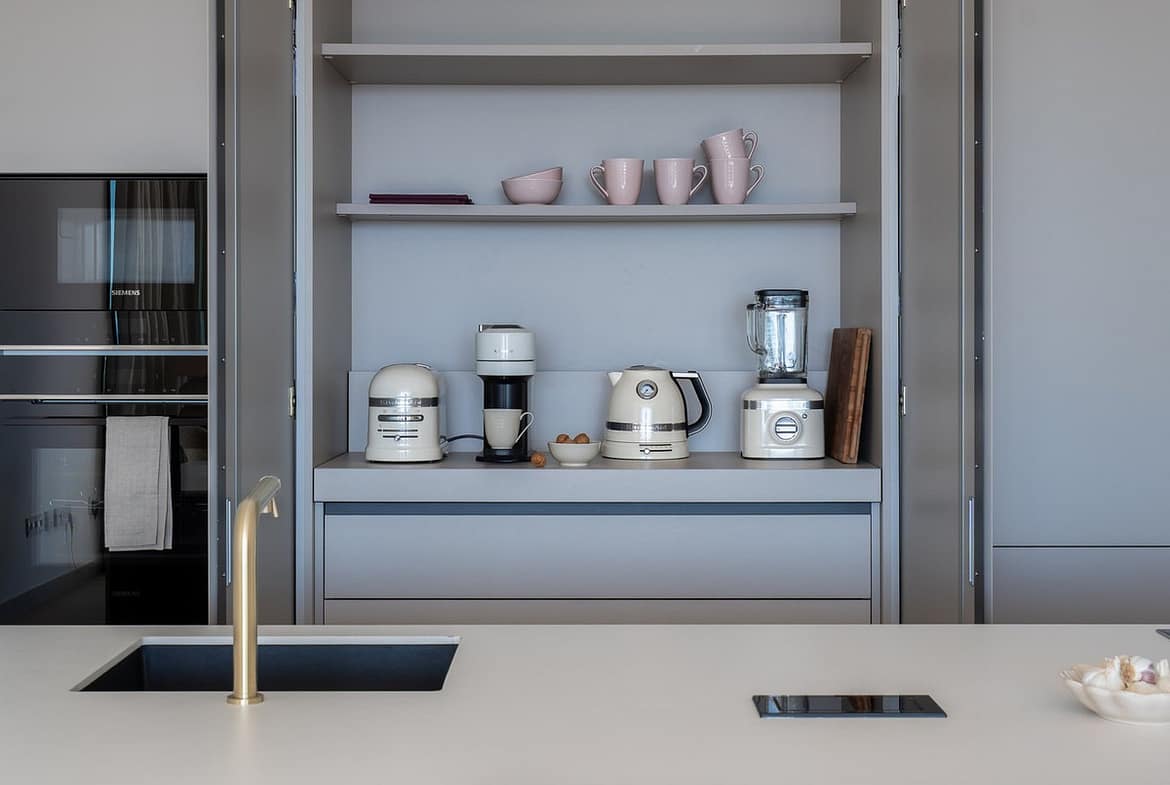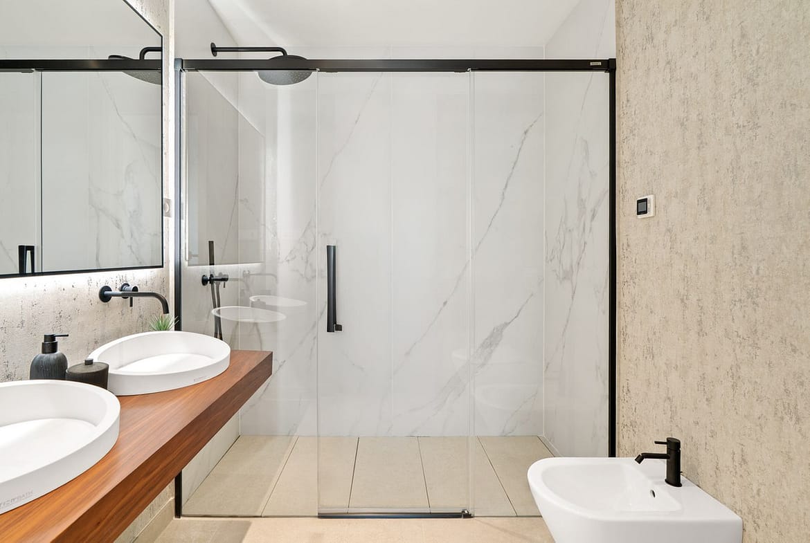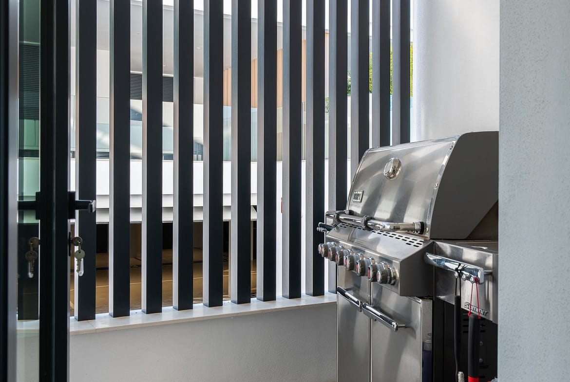 A generous, partly covered main terrace seamlessly extends the living space; enhanced with electric awnings for comfort on warm summer days and discreet heaters for cooler evenings. Beside the kitchen, a dedicated covered outdoor nook creates the perfect space for open-air cooking and memorable BBQ moments.