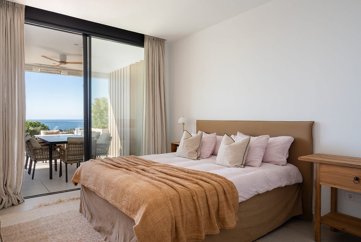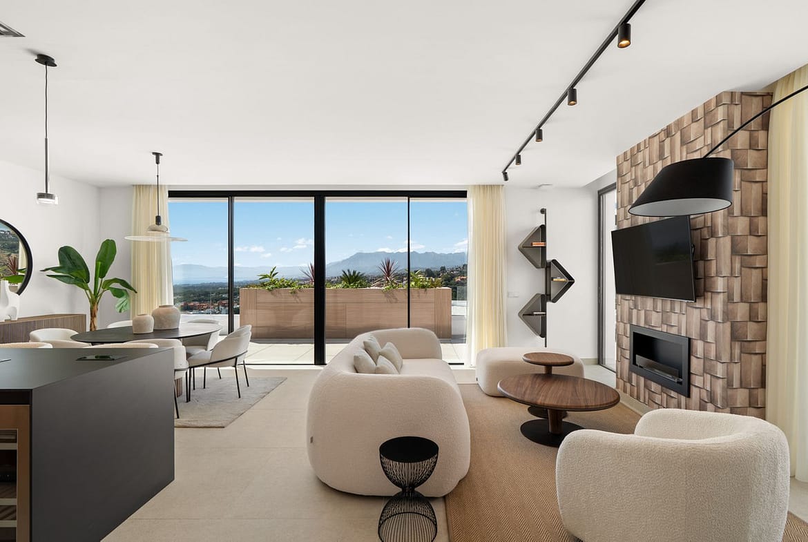 This refined 3-bedroom apartment is bathed in sunlight from dawn till dusk and offers unforgettable sunsets every evening. The open-plan living area features floor-to-ceiling glass doors, inviting natural light to pour in while framing panoramic sea and mountain vistas like a living work of art.
