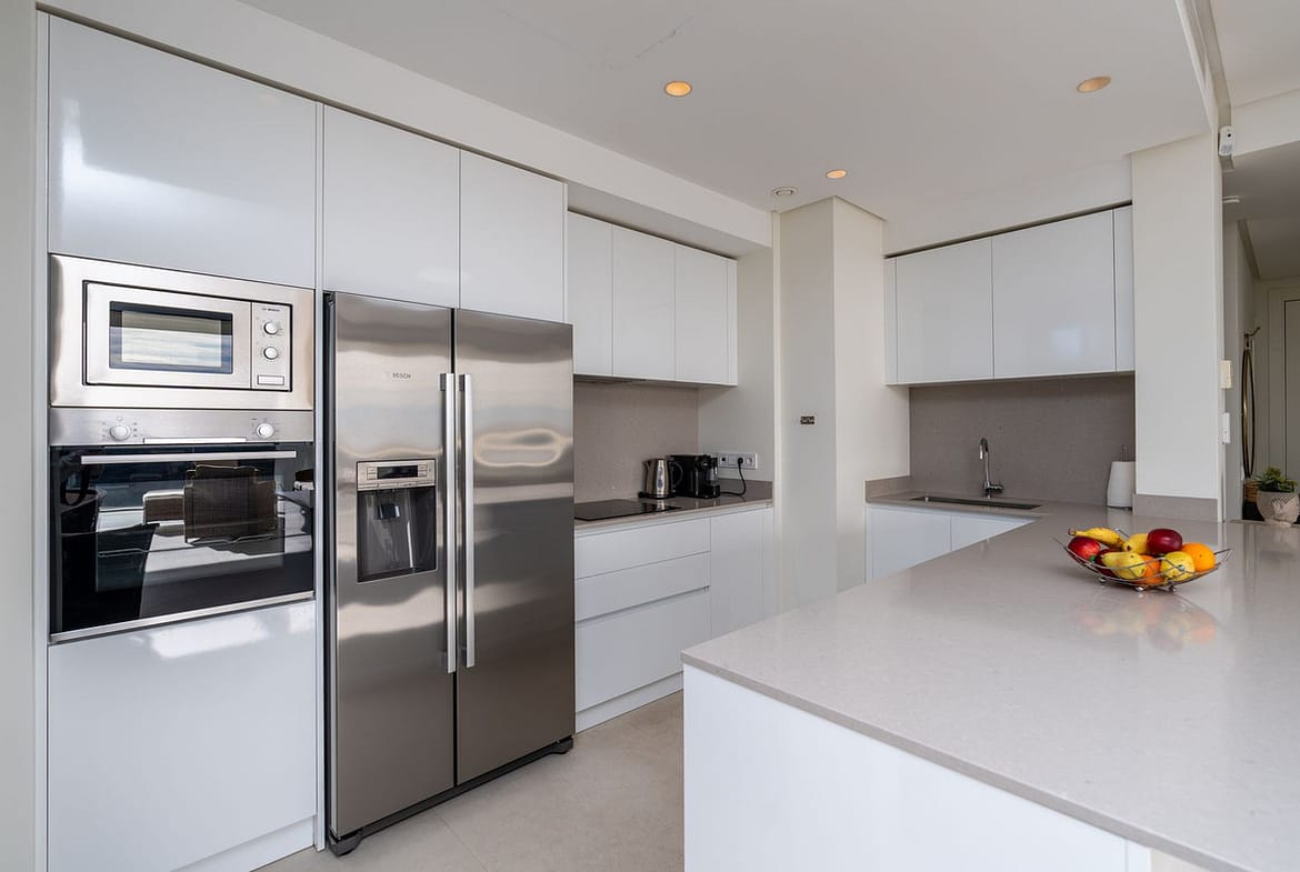 The open-plan living and dining area is bathed in natural light through floor-to-ceiling windows that frame the panoramic coastline. A fully equipped contemporary kitchen with a separate laundry area offers serene countryside and mountain vistas.