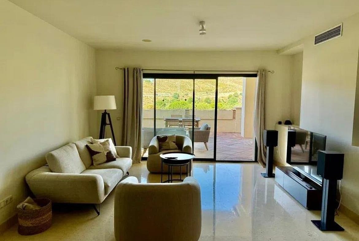 The living room opens onto a large private terrace with outdoor seating and dining areas, perfect for savoring the Mediterranean lifestyle while taking in breathtaking views of the golf course and mountains.