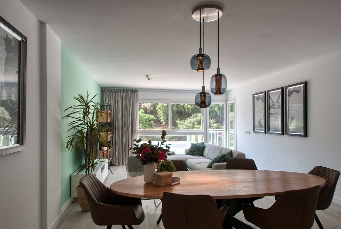 A sliding door separates the living area from the sleeping quarters, which include three double bedrooms with built-in wardrobes and electric blinds. The master bedroom has an en-suite bathroom and terrace access, while the other two bedrooms share a bathroom.