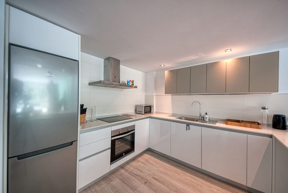 Spacious penthouse in Benahavis with the following layout. The main floor features an open-plan living area leading to a terrace with views over the pool and village. The modern kitchen is fully equipped with top-of-the-line appliances and additional storage.