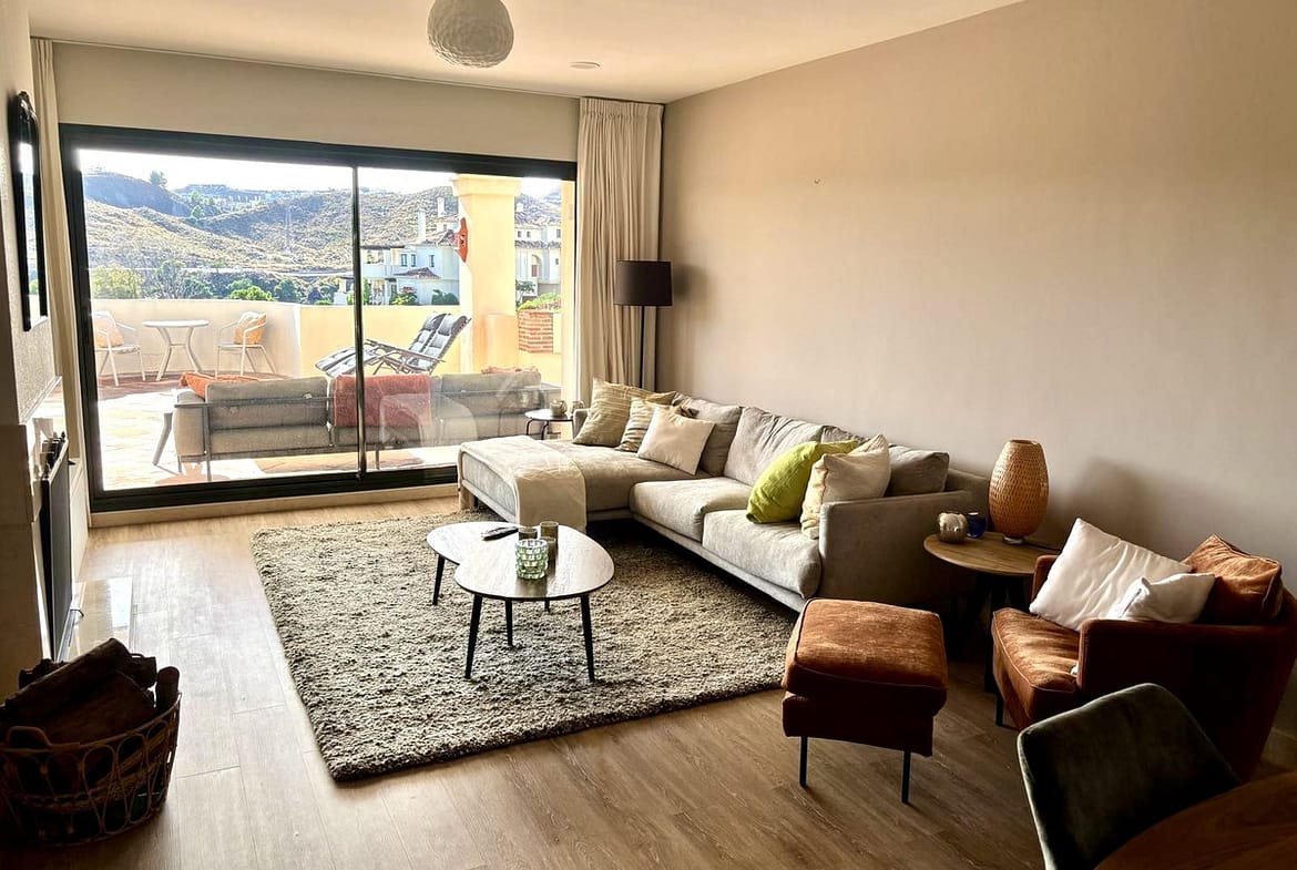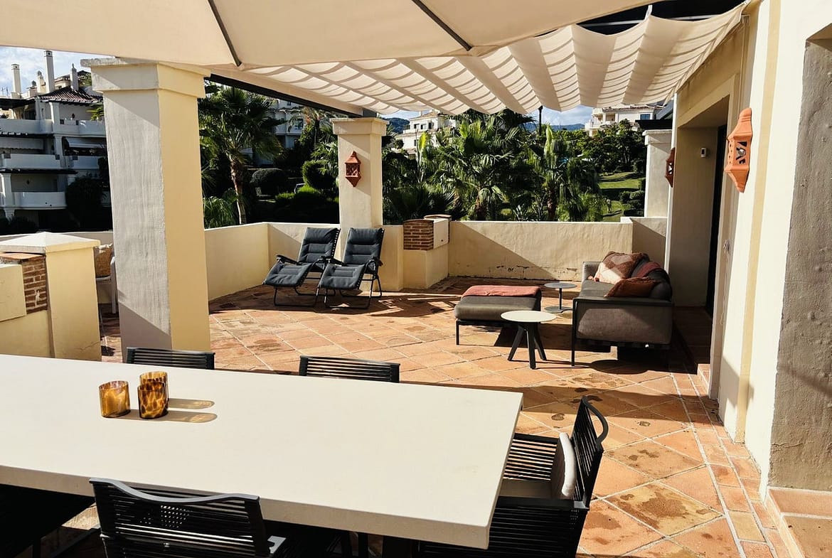 The penthouse is full of light and space with a huge terrace of 106m2. The terrace has beautiful views of the urbanisations luxury gardens with a mountain backdrop.