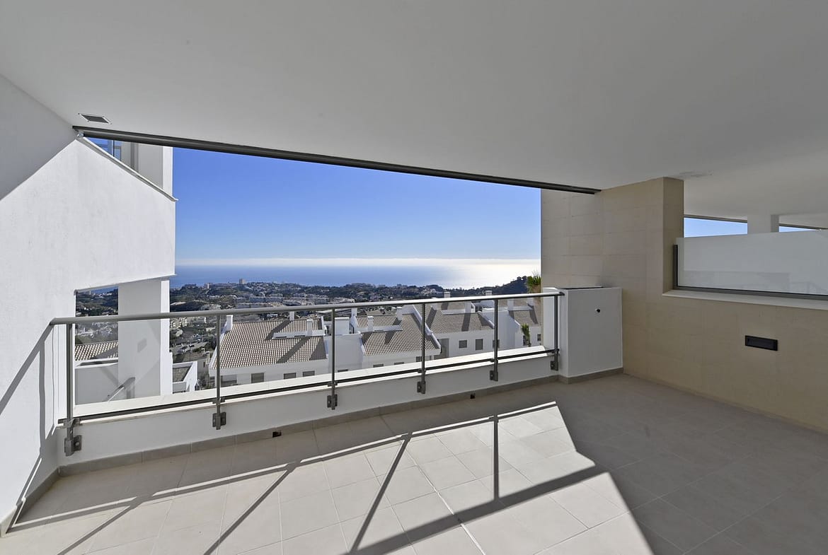 The property has 3 bedrooms with fitted wardrobes and 2 full bathrooms, one of which is en suite in the master bedroom, a living room leading to a large 24.88 m² south-facing terrace with unobstructed sea views.