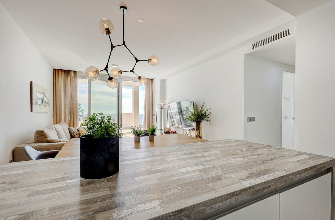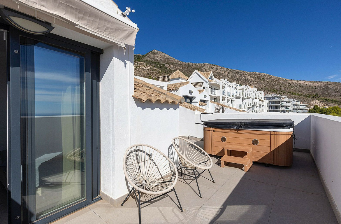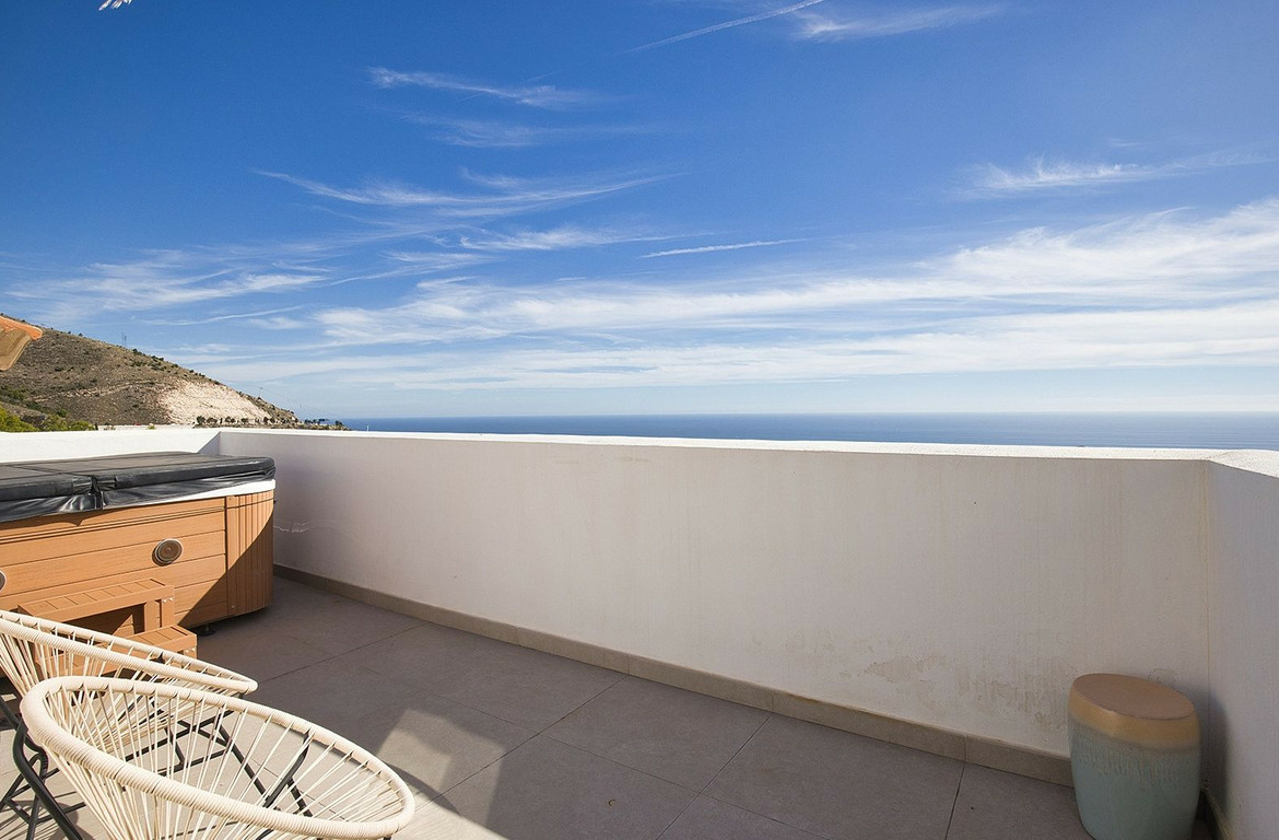 On the upper level there is the main bedroom with an en-suite bathroom and access to a spectacular rooftop terrace with a private jacuzzi and breathtaking views of the Mediterranean.