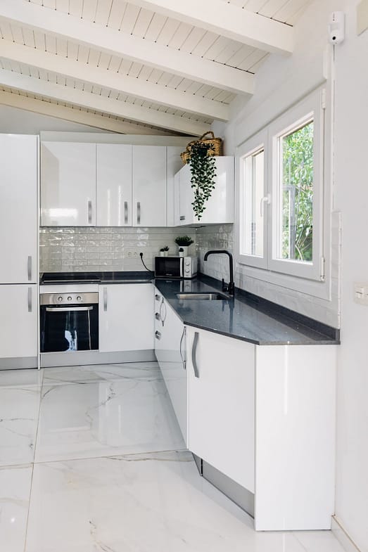 The modern kitchen, visually integrated with the living-dining area, creates an open and social environment, ideal for everyday living or entertaining guests.
