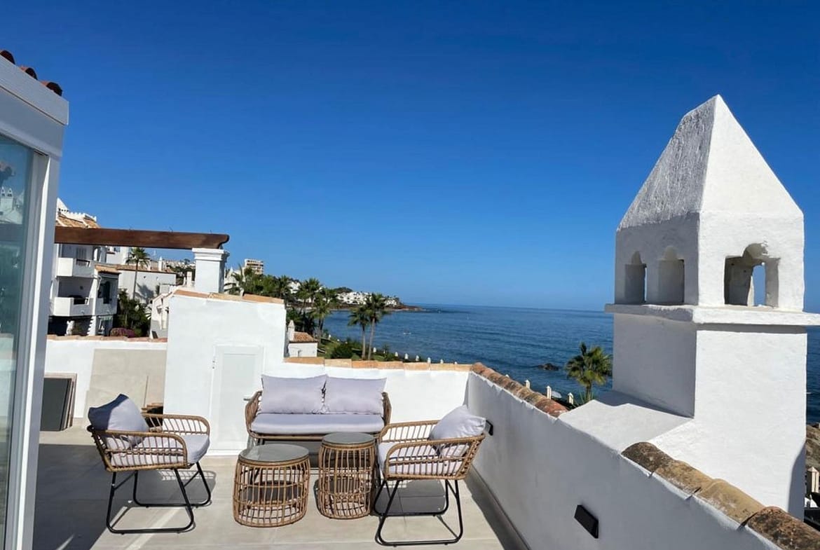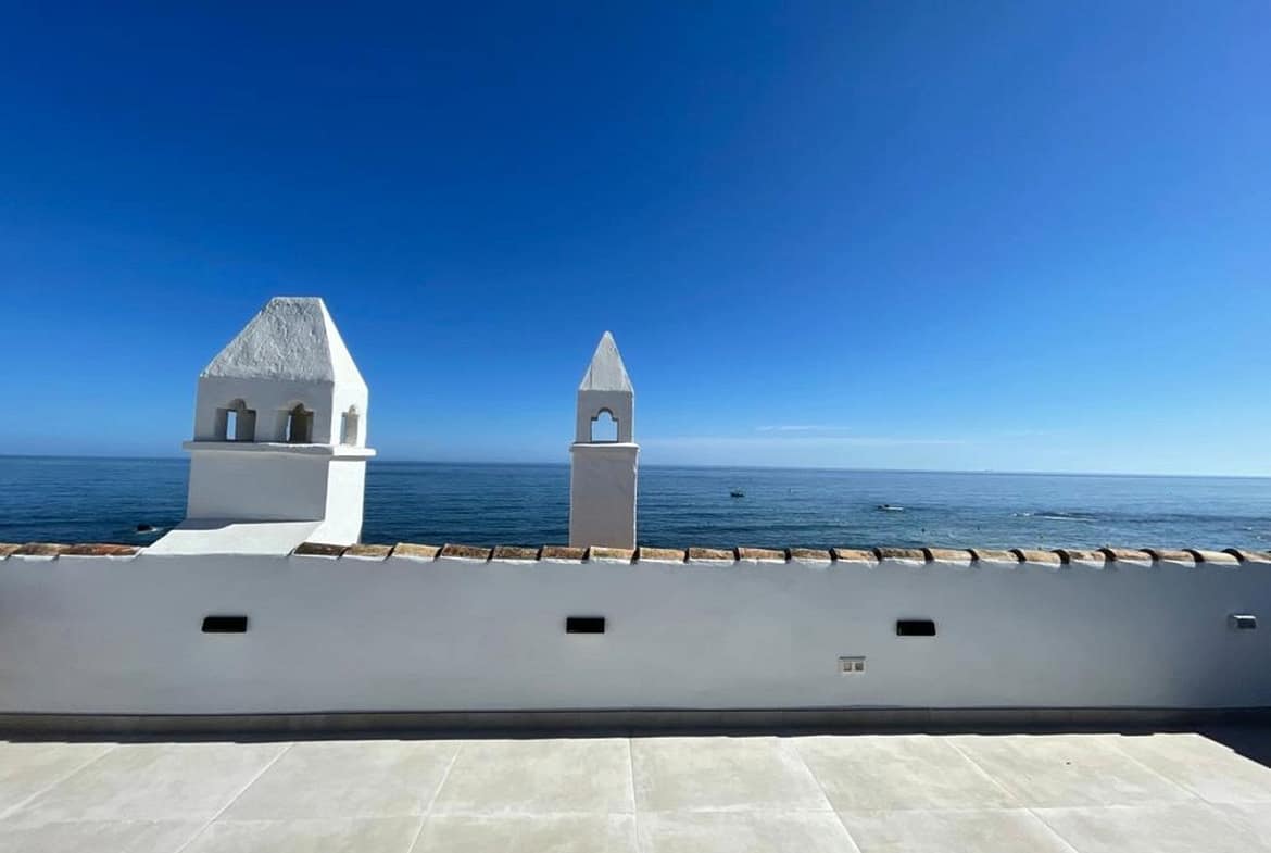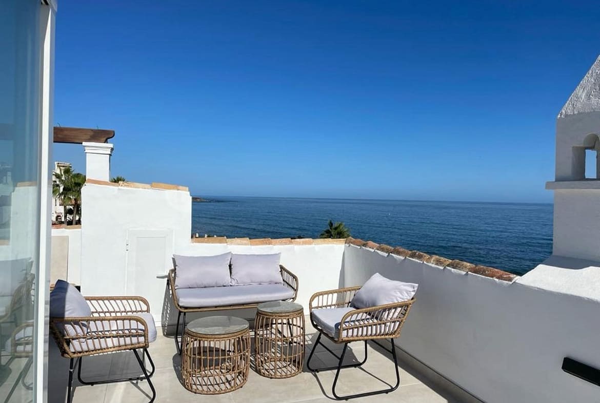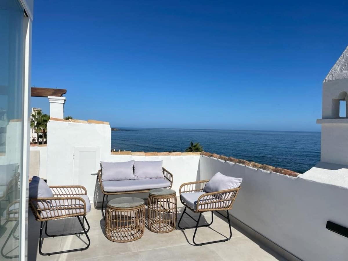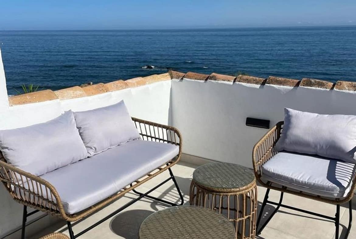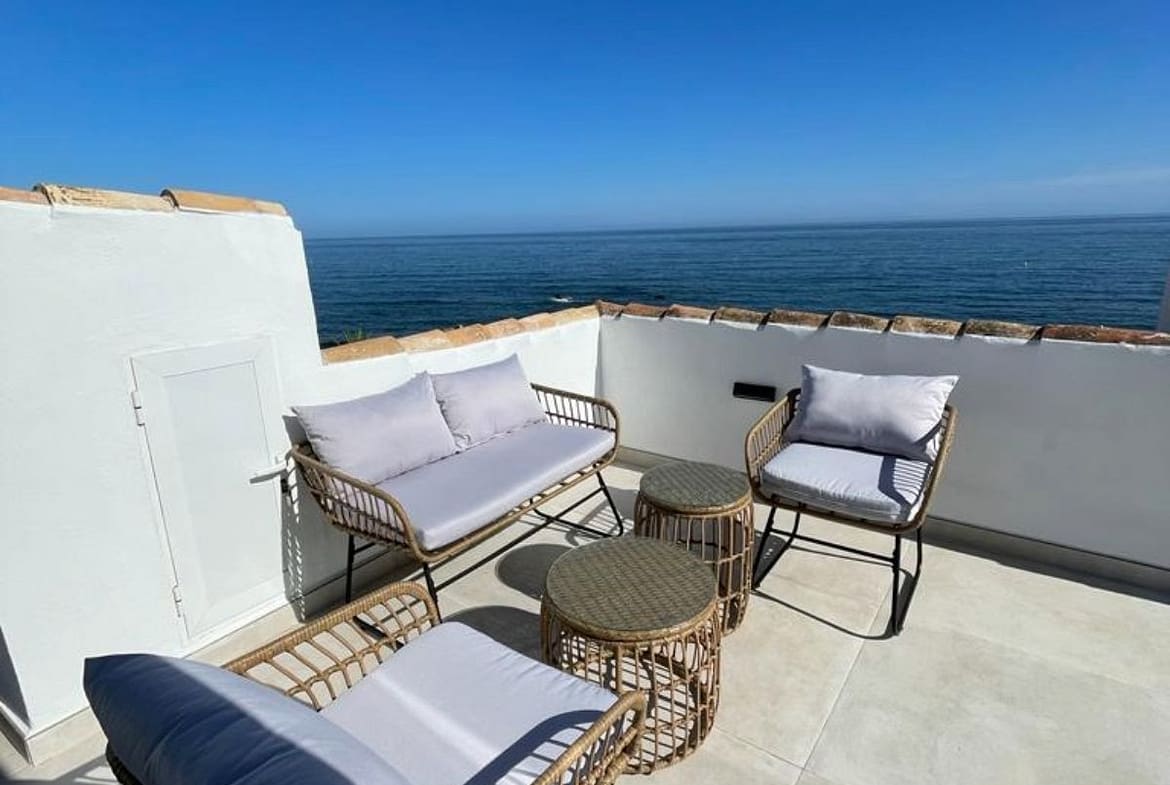 The apartment is a corner penthouse on the beachfront in Calahonda, Mijas Costa, province of Málaga. Completely renovated, without leaving a single detail to chance, the apartment has a large open kitchen, more than 4 meters long and with a large island. All appliances are new, there is a washing machine, dryer, dishwasher, refrigerator, induction hob, microwave, toaster, blender, coffee maker, etc. Fully stocked with a large selection of plates, bowls, glasses, mugs, etc. The kitchen has a lot of light since it has 2 windows, both with views of the sea and the beach. The living room is large and square, with an L-shaped sofa bed, smart TV, sea views from many angles and a door leading to the private terrace. On the terrace of more than 60 m2 there is a covered part, with a large table and 6 chairs, hot and cold air conditioning (split), and the other part of the terrace is without a roof, with a barbecue, sun loungers. and beautiful views of the sea, facing east, south and west.