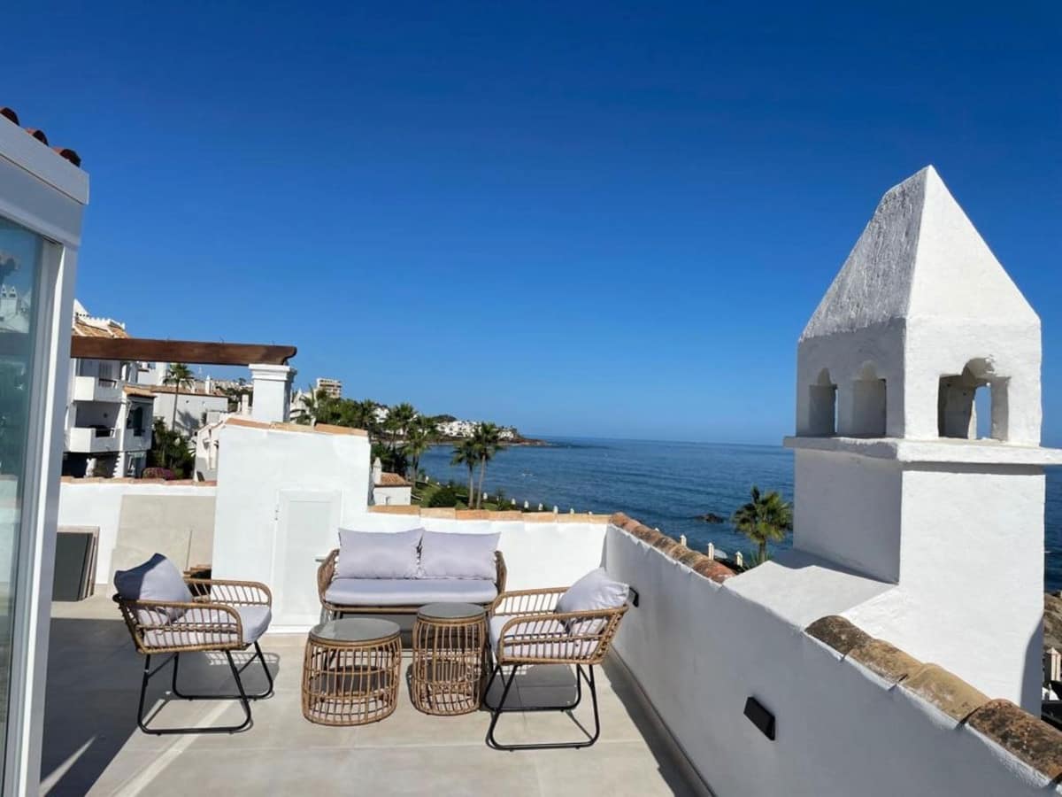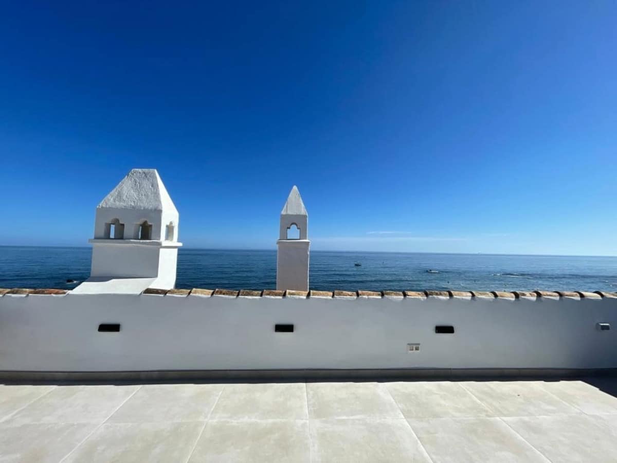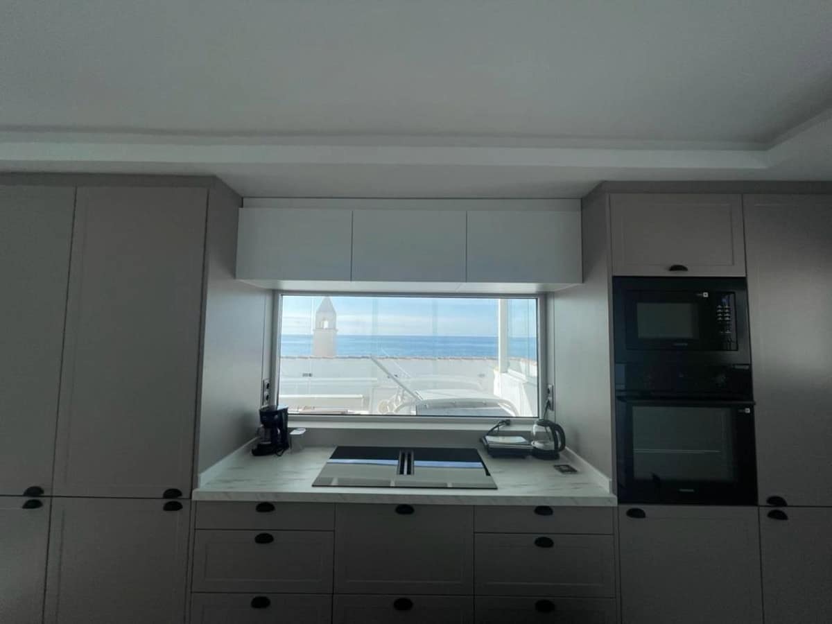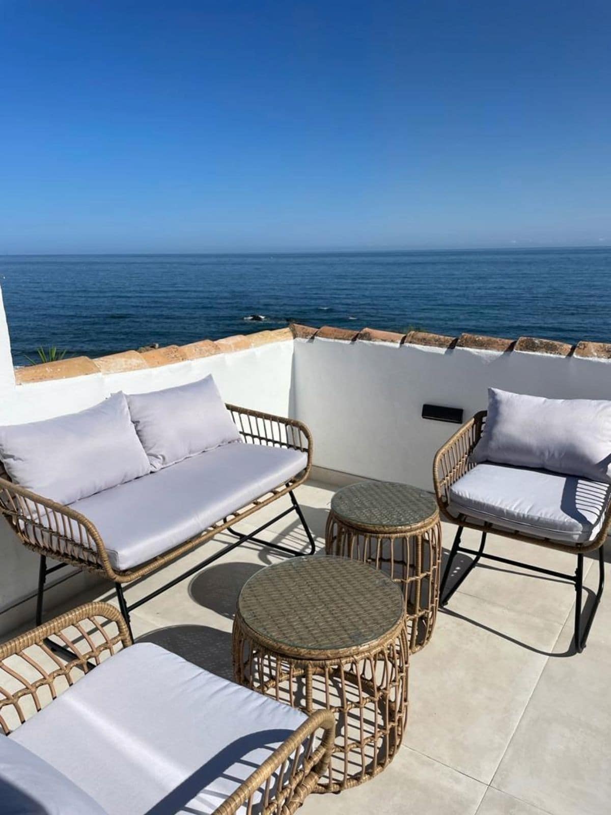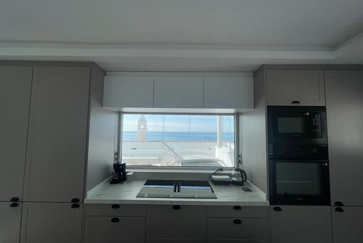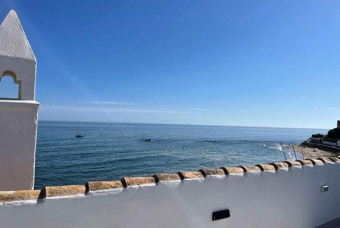 The apartment is a corner penthouse on the beachfront in Calahonda, Mijas Costa, province of Málaga. Completely renovated, without leaving a single detail to chance, the apartment has a large open kitchen, more than 4 meters long and with a large island. All appliances are new, there is a washing machine, dryer, dishwasher, refrigerator, induction hob, microwave, toaster, blender, coffee maker, etc. Fully stocked with a large selection of plates, bowls, glasses, mugs, etc. The kitchen has a lot of light since it has 2 windows, both with views of the sea and the beach. The living room is large and square, with an L-shaped sofa bed, smart TV, sea views from many angles and a door leading to the private terrace. On the terrace of more than 60 m2 there is a covered part, with a large table and 6 chairs, hot and cold air conditioning (split), and the other part of the terrace is without a roof, with a barbecue, sun loungers. and beautiful views of the sea, facing east, south and west.