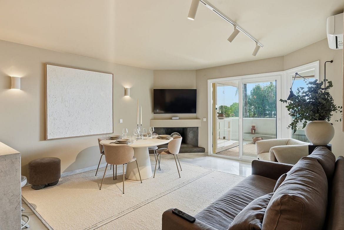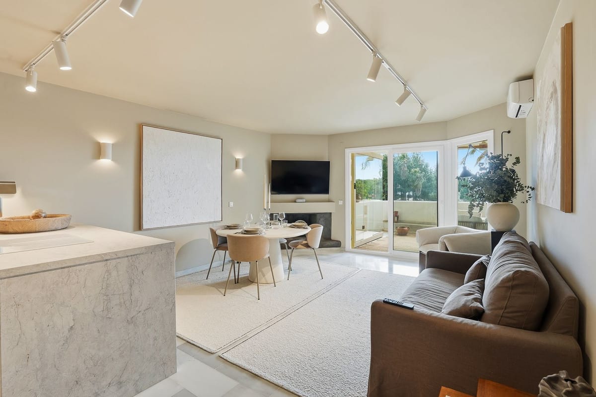 This exceptional 3-bedroom, 2-bathroom luxury apartment is located in the highly sought-after Calahonda Golf community, set in the heart of a picturesque 9-hole golf course. Recently refurbished to the highest standards, the property showcases a sophisticated Japandi design, blending clean Scandinavian lines with warm Japanese minimalism. With a south-facing orientation, the apartment enjoys plenty natural light and beautiful sea and golf views. The spacious terrace is a true highlight, featuring a private sauna—perfect for year-round relaxation and wellness. The property is ideally positioned within walking distance to the beach (15 minutes) and shops, restaurants, and amenities (10 minutes), offering both tranquility and convenience. Set within a secure gated community, residents benefit from communal parking and access to three stunning swimming pools, all surrounded by perfectly landscaped gardens.