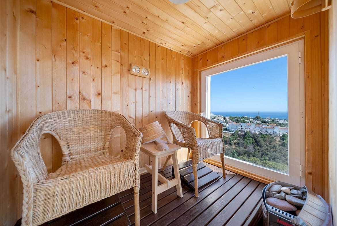 The property comprises 3 spacious bedrooms and 2 bathrooms. The main living area opens onto a generous terrace surrounded by glass curtains, perfect for enjoying spectacular views all year round. With a covered terrace and outdoor kitchen, it's ideal for entertaining friends and family over dinner. All bedrooms are well-sized with built-in wardrobes; one bedroom, currently set up as a cozy TV room with a fireplace, creates a warm, inviting atmosphere for cooler evenings. From this room, you have direct access to a smaller balcony with a Finnish sauna, where you can unwind and soak in stunning sea views. The third bedroom grants access to a storage and utility room for added convenience.