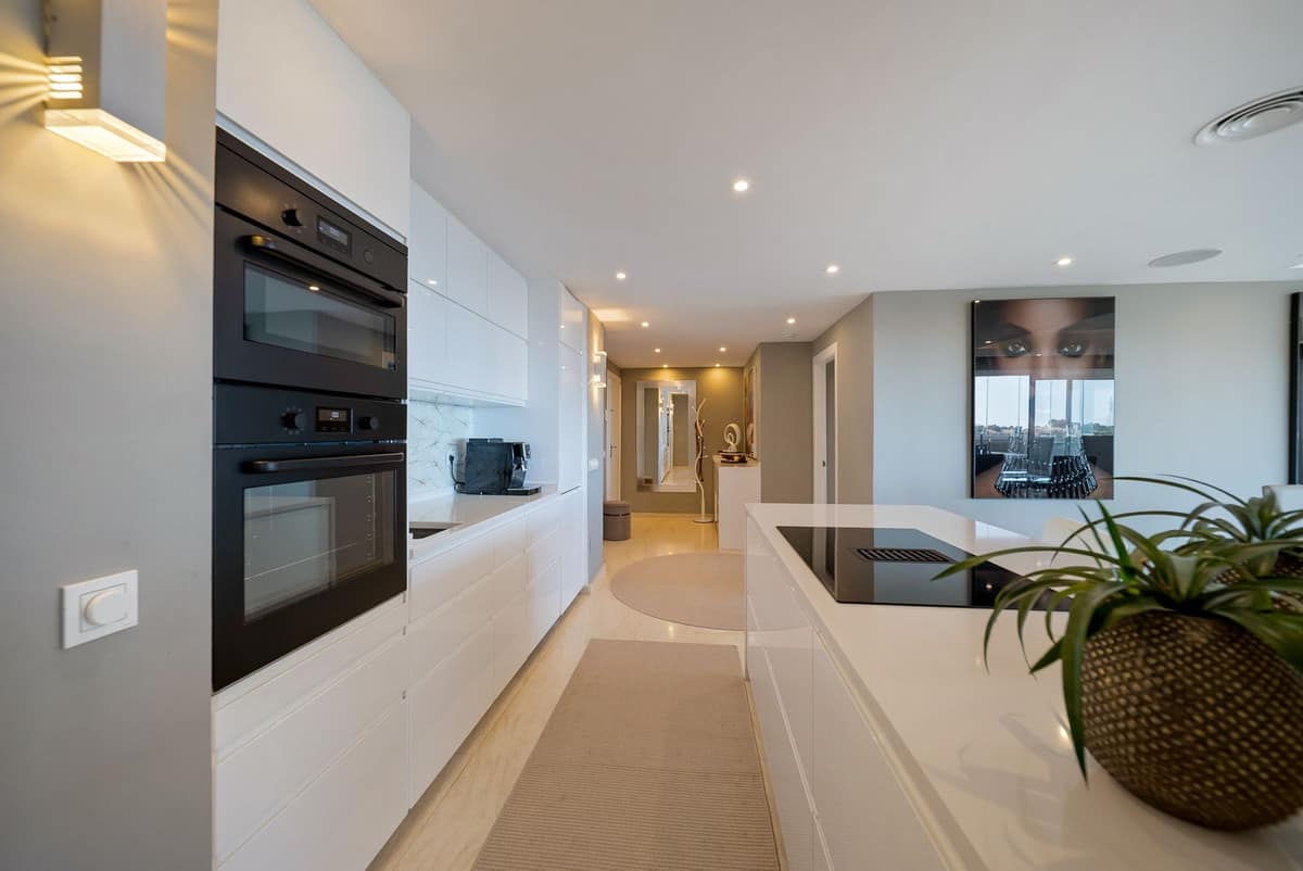 The apartment features a bright, fully equipped open kitchen with integrated high-end appliances. An elegant island bathed in natural light seamlessly connects to the main living area, creating a perfect space for cooking and socializing.