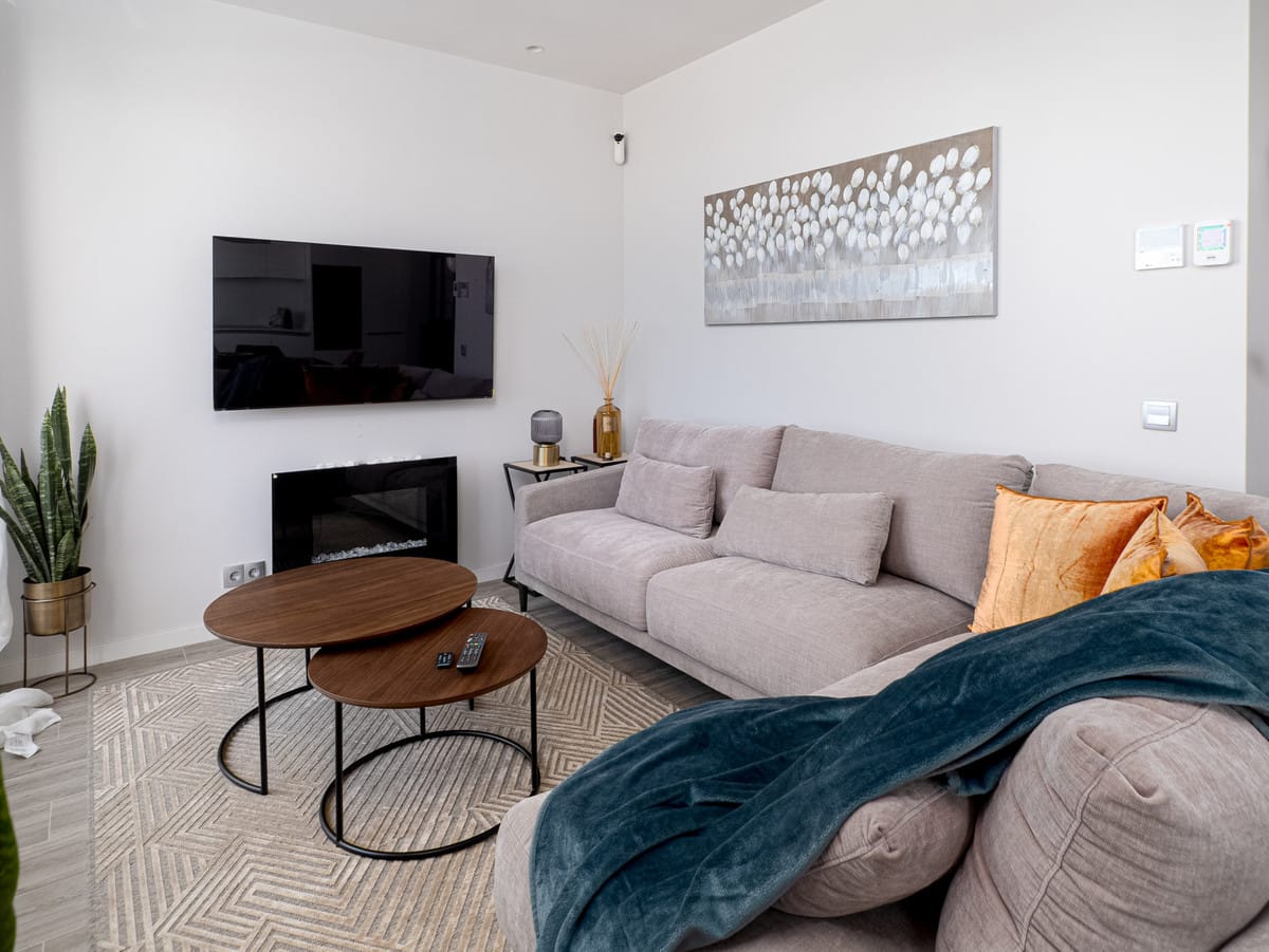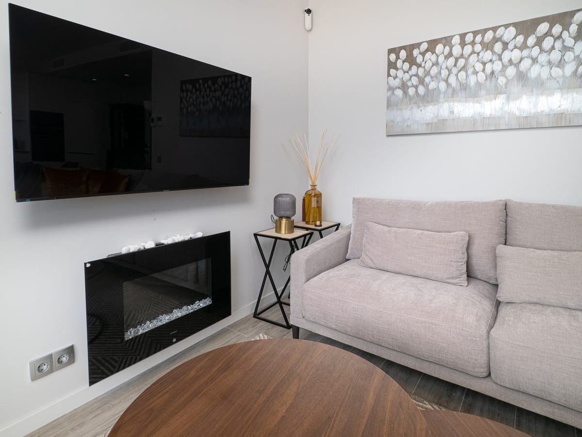 The main living areas are spacious and completely open plan, with a modern, fully fitted kitchen with all appliances and an easily accessible terrace. There are two bedrooms and a bathroom on the lower level of the apartment.