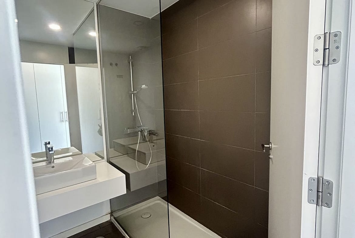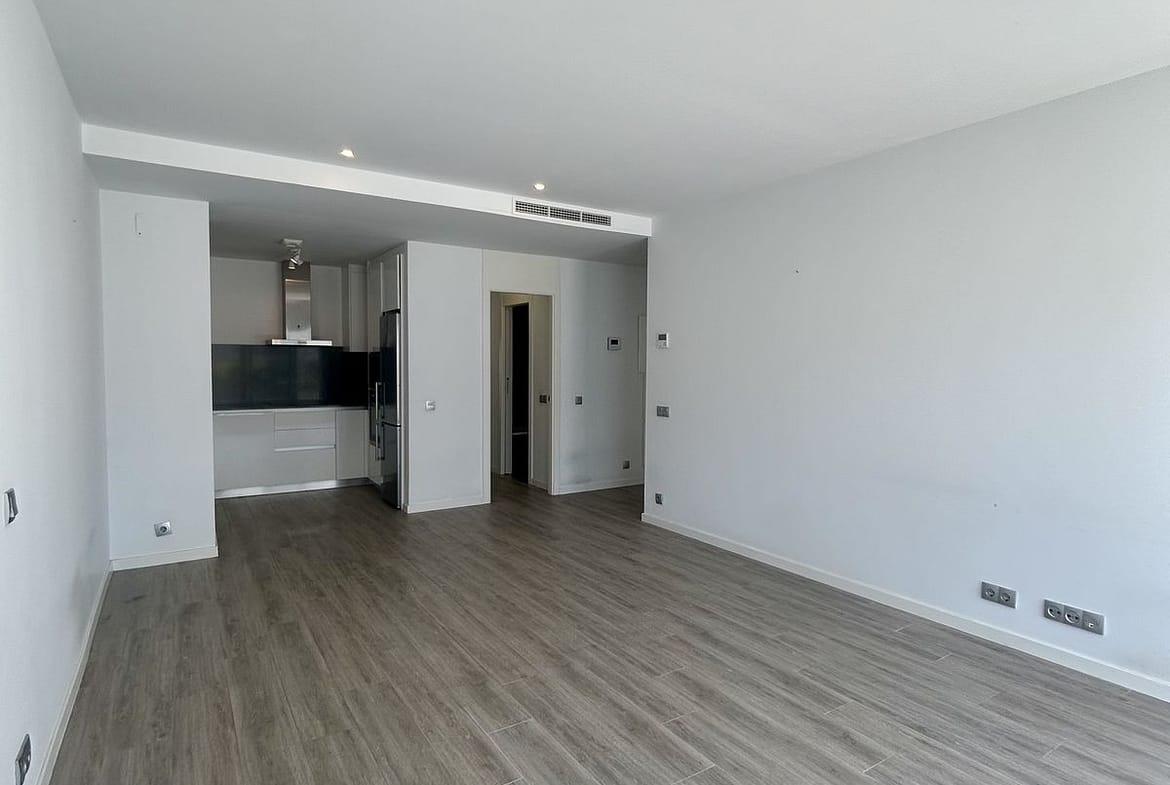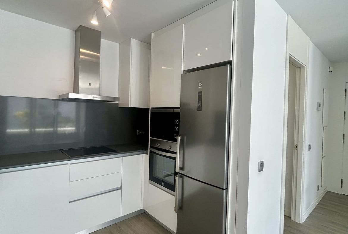 The property features a bright living and dining area with direct access to a private south-facing terrace (23 m²), ideal for enjoying the sun throughout the day. The open-plan kitchen is fully equipped and seamlessly integrated into the living space.