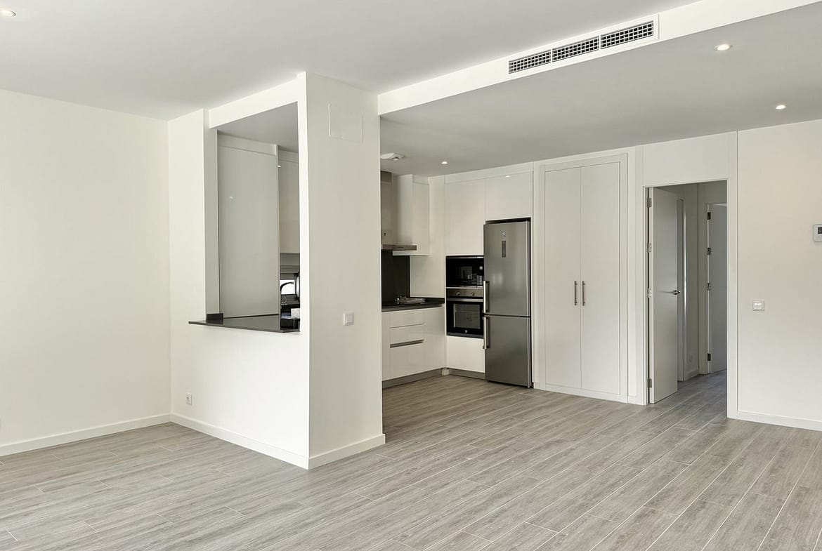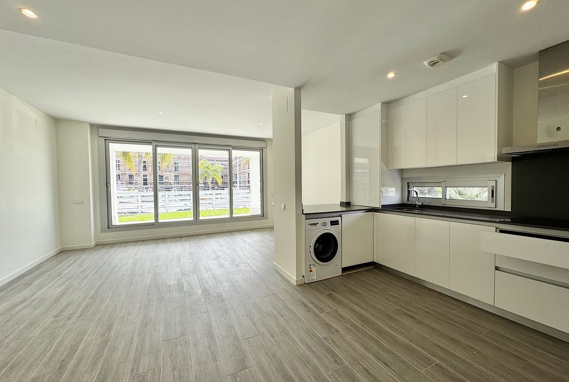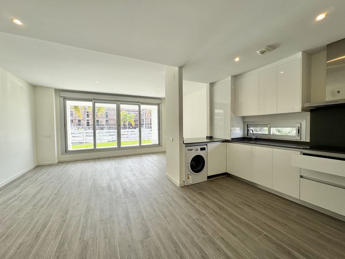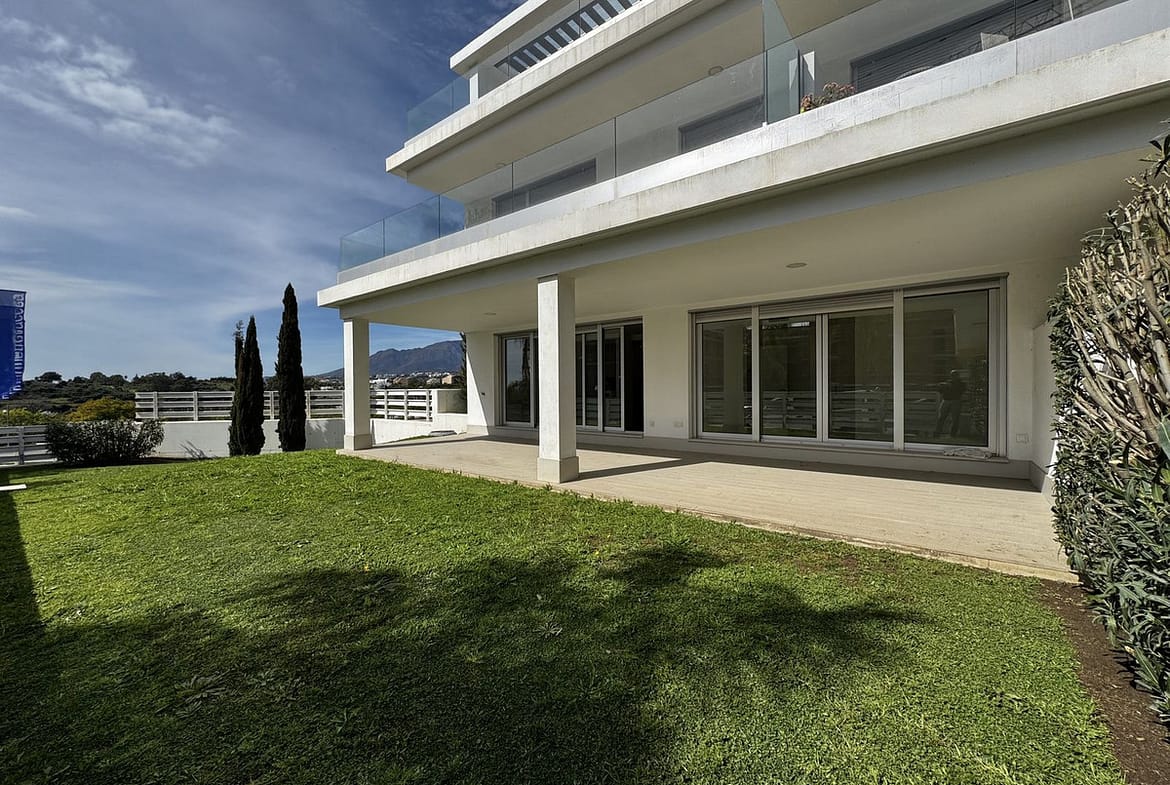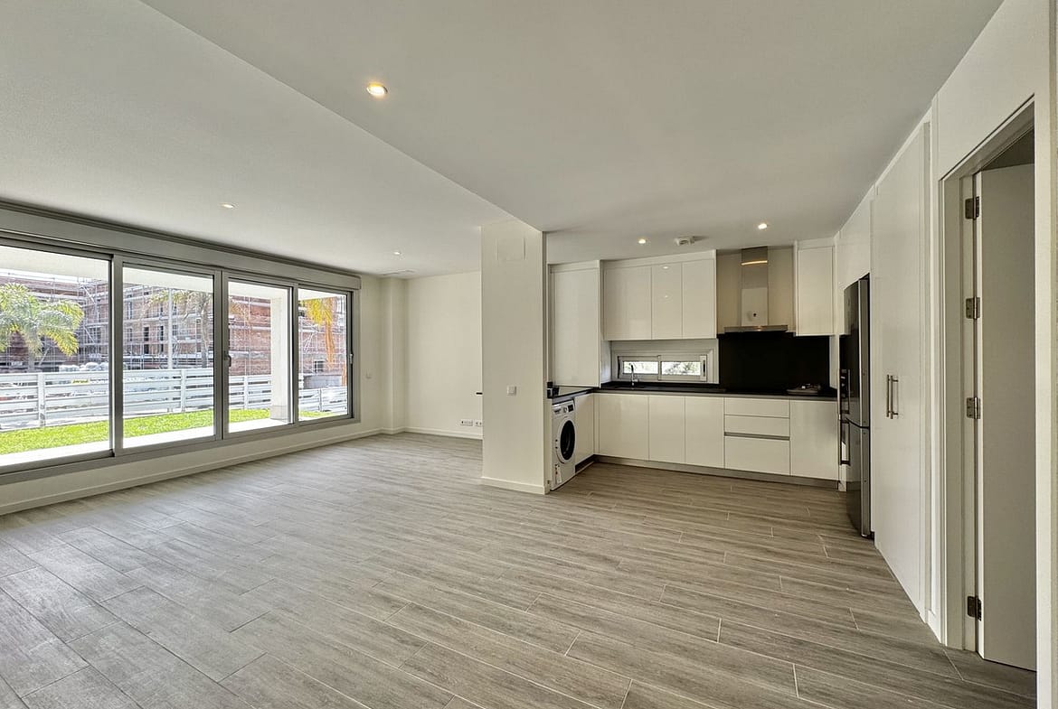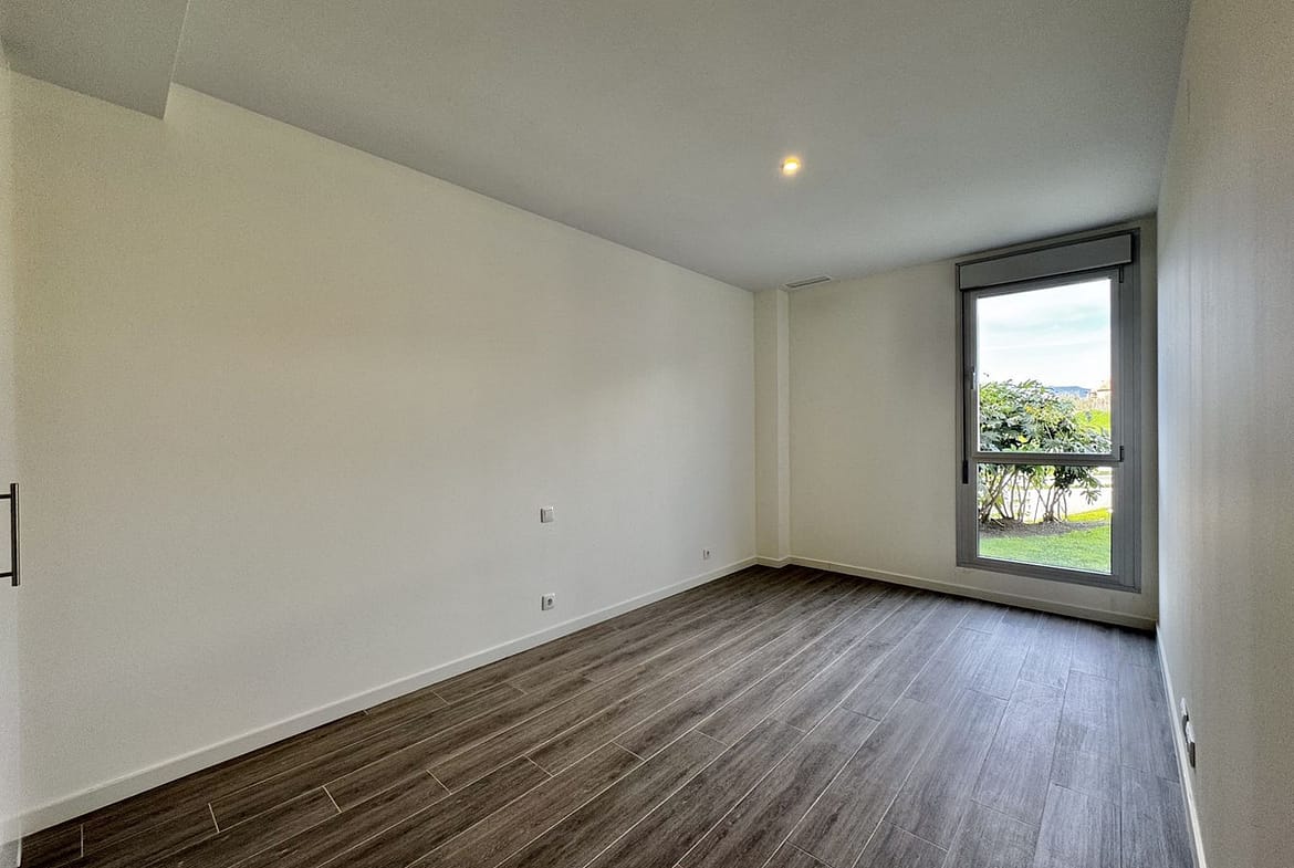 The apartment offers a spacious living-dining area with access to a covered terrace and garden, an open-plan kitchen fully equipped with Bosch appliances, three bedrooms with built-in wardrobes, and two bathrooms finished to high standards. The master bedroom also opens directly onto the garden, while the other two bedrooms enjoy views of green areas.