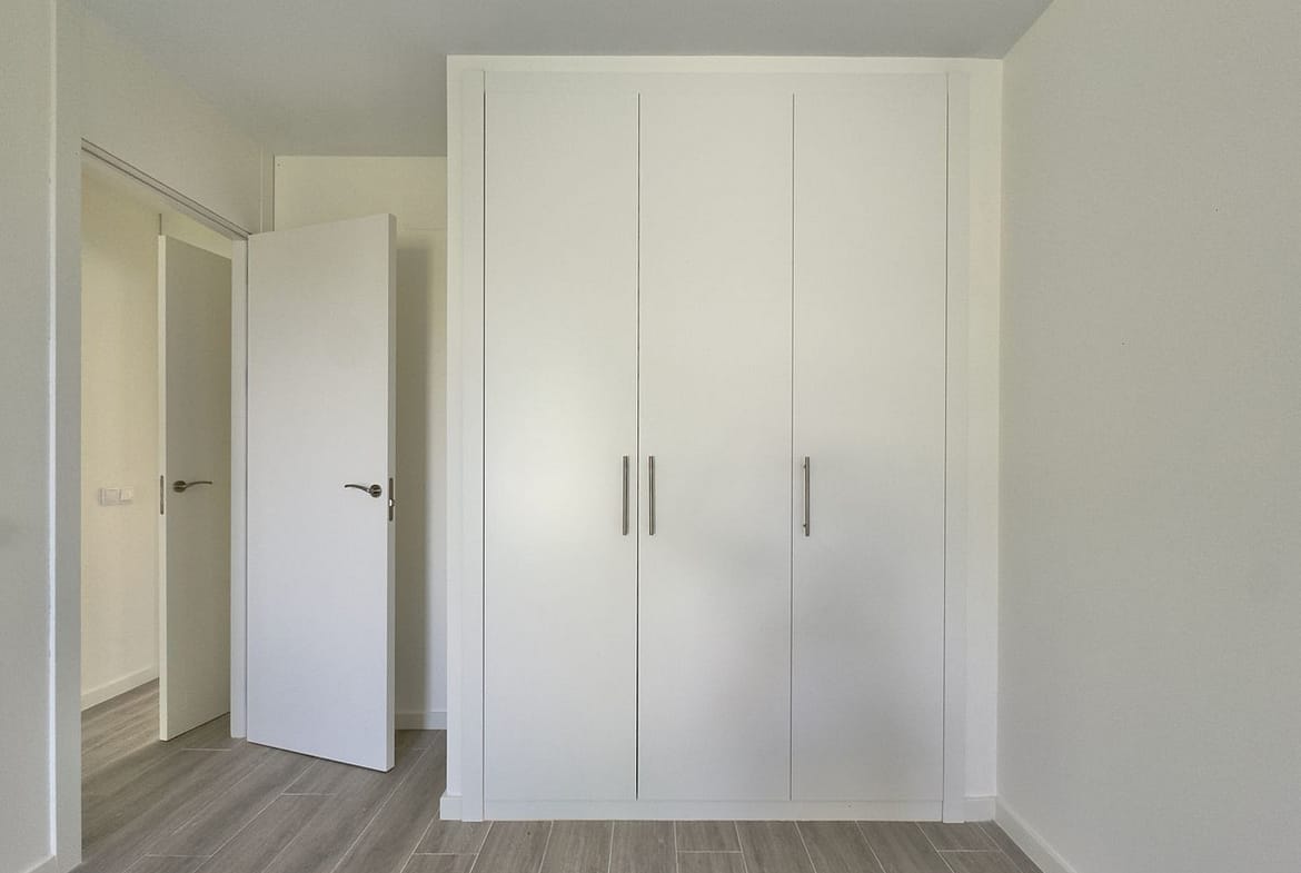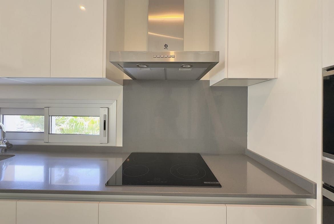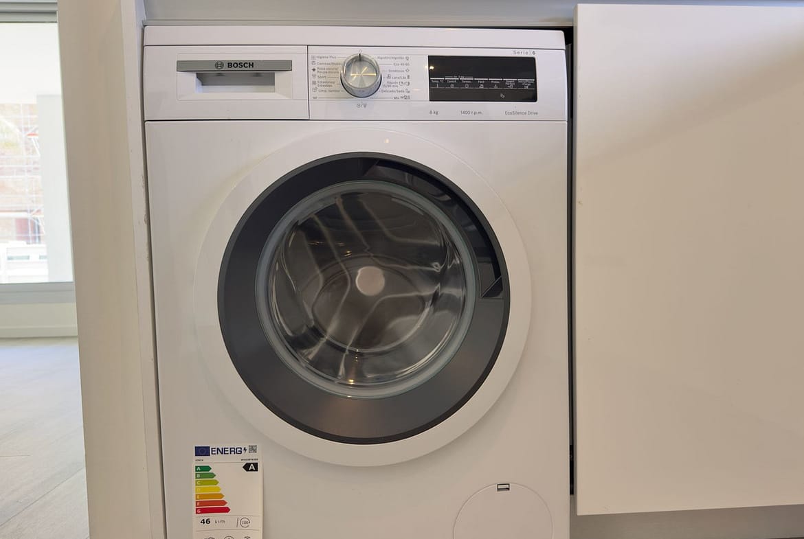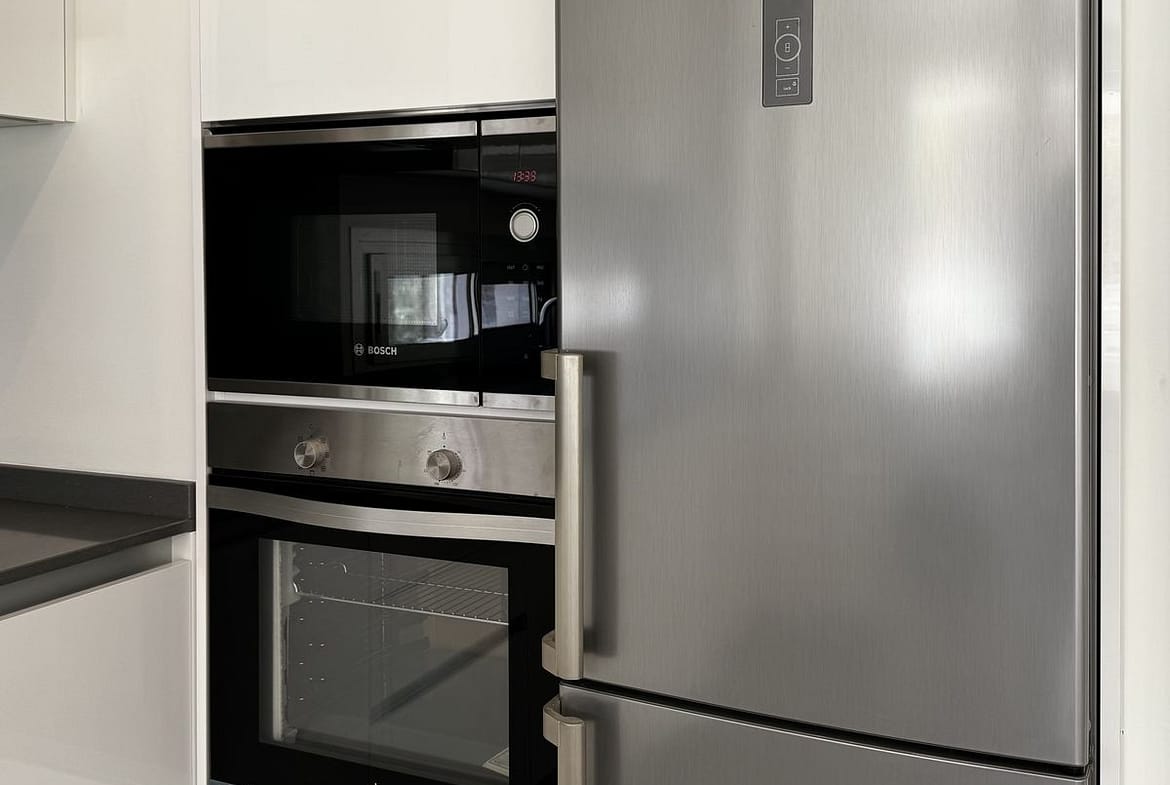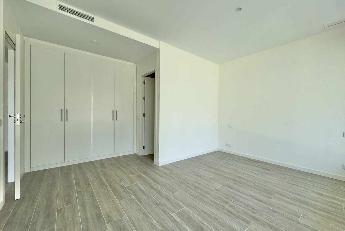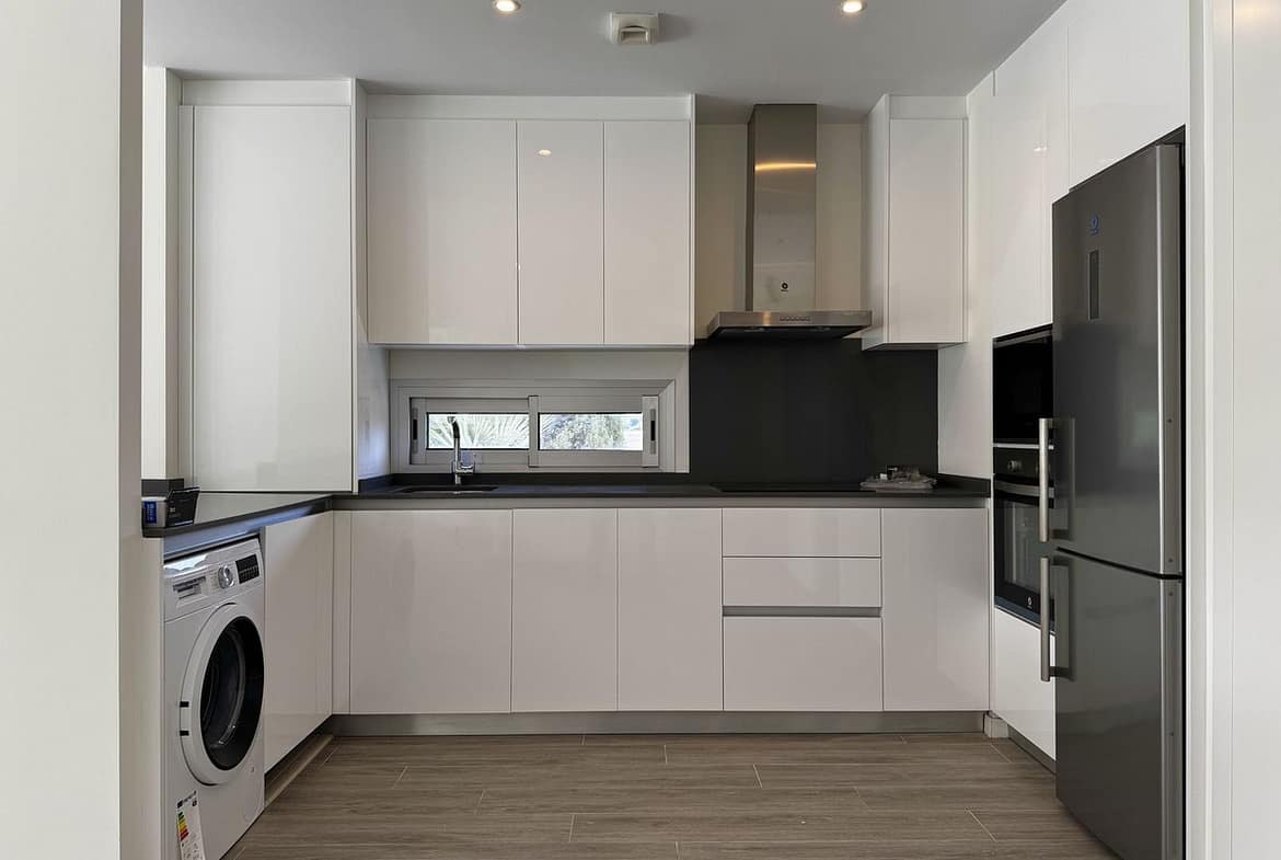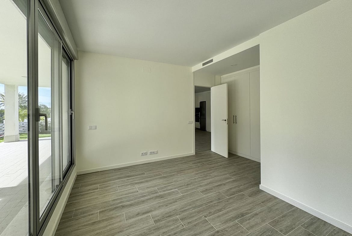 The apartment offers a spacious living-dining area with access to a covered terrace and garden, an open-plan kitchen fully equipped with Bosch appliances, three bedrooms with built-in wardrobes, and two bathrooms finished to high standards. The master bedroom also opens directly onto the garden, while the other two bedrooms enjoy views of green areas.