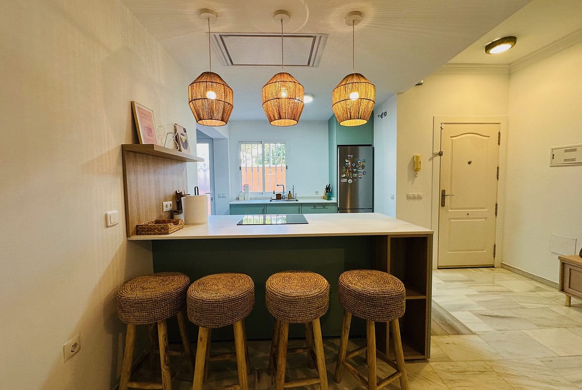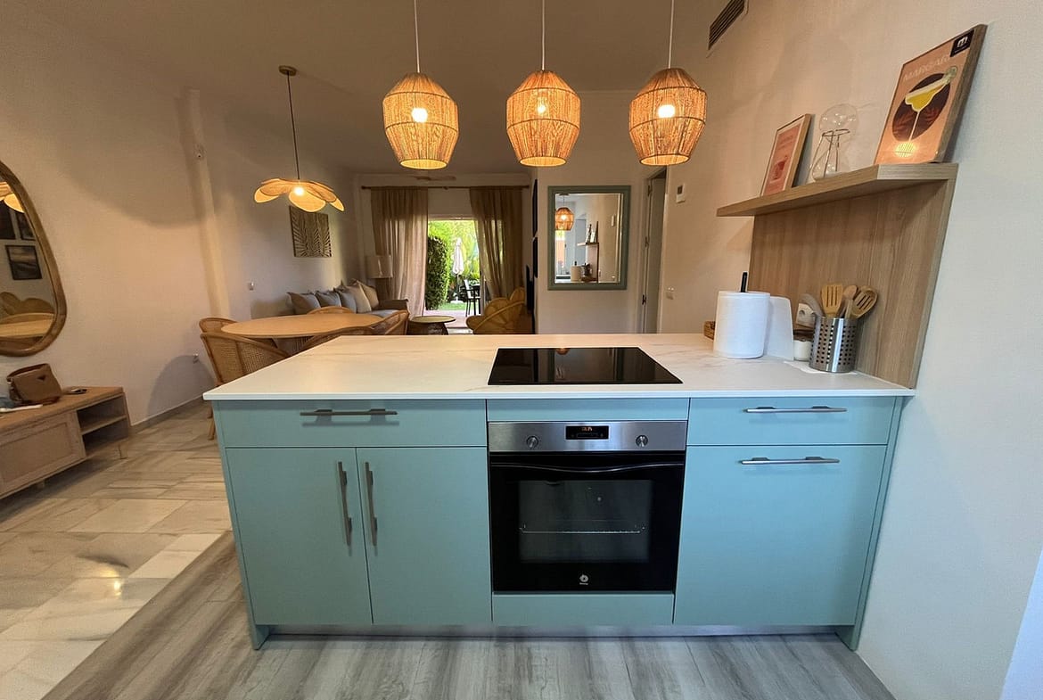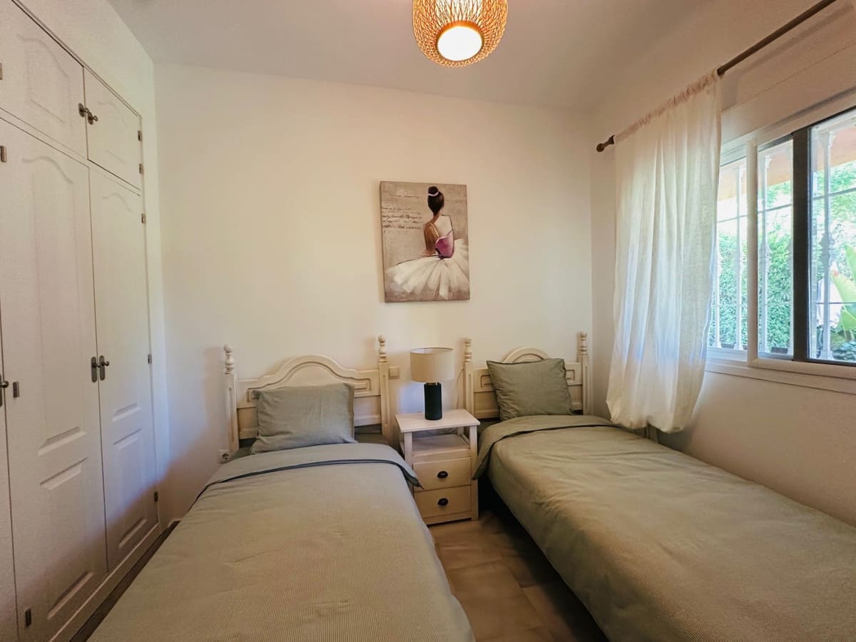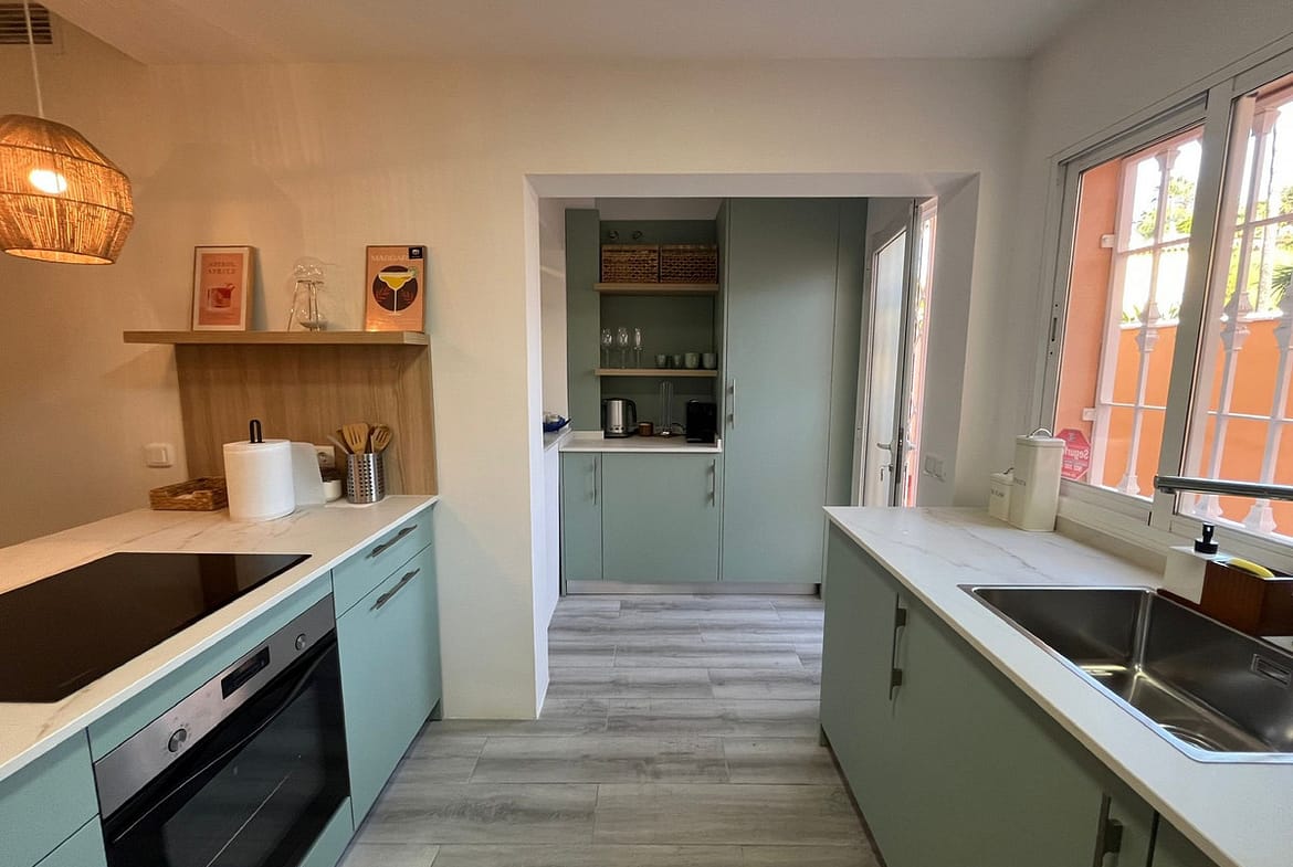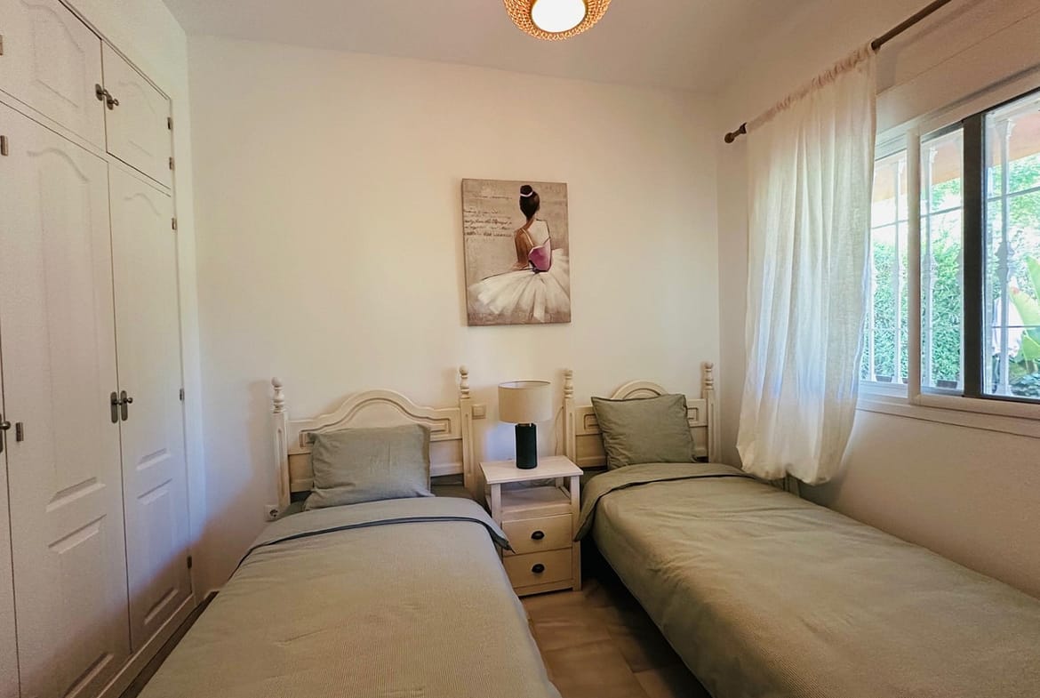 Outside, the property boasts a private garden of approximately 50m² with an automatic irrigation system and direct access to the communal pool, ideal for enjoying the Mediterranean climate. There are 2 terraces: one sunny in the morning and another covered with pleasant views of the garden, perfect for relaxing or enjoying outdoor meals. The community offers an assigned private garage, secure entry, and is surrounded by green areas and children's play zones.