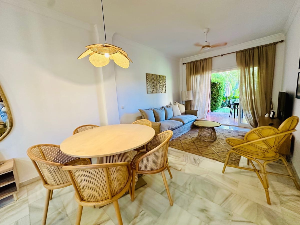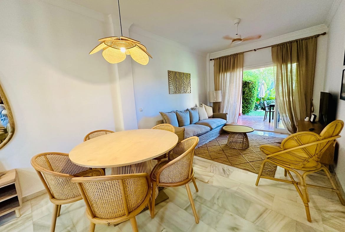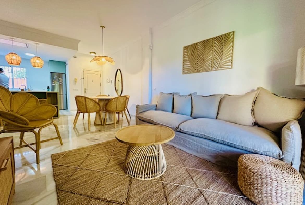 Located on the beach side in the Carib Playa urbanization, East Marbella, this impressive ground floor apartment offers an extraordinary combination of comfort, modern style, and proximity to the sea. Featuring 3 bedrooms, 2 bathrooms, 120m2 built, plus 70m2 of terraces and a private garden of 50m2, with direct access to the communal garden and pool. Situated in a gated community just a few steps from the beach, it benefits from a privileged location, with all the necessary amenities for a comfortable and relaxed lifestyle on the Costa del Sol.