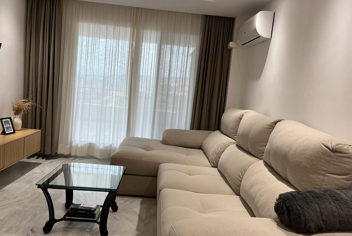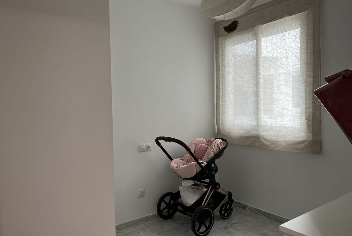 The apartment is finished to a high standard, featuring marble floors, double glazing, and large windows that fill the home with natural light. The bright living room opens onto a spacious, sunny terrace, ideal for relaxing or enjoying long, warm evenings with views of the green surroundings.