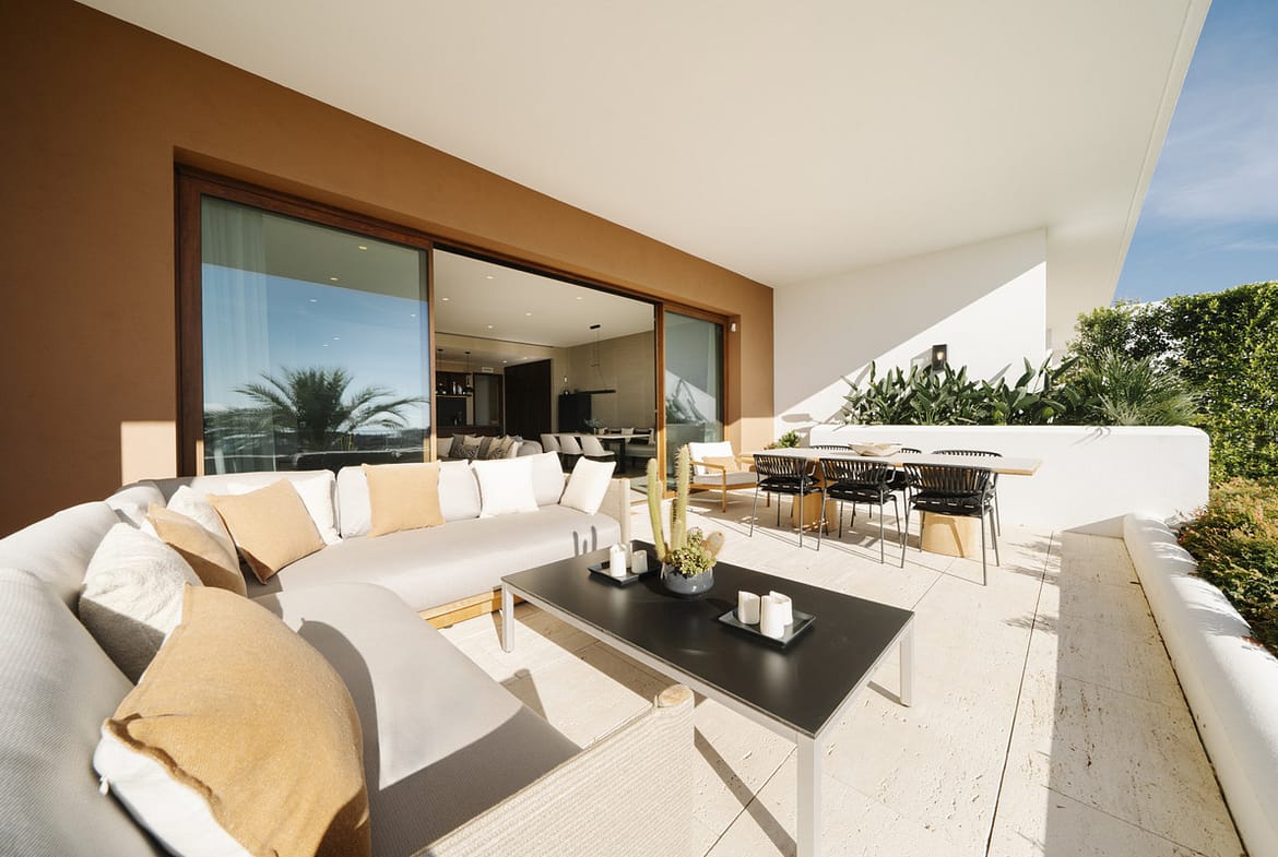 The spacious living area flows seamlessly onto a large terrace, where shaded sections, a dining area, and a comfortable chill-out zone provide breathtaking views of the sea and the golf course.