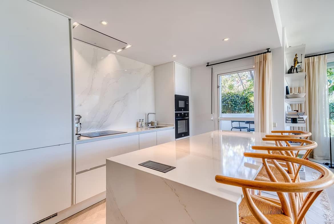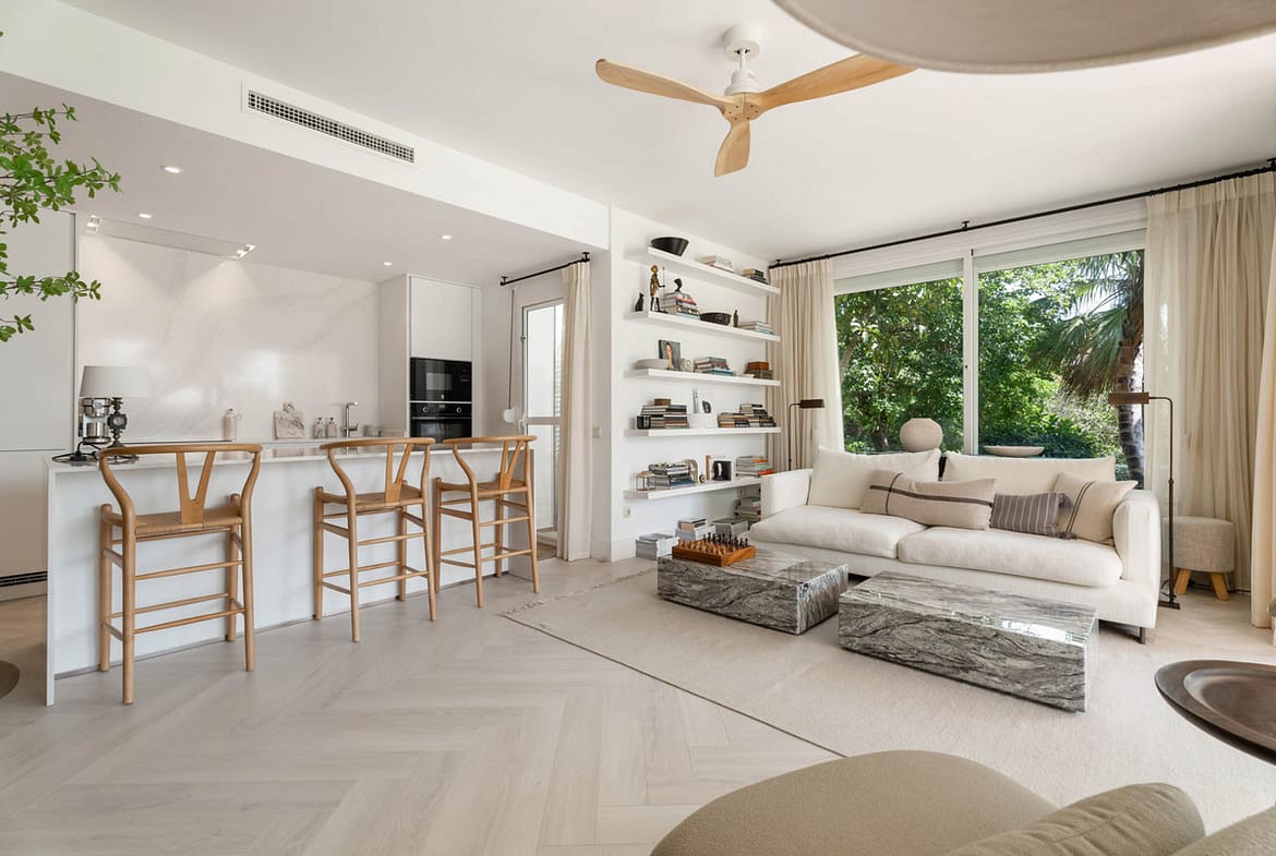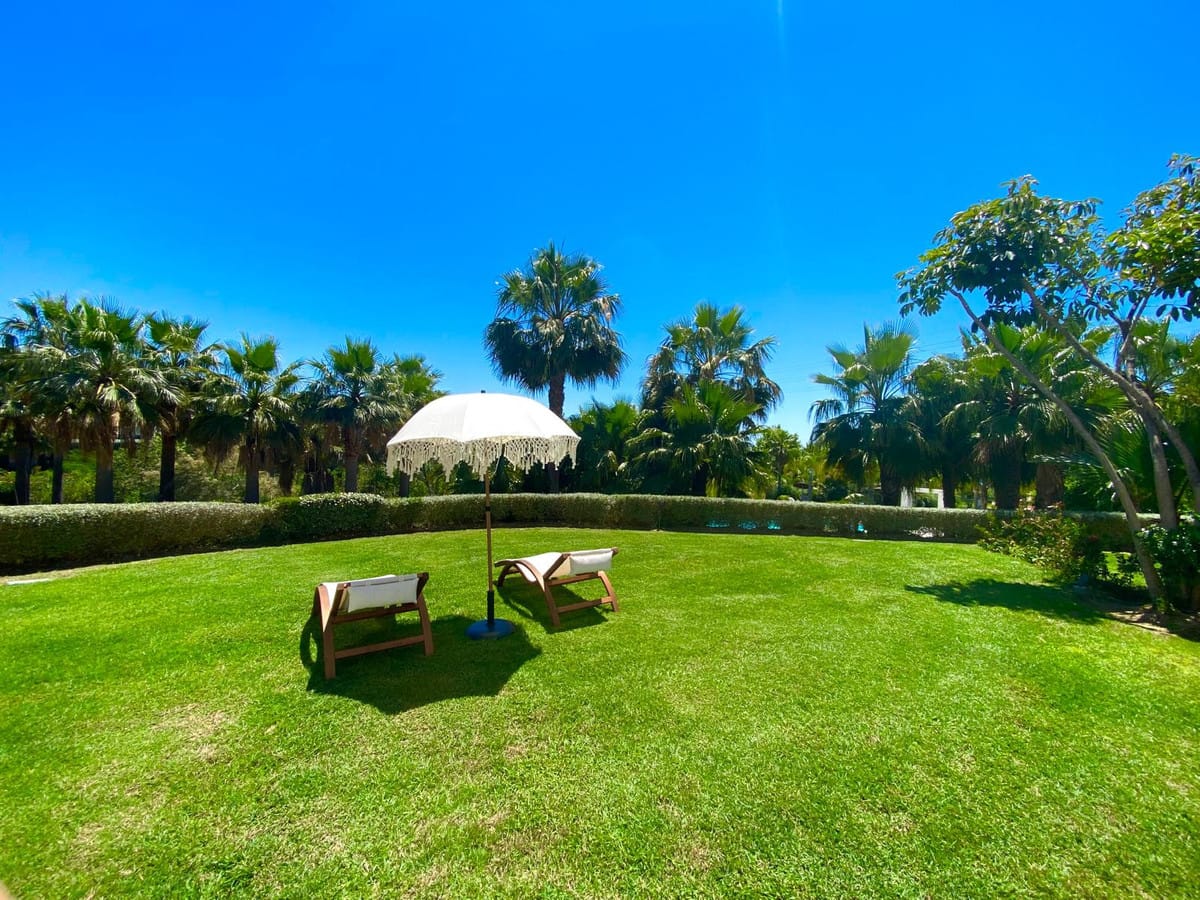 The apartment features a bright and spacious living-dining area opening directly onto the expansive garden, ideal for outdoor living and enjoying the Mediterranean climate. It offers three well-proportioned bedrooms and two bathrooms, with built-in wardrobes and air conditioning, ensuring year-round comfort.
