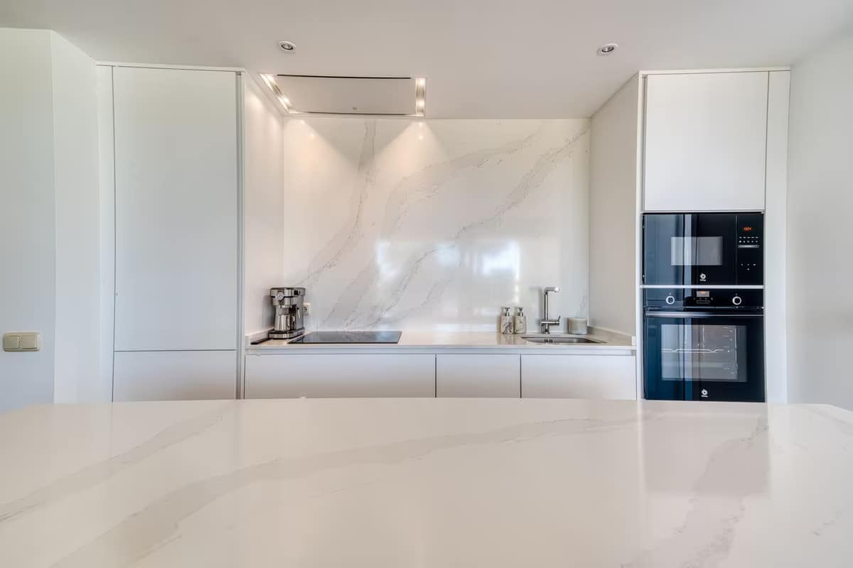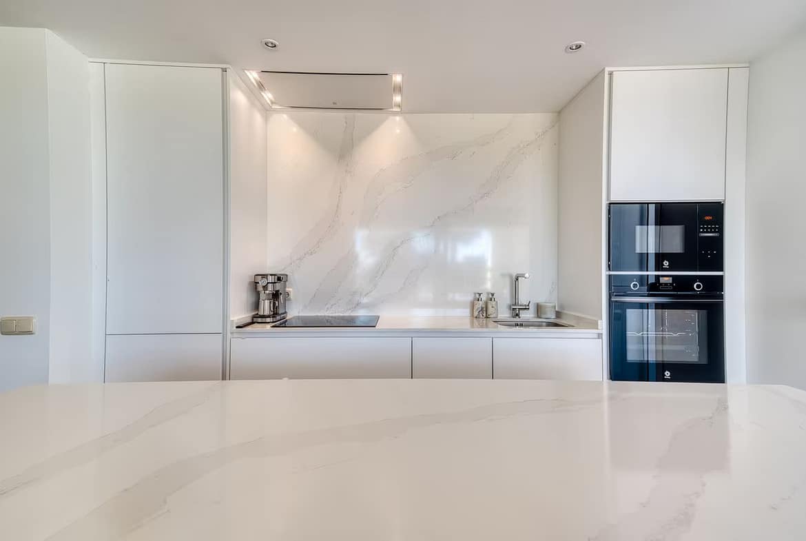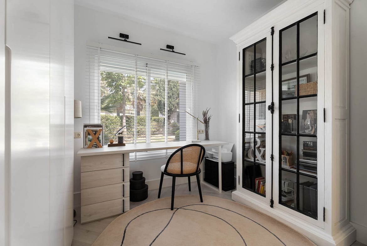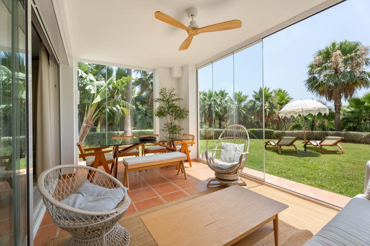 The apartment features a bright and spacious living-dining area opening directly onto the expansive garden, ideal for outdoor living and enjoying the Mediterranean climate. It offers three well-proportioned bedrooms and two bathrooms, with built-in wardrobes and air conditioning, ensuring year-round comfort.