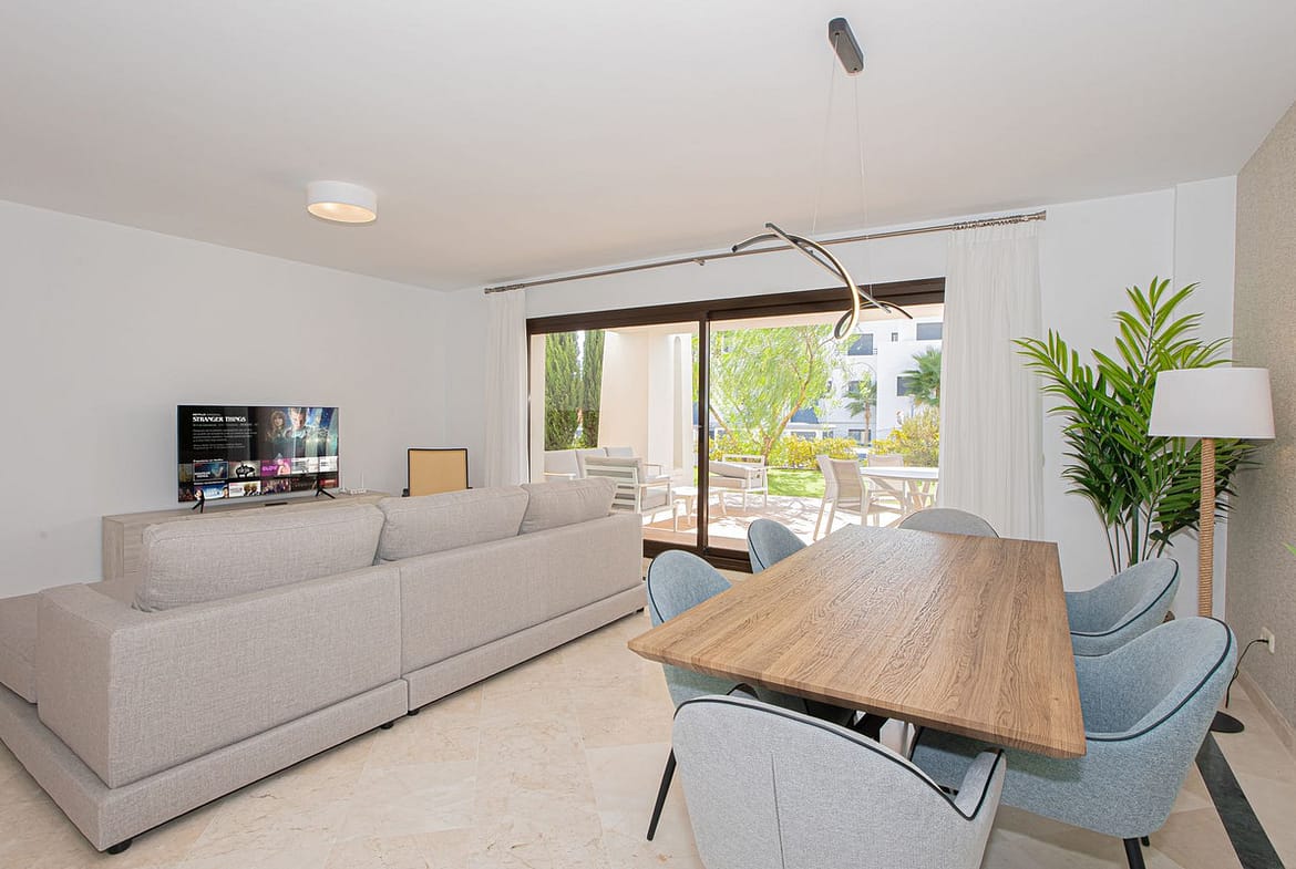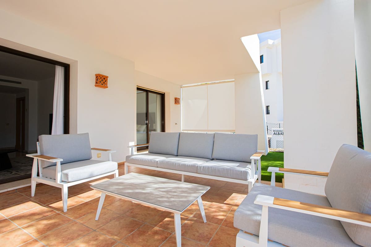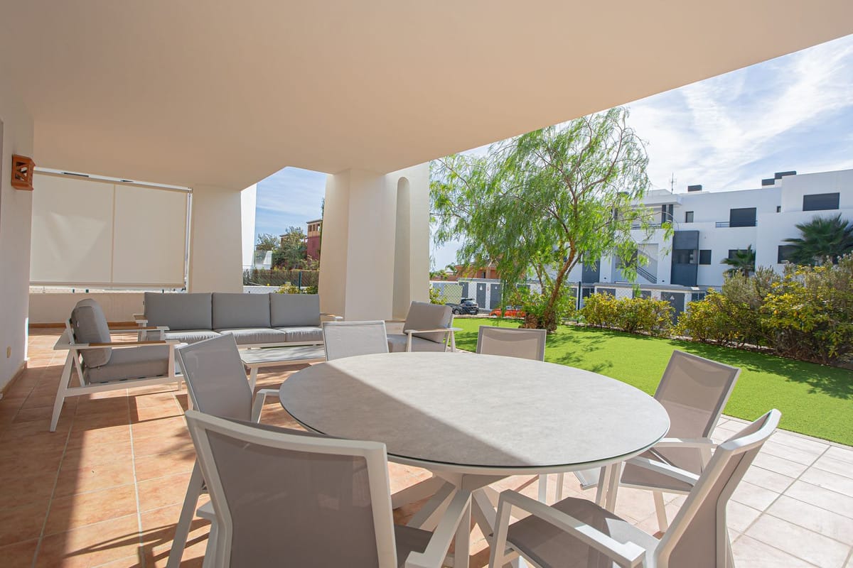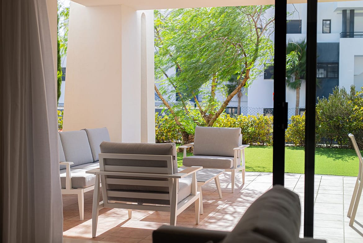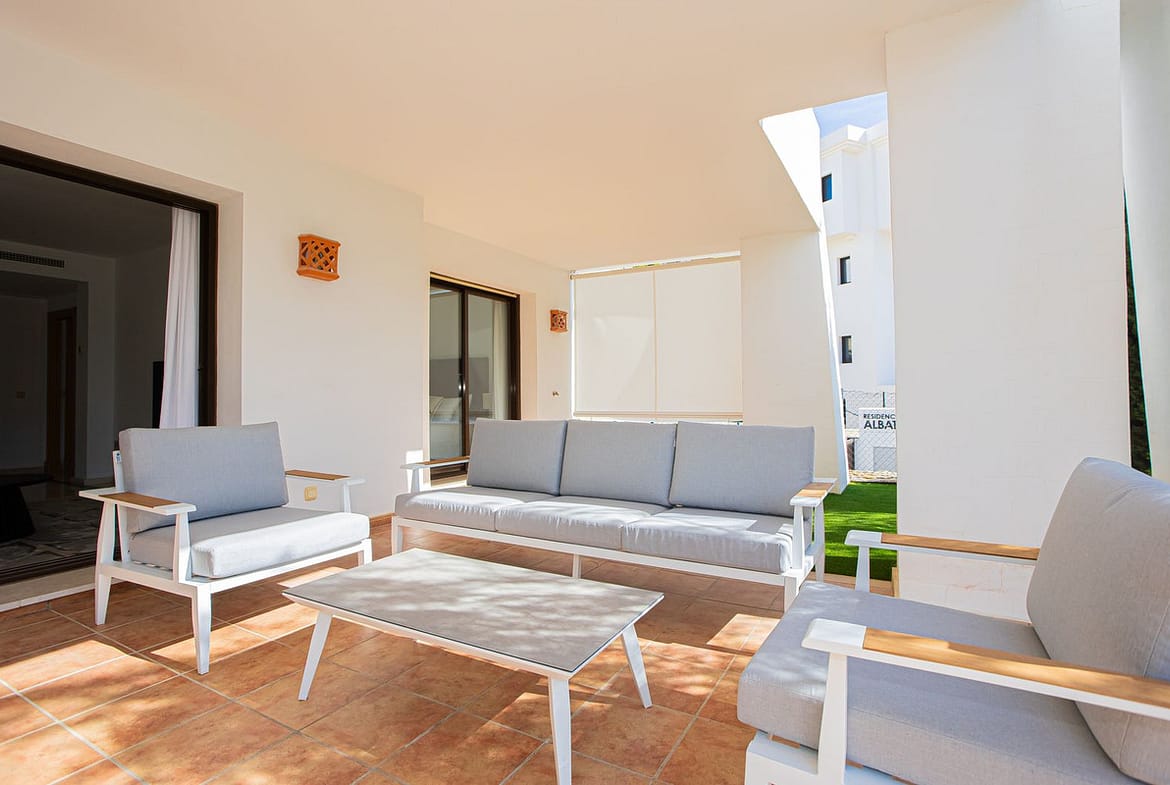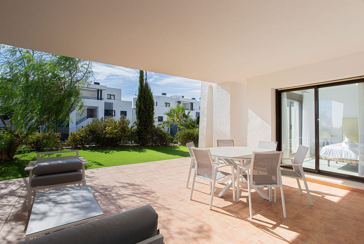 Quality ground floor 3 bedroom, 3 bathroom apartment with large outdoor covered terrace and garden – with Astro-Turf for easy maintenance.